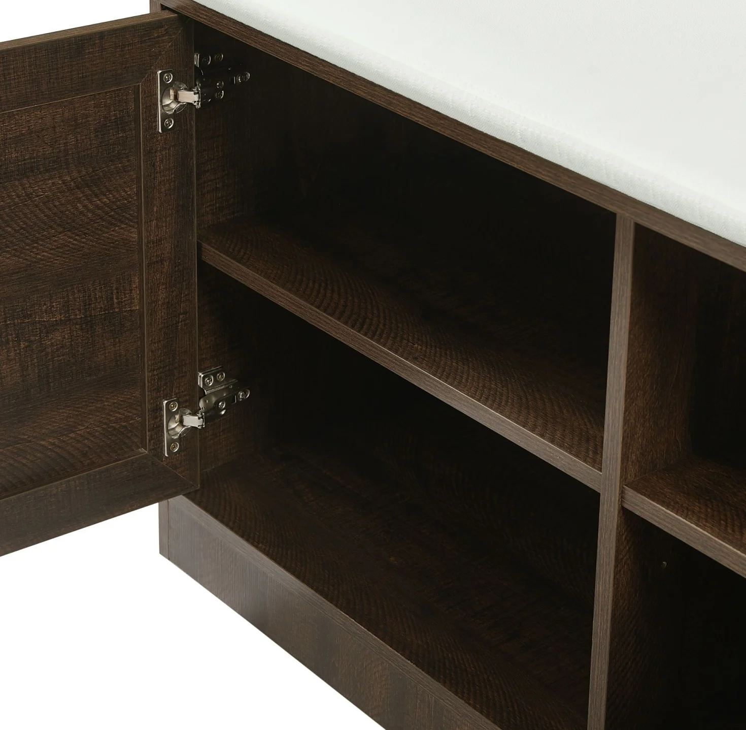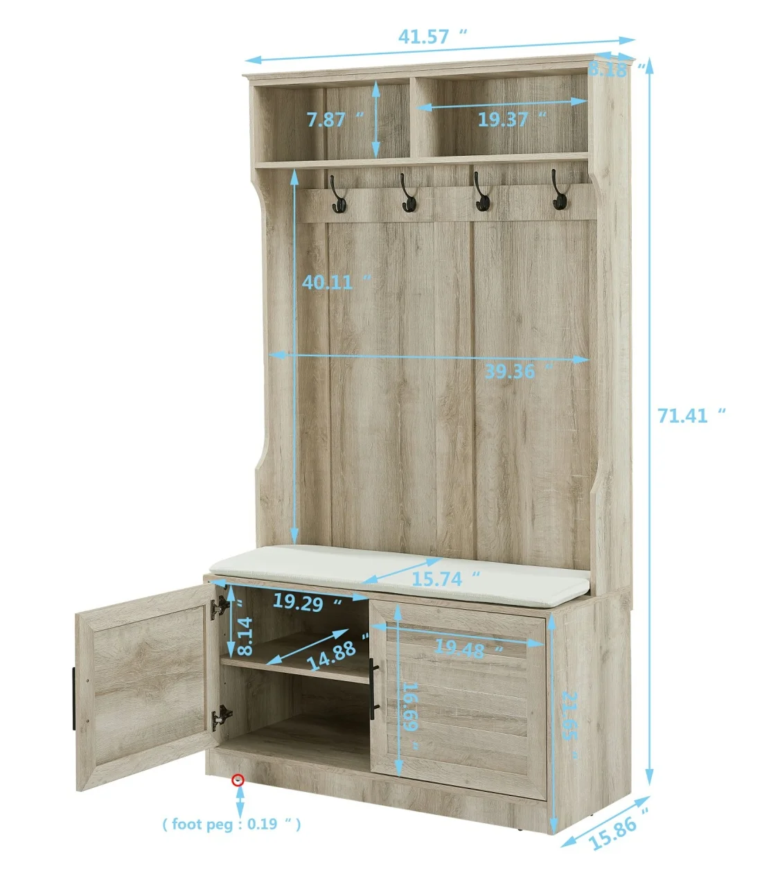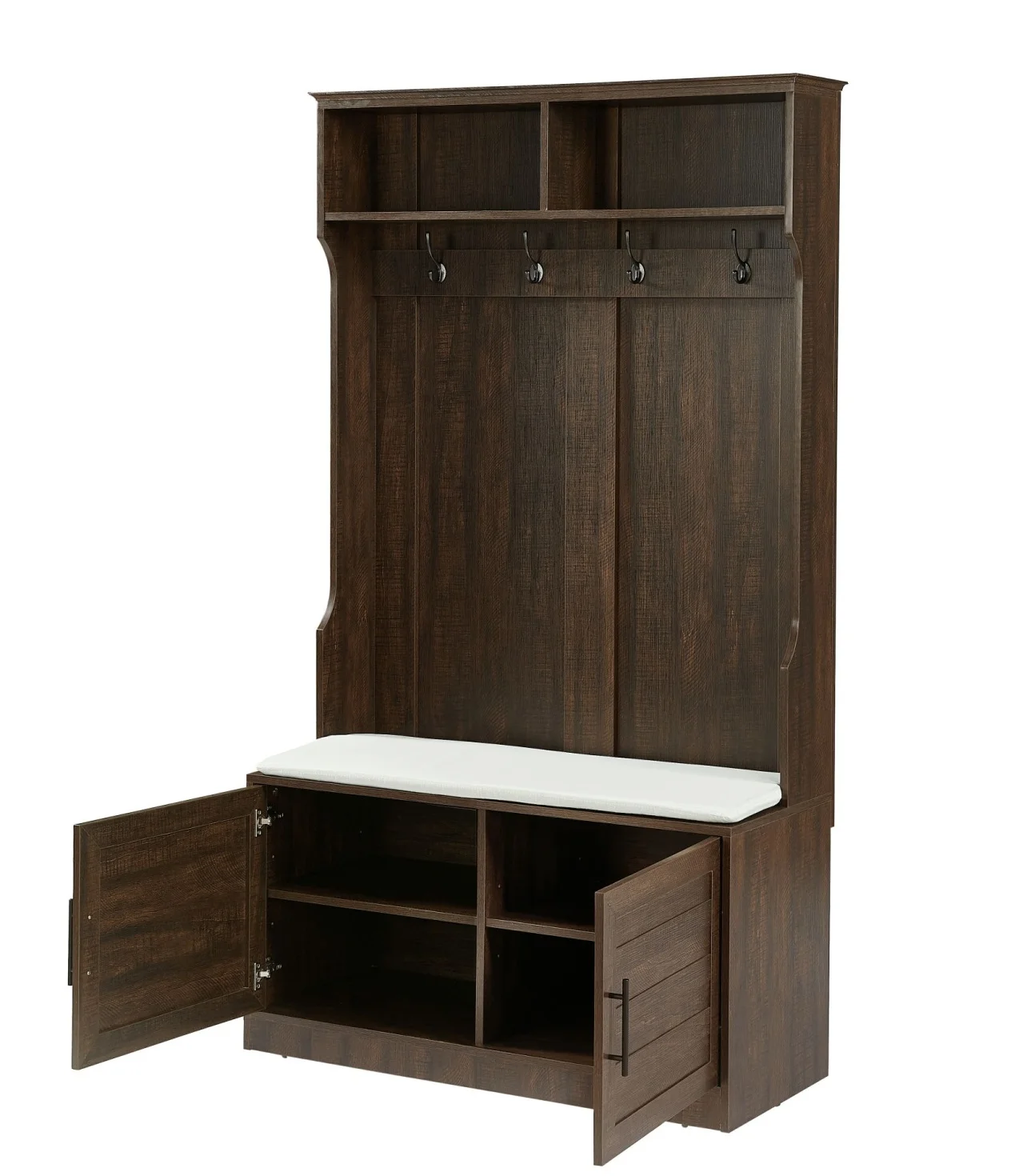 - [Versatile Storage Options]: The storage bench comes with a comfortable sponge pad, allowing you to sit down and put on or take off your shoes with ease. The 2-door cabinet provides hidden storage for items you want to keep out of sight, while the coat rack with 4 dual hooks offers a convenient place to hang coats, hats, scarves, and more.