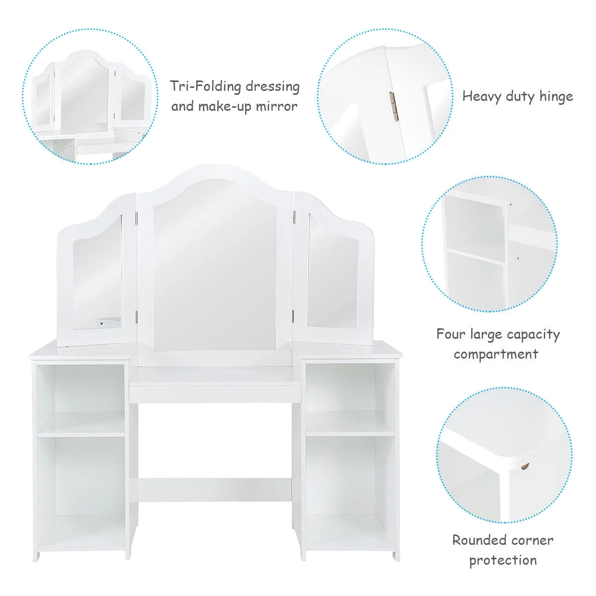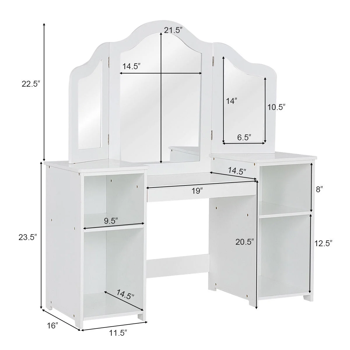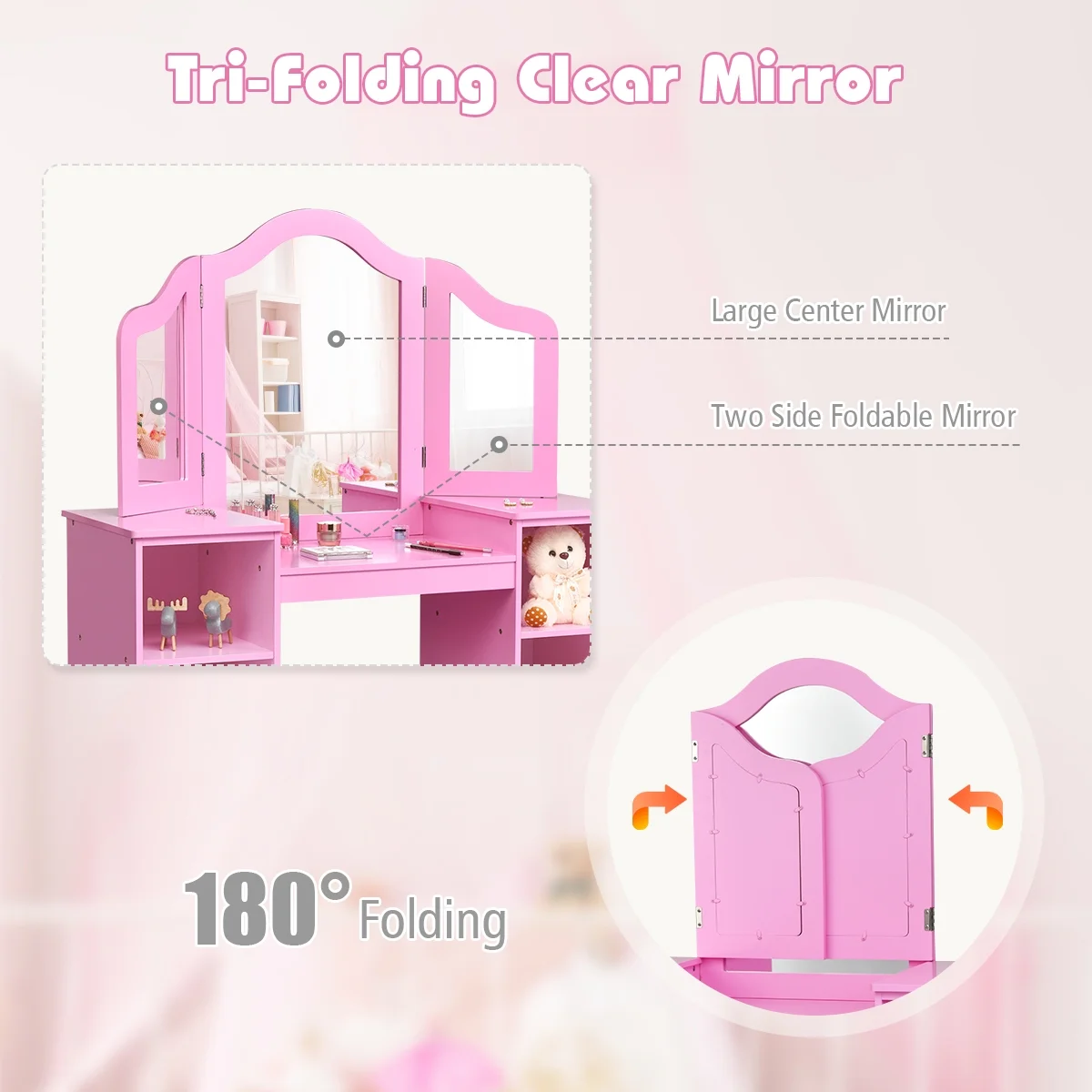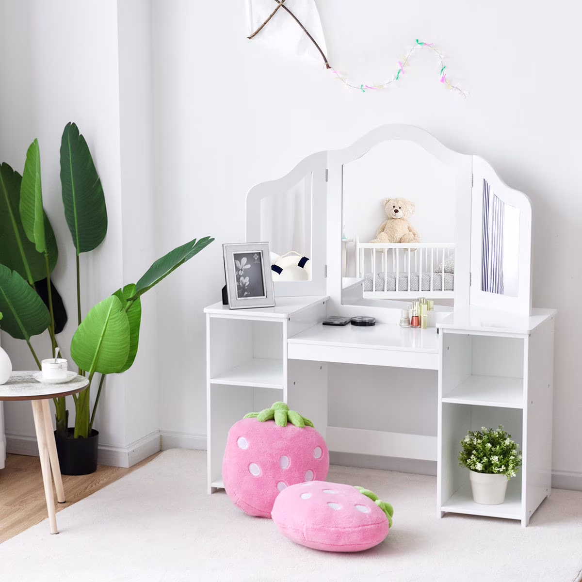 - Three-panel Mirrors �C The most ingenious idea is the 180�� folding mirrors design that creates a better reflection and is able to show your kids all sides of themselves. When the kids sit in front of the vanity, they can have a perfect look from all angles
