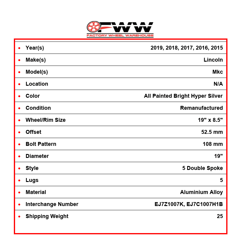 This Factory OEM LINCOLN Aluminium Alloy 5 DOUBLE SPOKE wheel comes stock on 2019, 2018, 2017, 2016, 2015 LINCOLN MKC. The OEM part number(s) for the rim are 560-10020, . This is a 5 lug wheel with a 19 inch diameter, width of 8.5 inch and an offset of 52.5 mm. The finish on the wheel is ALL PAINTED BRIGHT HYPER SILVER.
