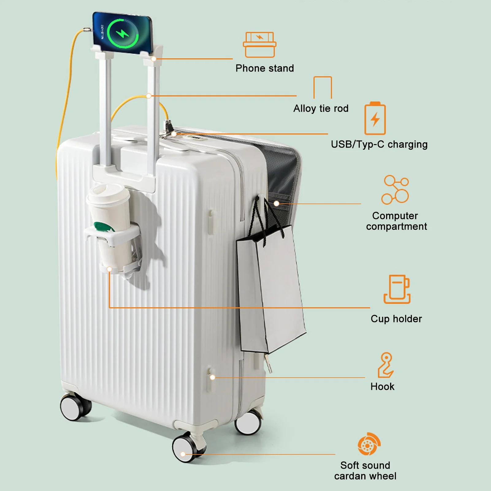 - Multifunctional Holder Design: Especially designed hidden water cup holder, phone holder located in top of luggage, and the handle hook, all is to provide a comfortable and convenient travel experience.