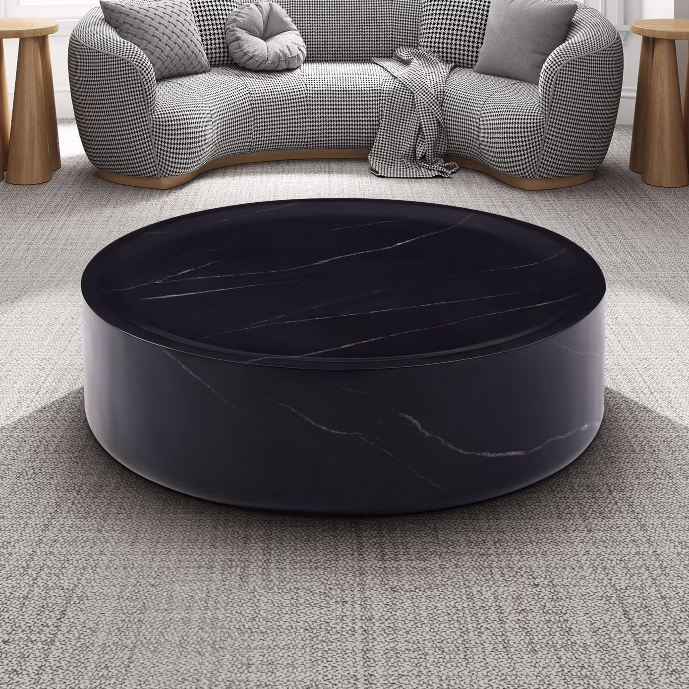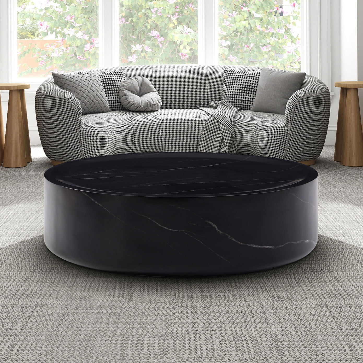 This round coffee table is a modern, simple yet tasteful piece of furniture that can add an elegant ambiance to the environment, whether it is placed in the living room or outdoor space. Made of fiberglass, it is lightweight and durable and can be used without assembly, making it extremely convenient for users. With marble texture on the surface, the unique texture and veins make the coffee table look more upscale and exquisite. The low-drum design makes the coffee table more ergonomic, which is not only stable and safe, but also allows users to enjoy the experience more comfortably and naturally. In addition, the fiberglass material is easy to clean and take care of, just a simple wipe to keep clean, bringing more convenience for home life.