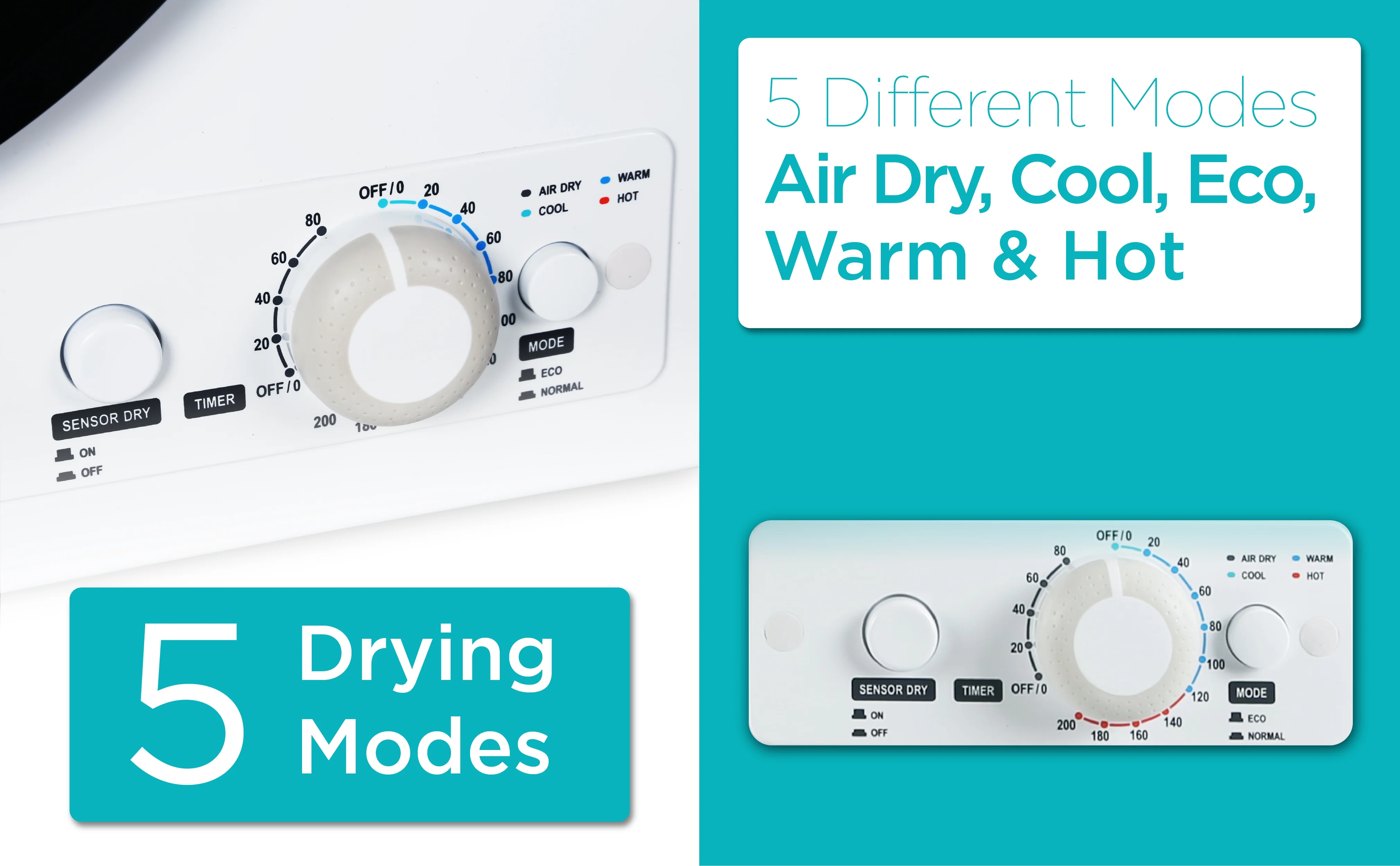 - CHOOSE YOUR MODE: Pick from different drying modes to best suit your needs: Air Dry, Cool, Warm & Hot. This vented clothes dryer possesses 1500W of drying power as well as overheat protection.