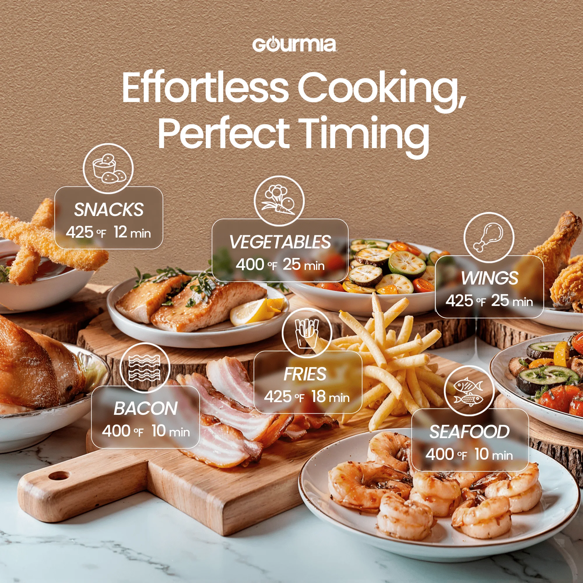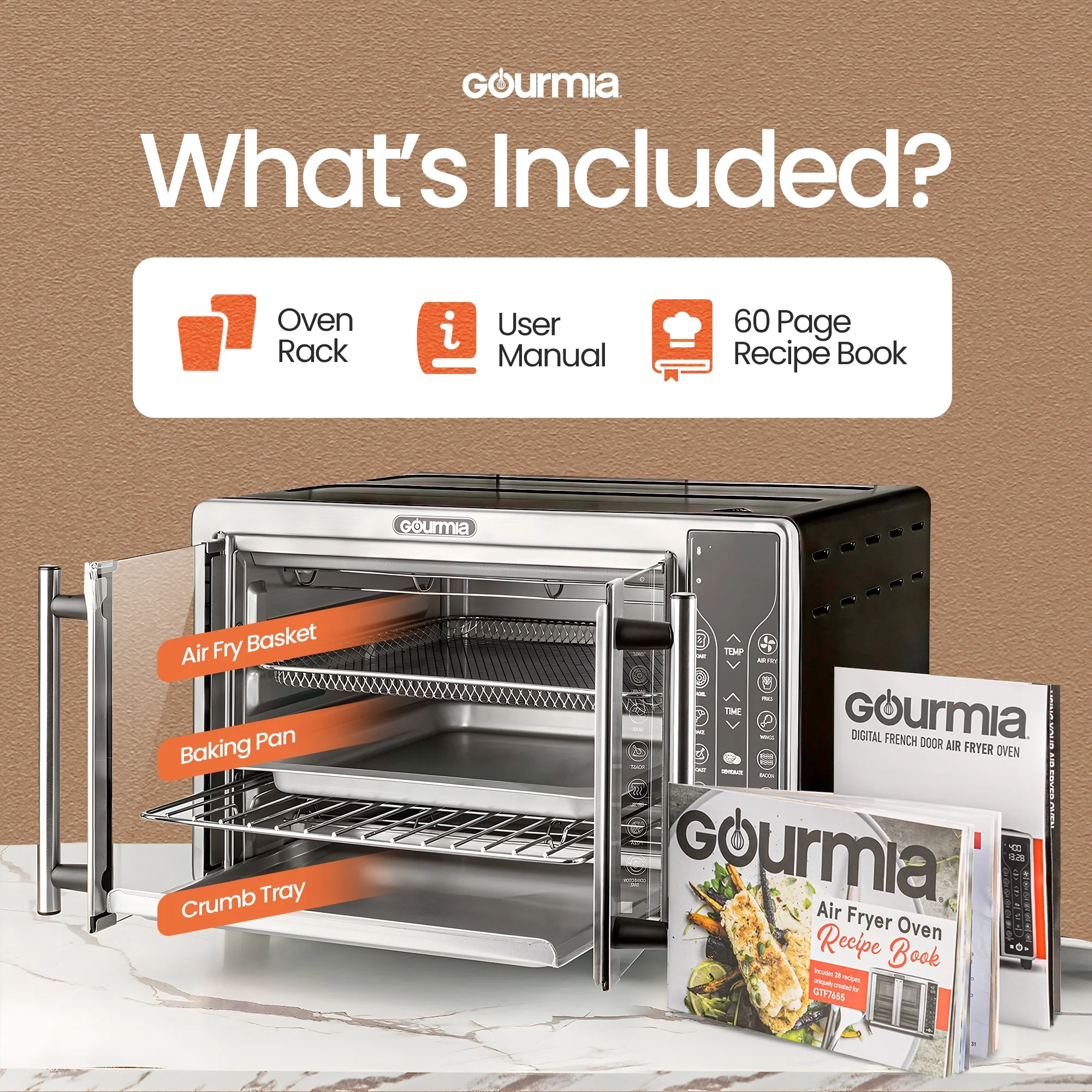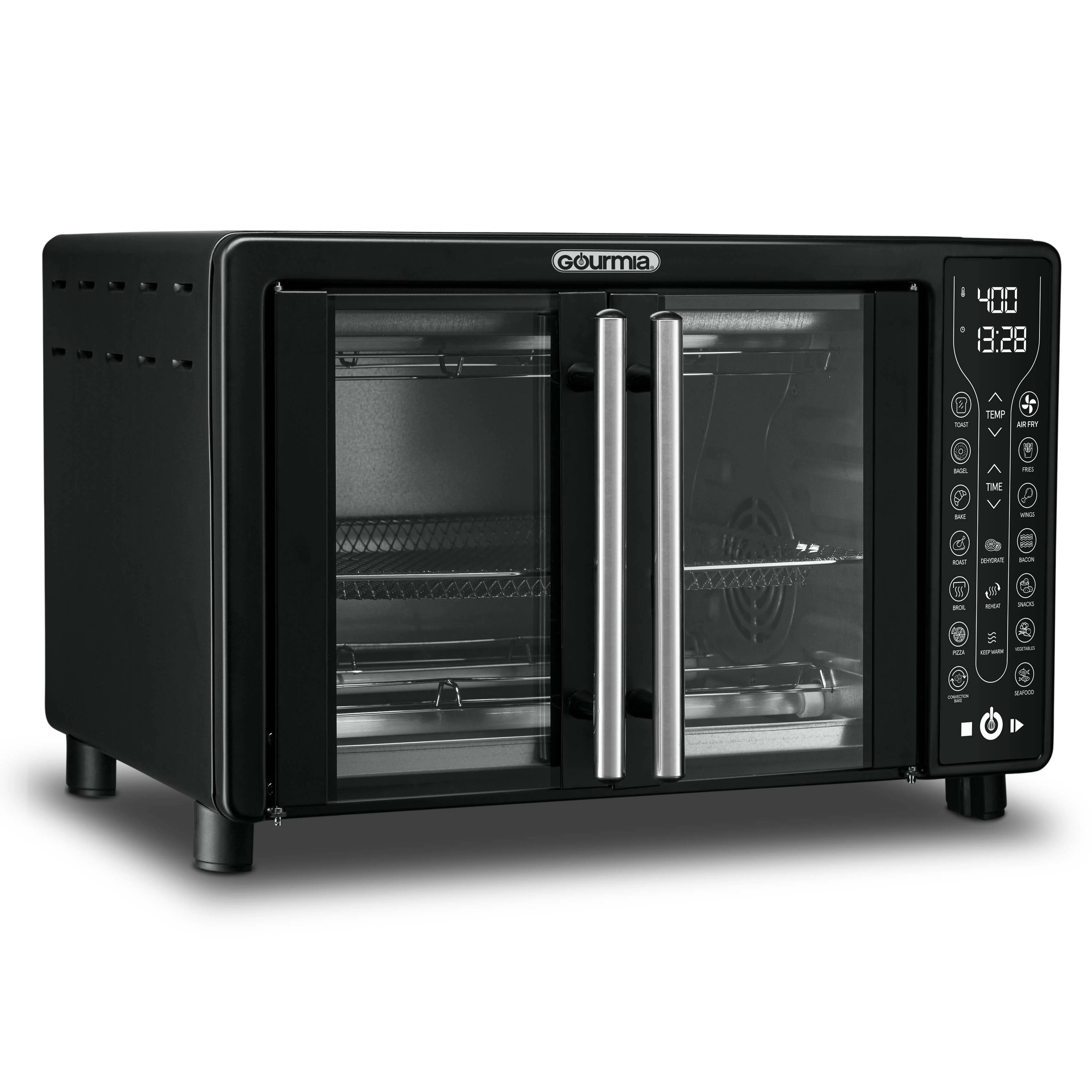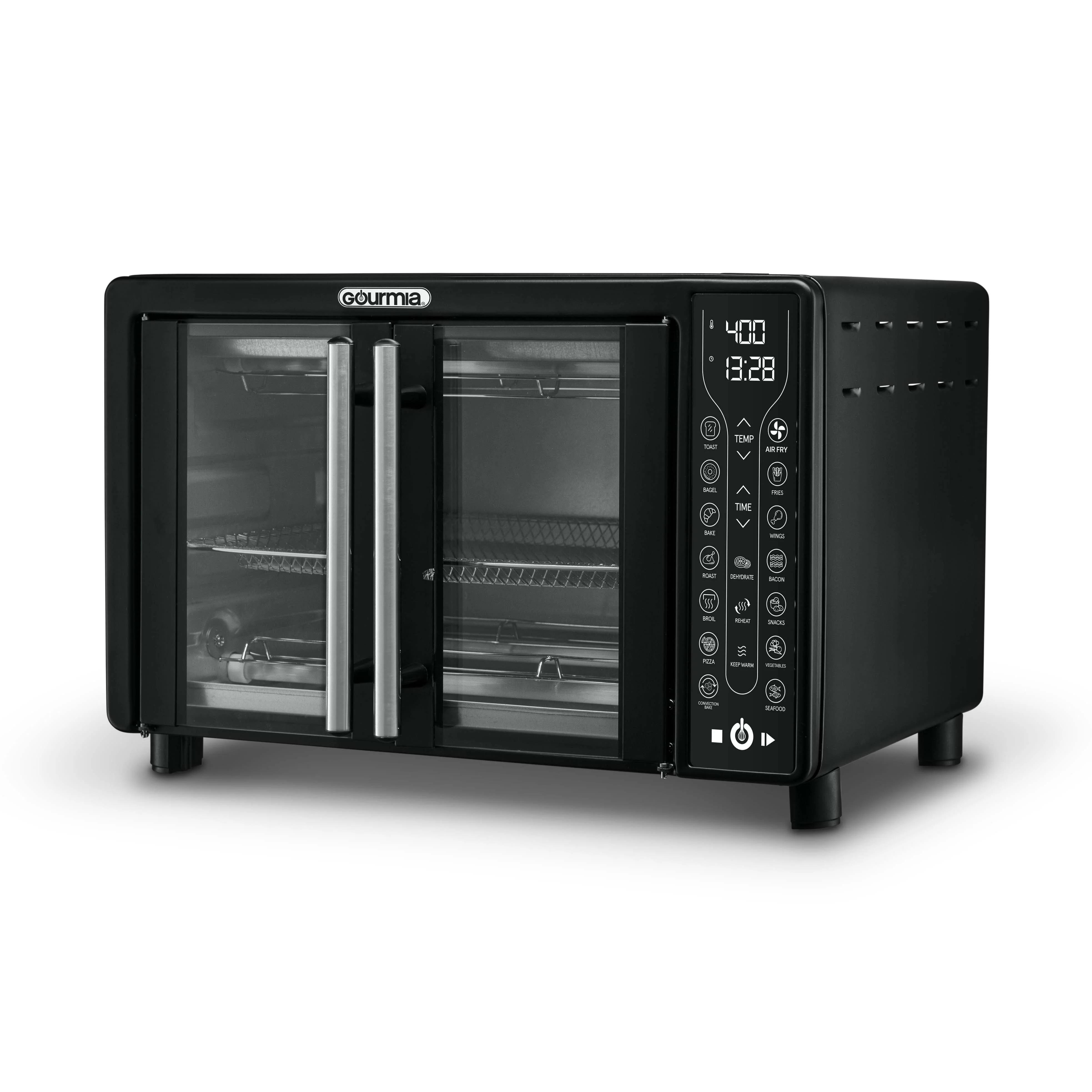 Treat yourself to healthy and delicious meals with the Gourmia Digital French Door Air Fryer Toaster Oven, GTF7460. FryForce 360�� Technology cooks food quickly and evenly with little to no oil. 17 One-Touch Cooking Functions allow you to air fry, bake, dehydrate and more - with just a tap. Use easy-set digital controls to adjust time, temperature, and toast settings. The oven fits a 12'' pizza or 6 slices of bread. A large viewing window, compact design, and French doors set this Air Fryer Toaster Oven apart. Includes dishwasher safe air fry basket, oven rack, baking pan, and crumb tray.