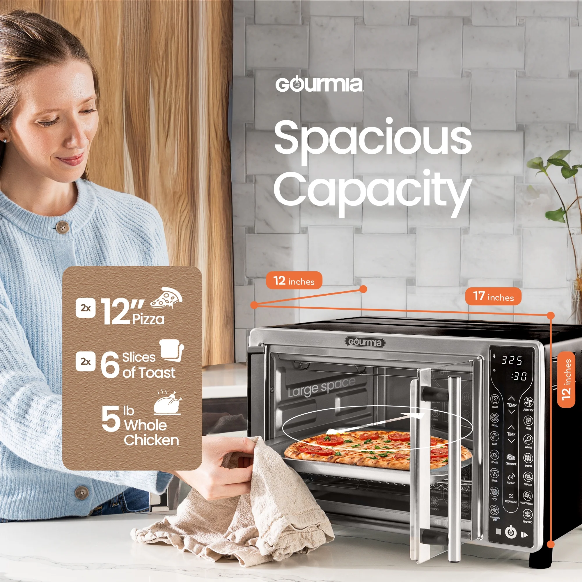 - SPACIOUS CAPACITY: Fits an entire 12" pizza or 6 slices of toast