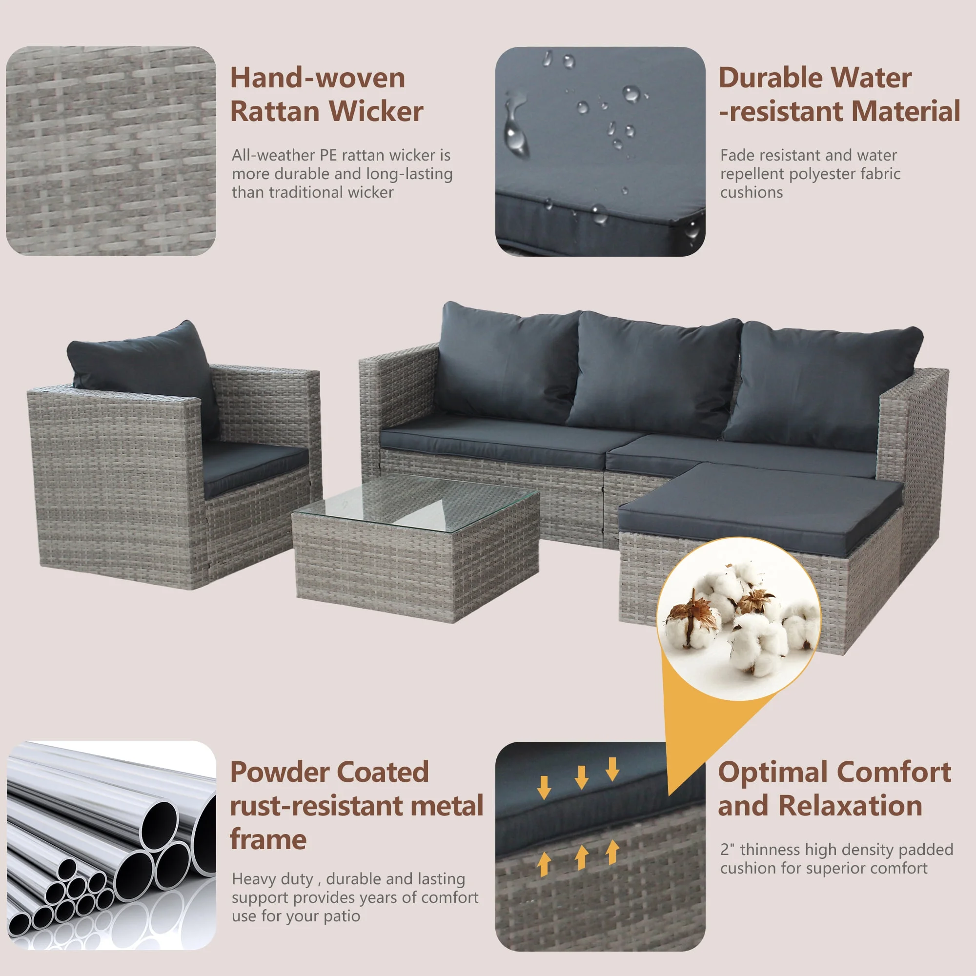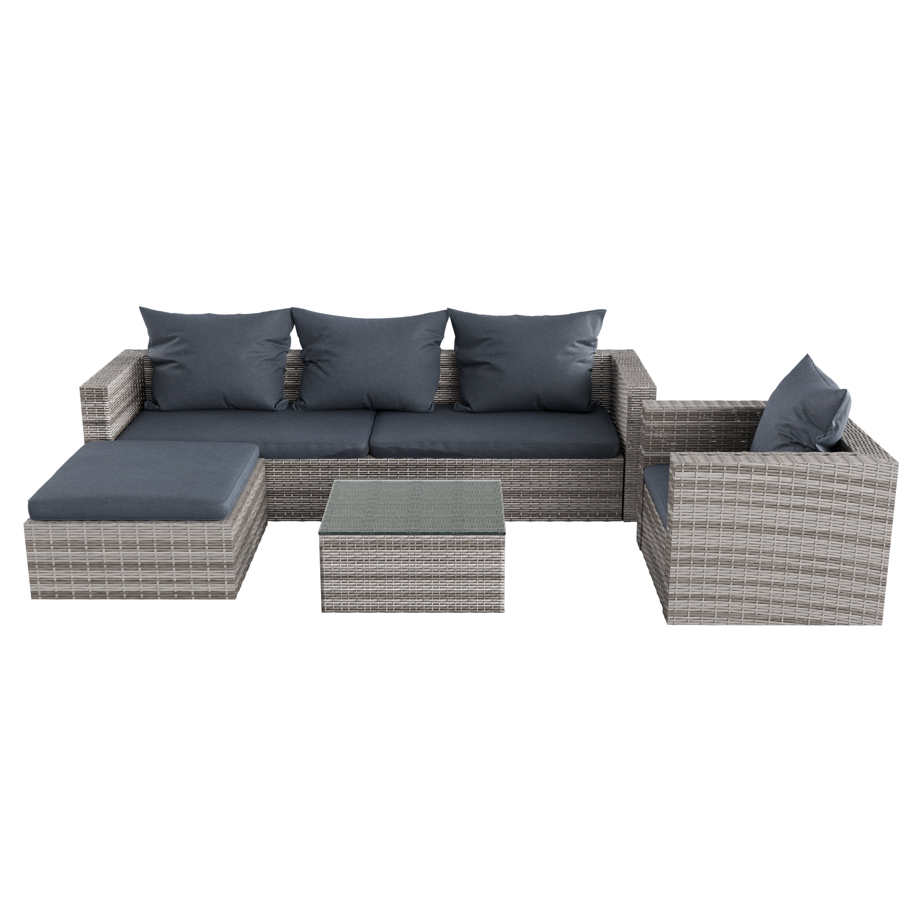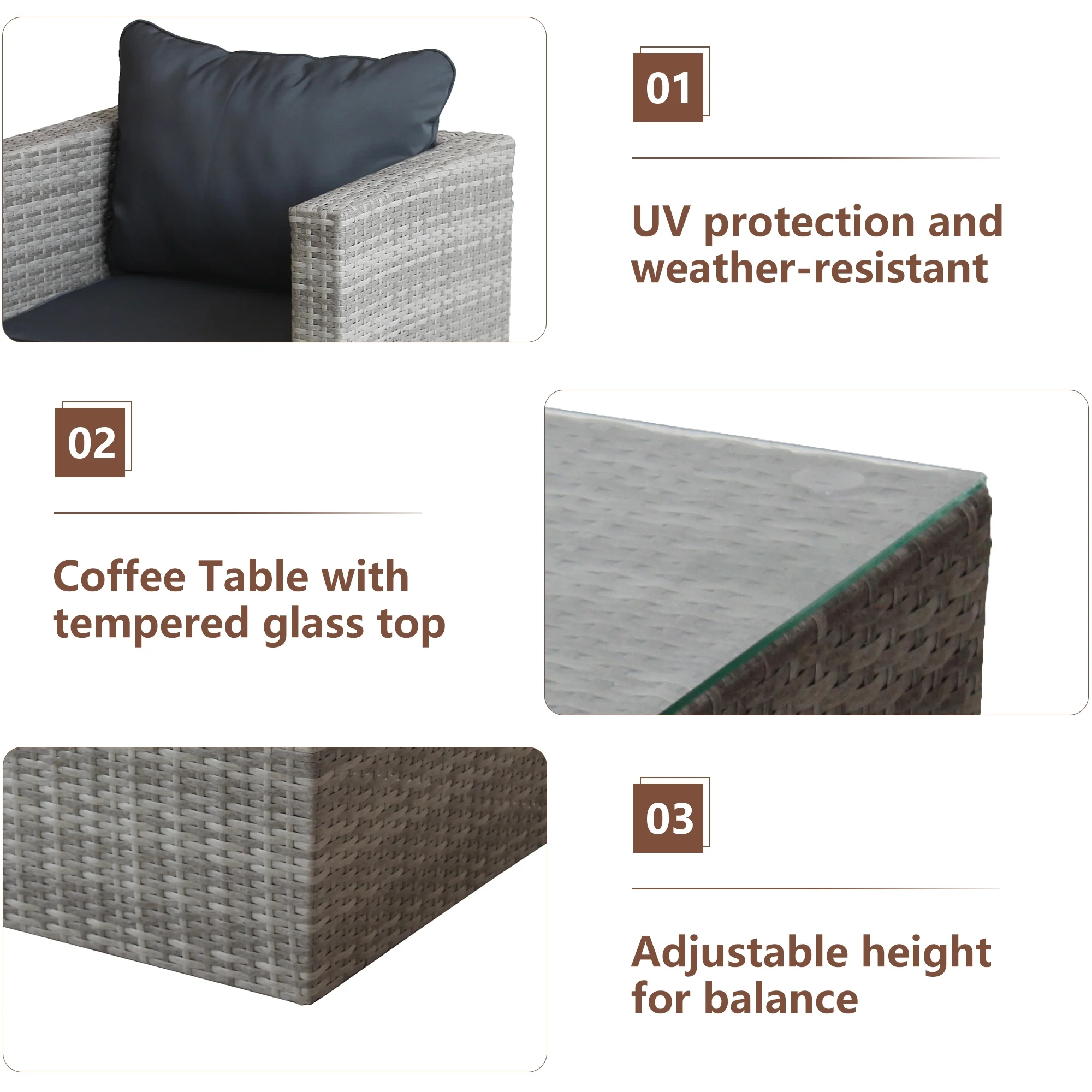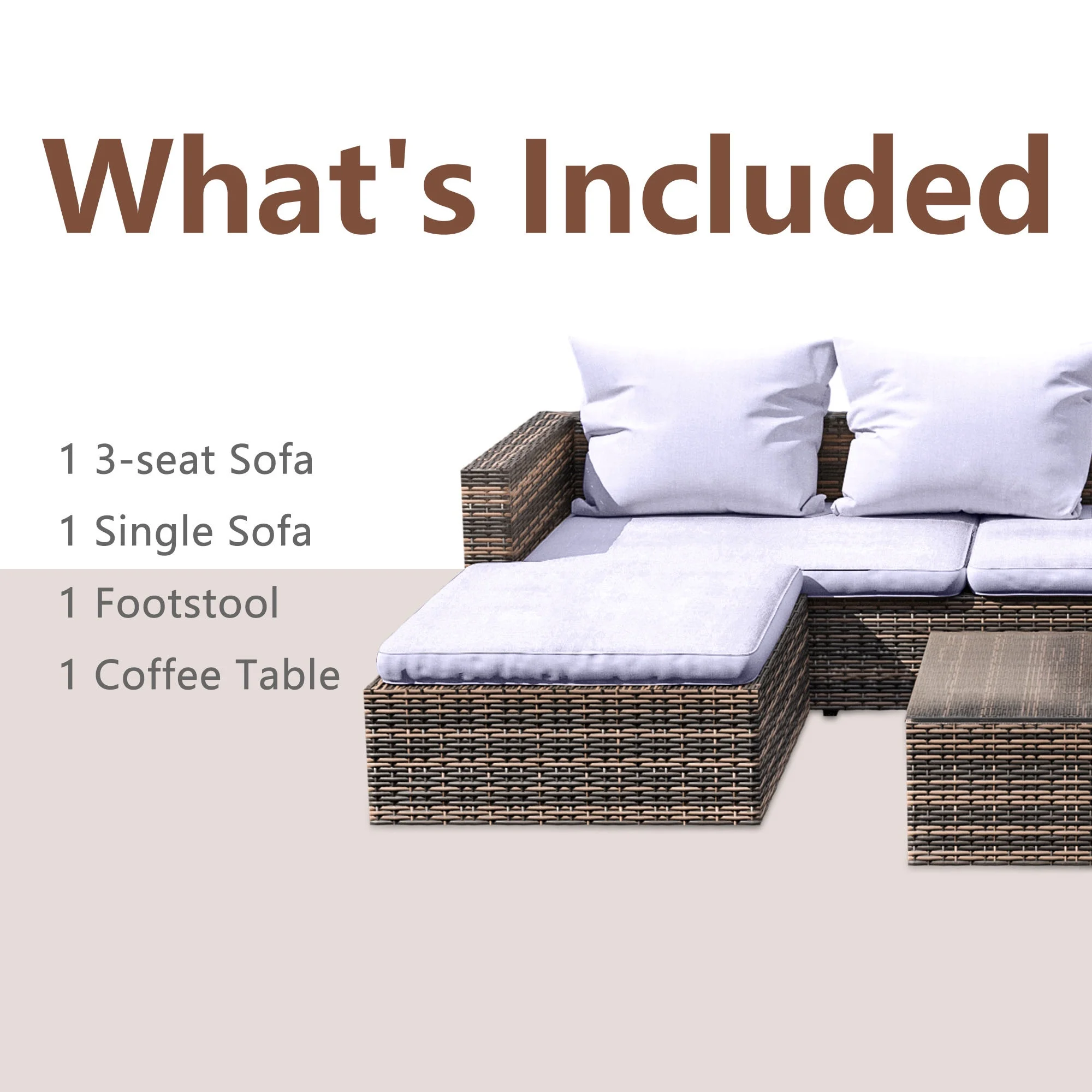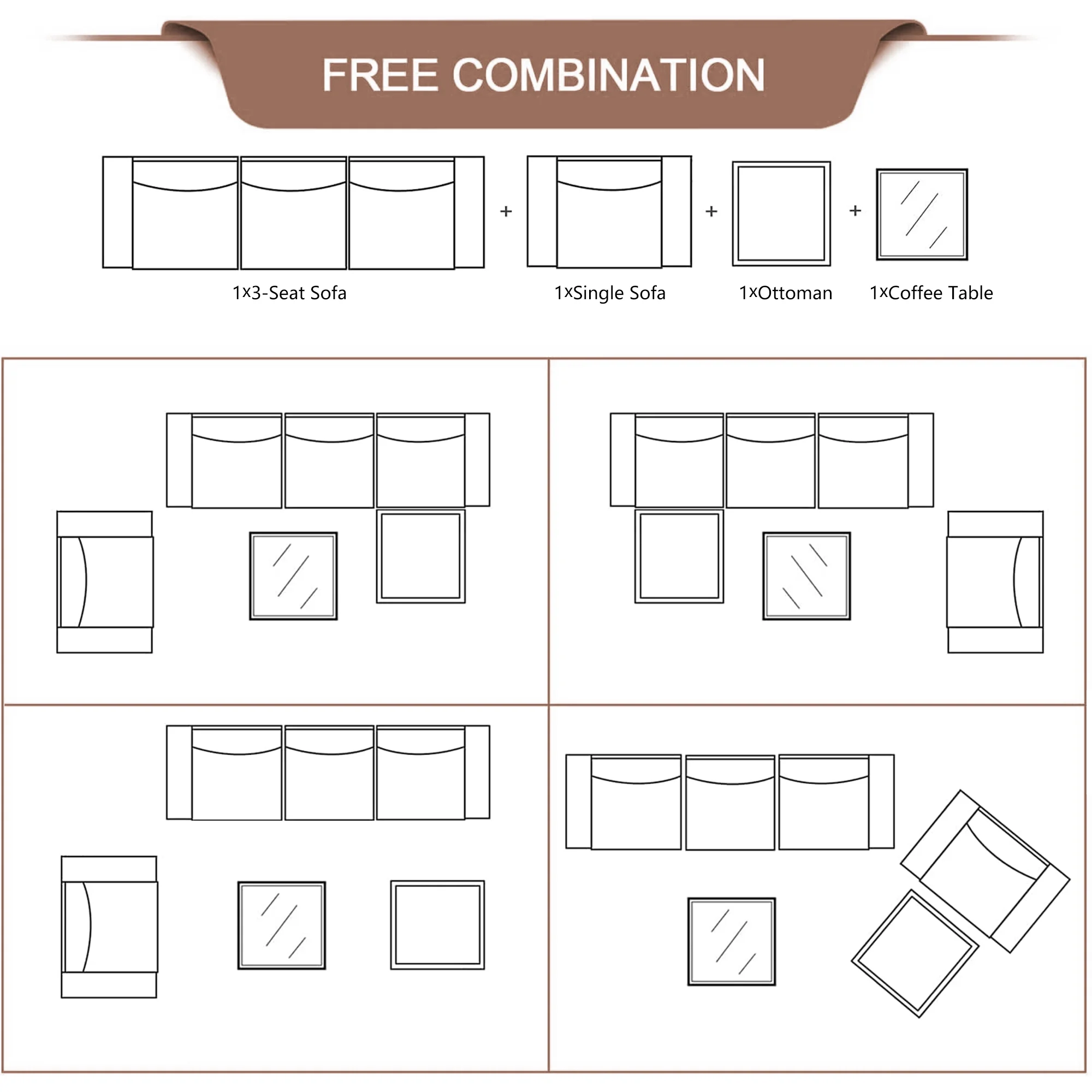 The outdoor furniture set features a 3-seater sofa, 1 armchair, 1 ottoman, and 1 coffee table, which can be combined freely according to different occasions.