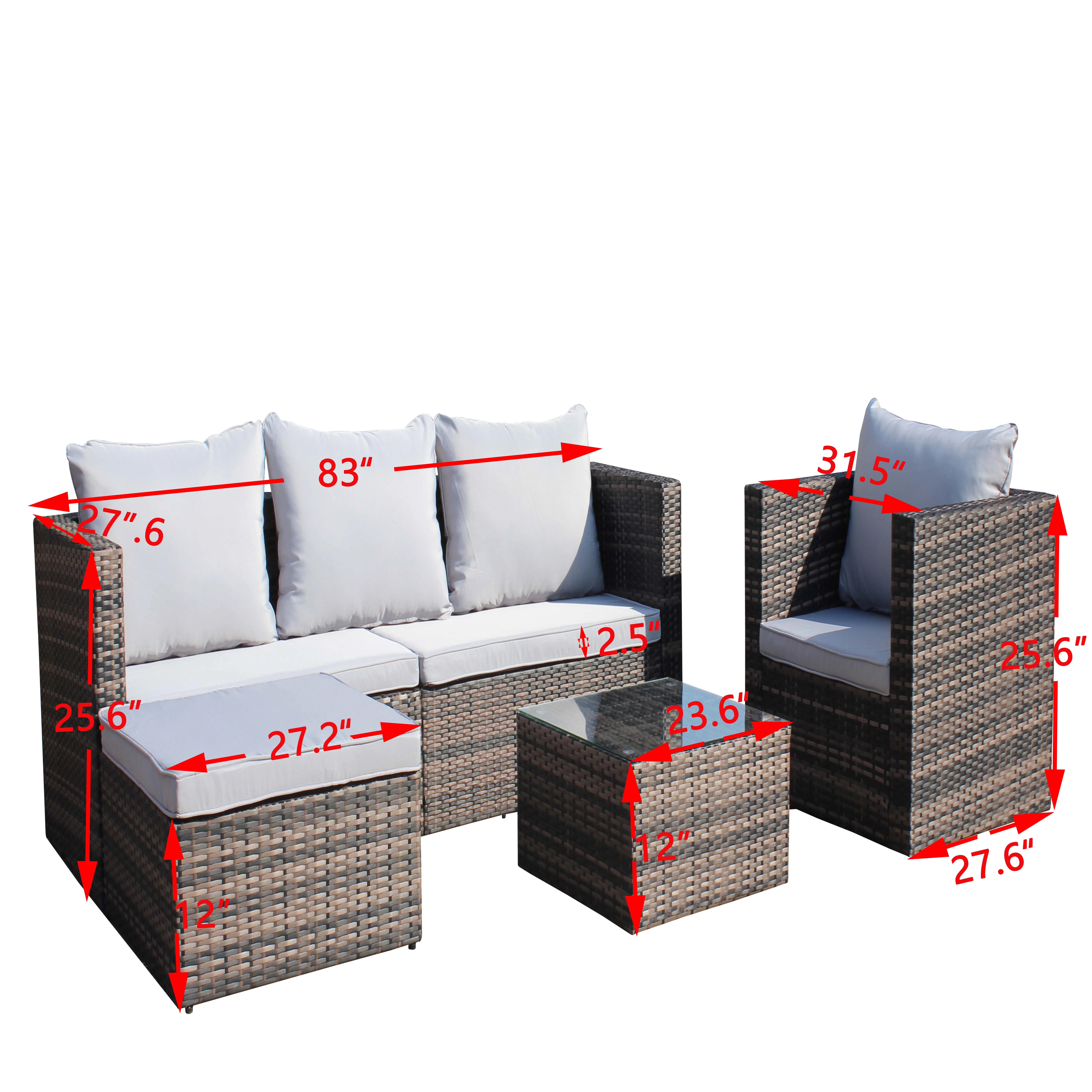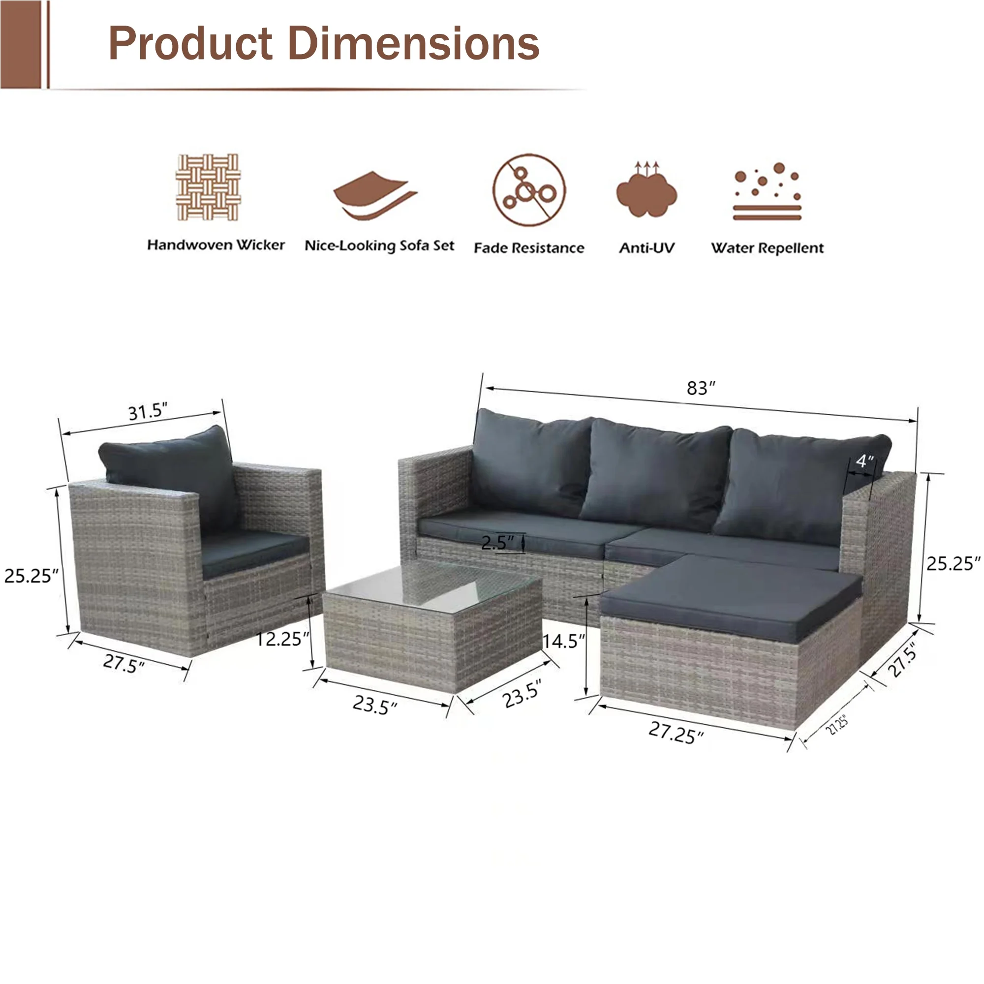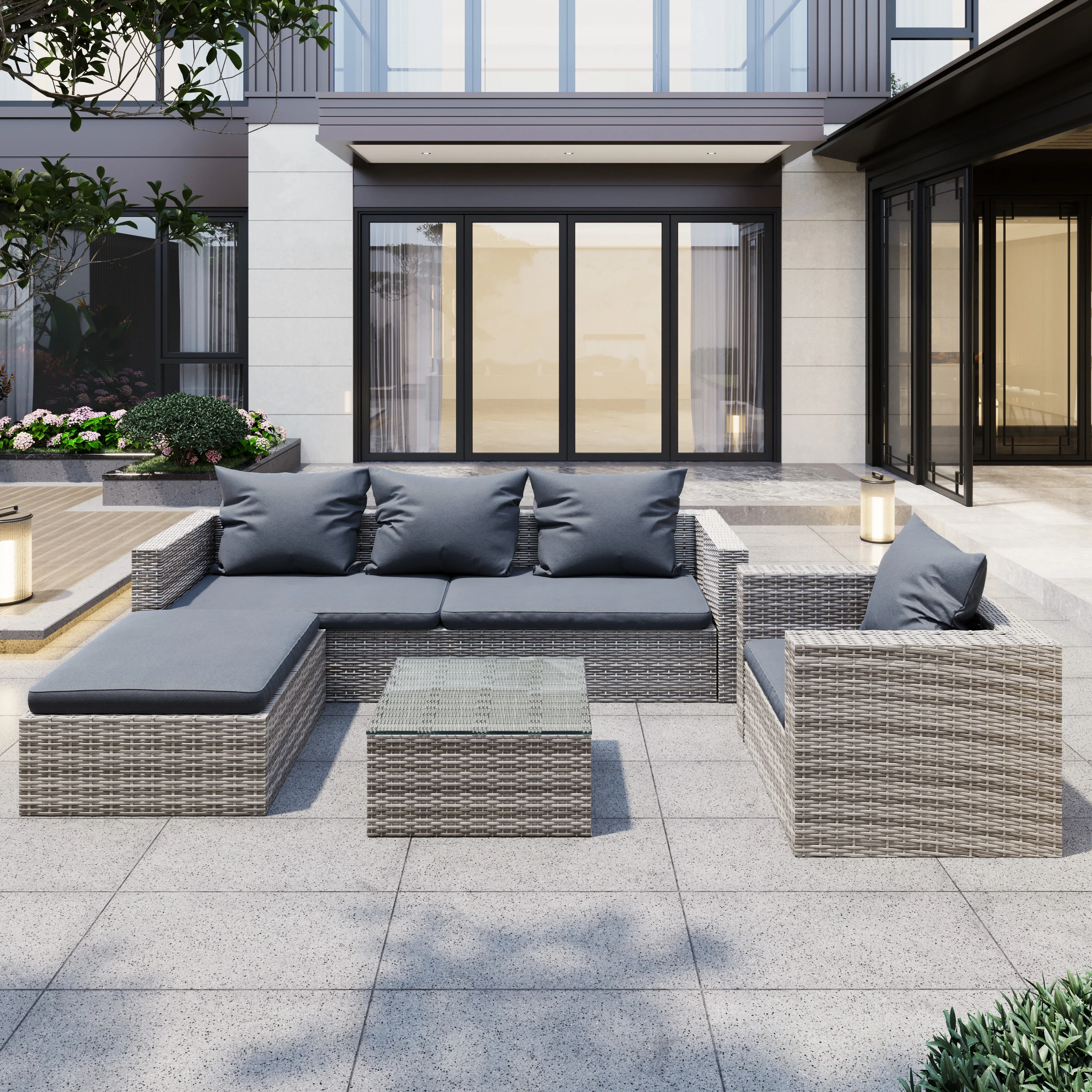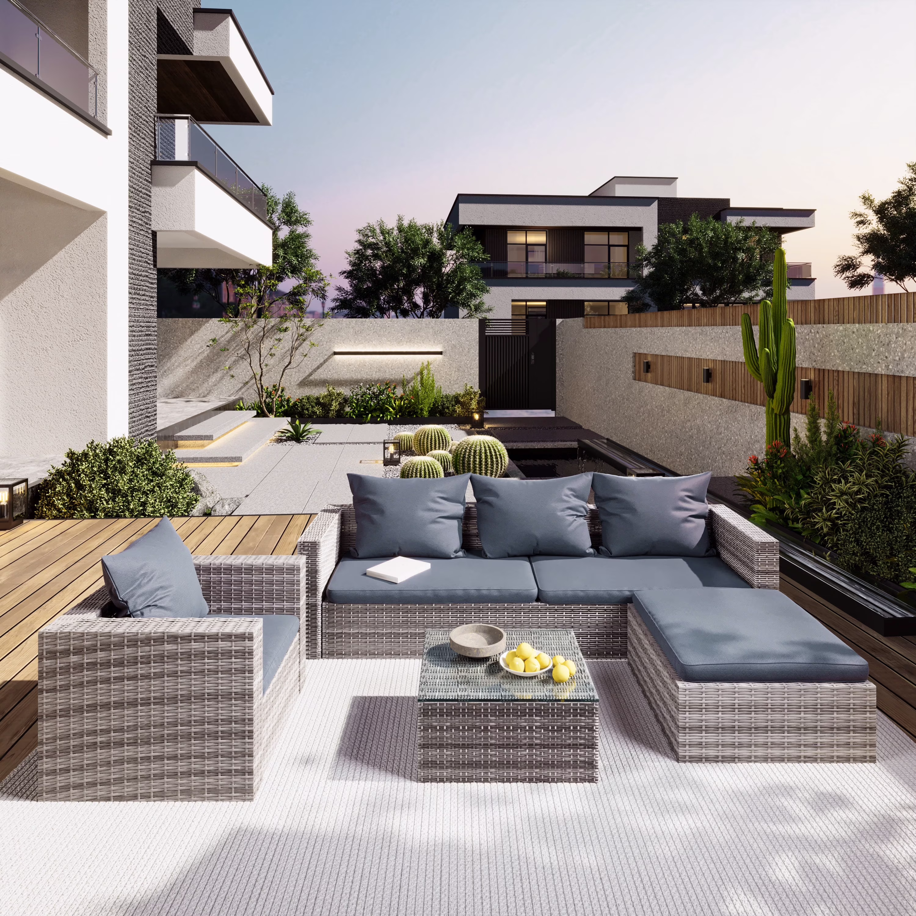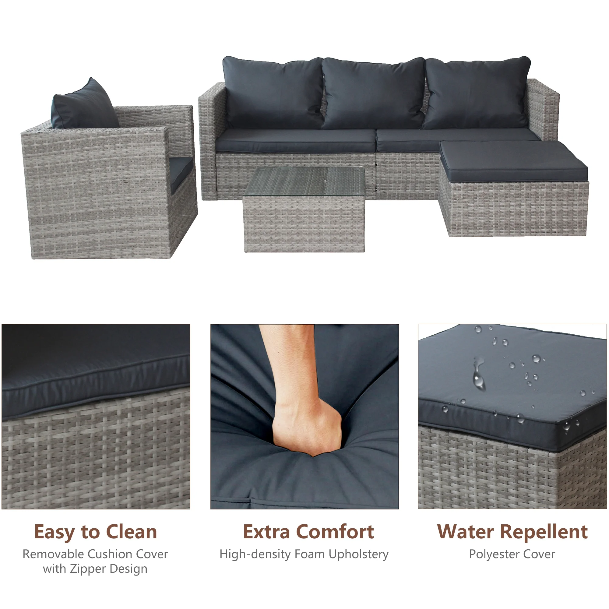 The outdoor furniture set features a 3-seater sofa, 1 armchair, 1 ottoman, and 1 coffee table, which can be combined freely according to different occasions.