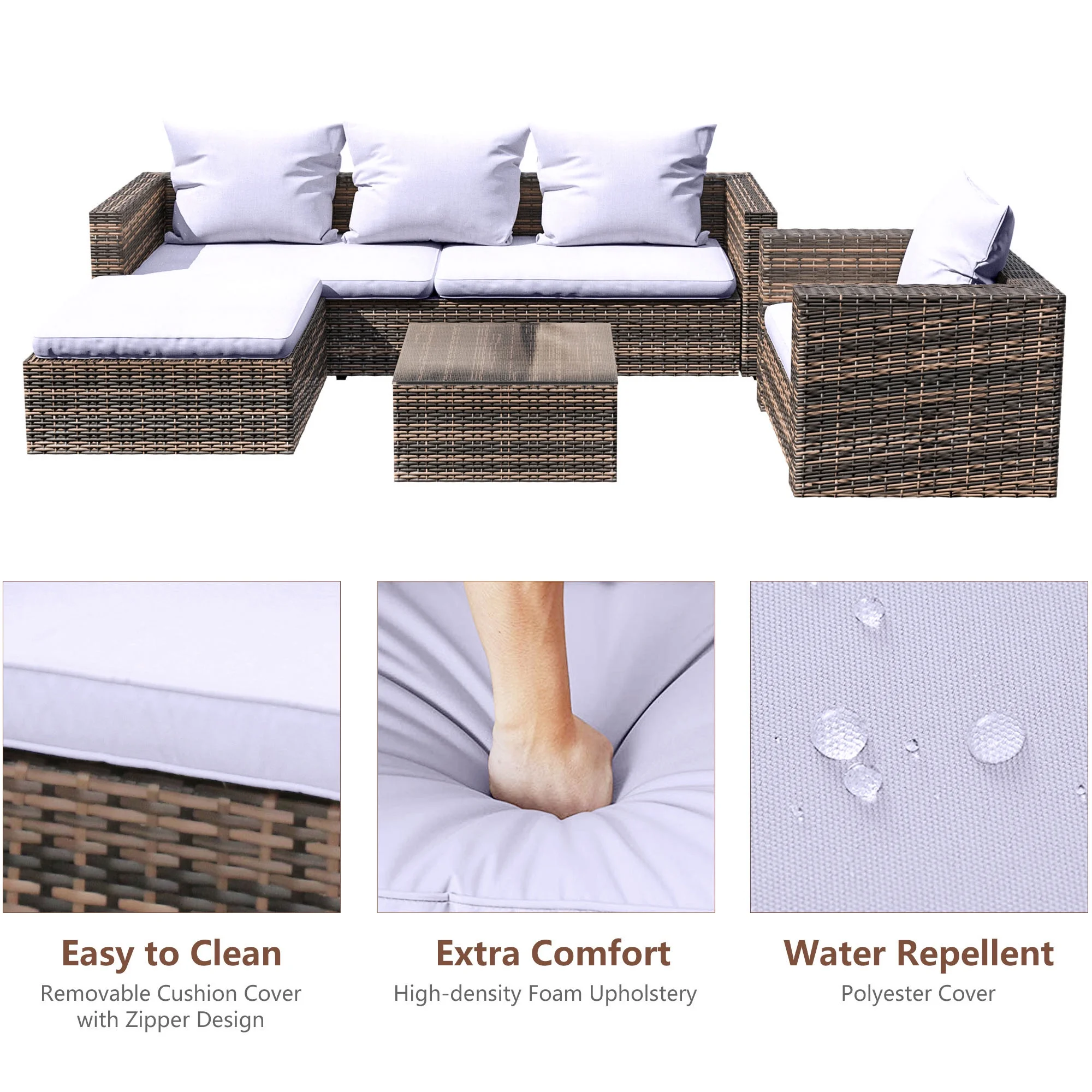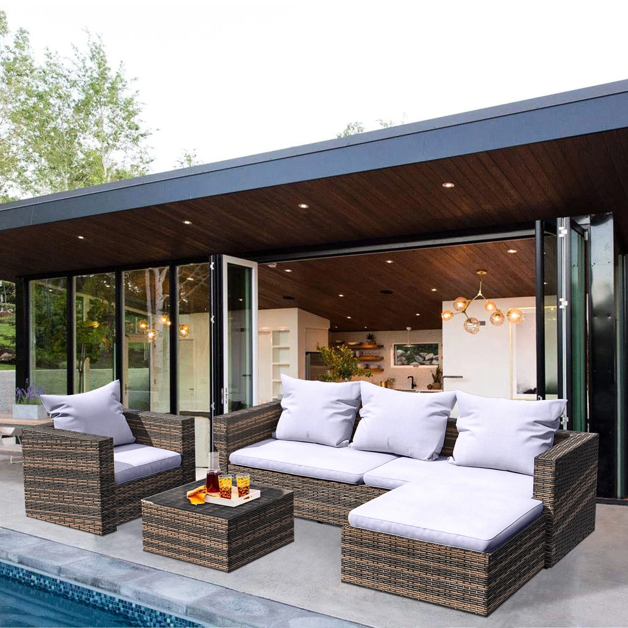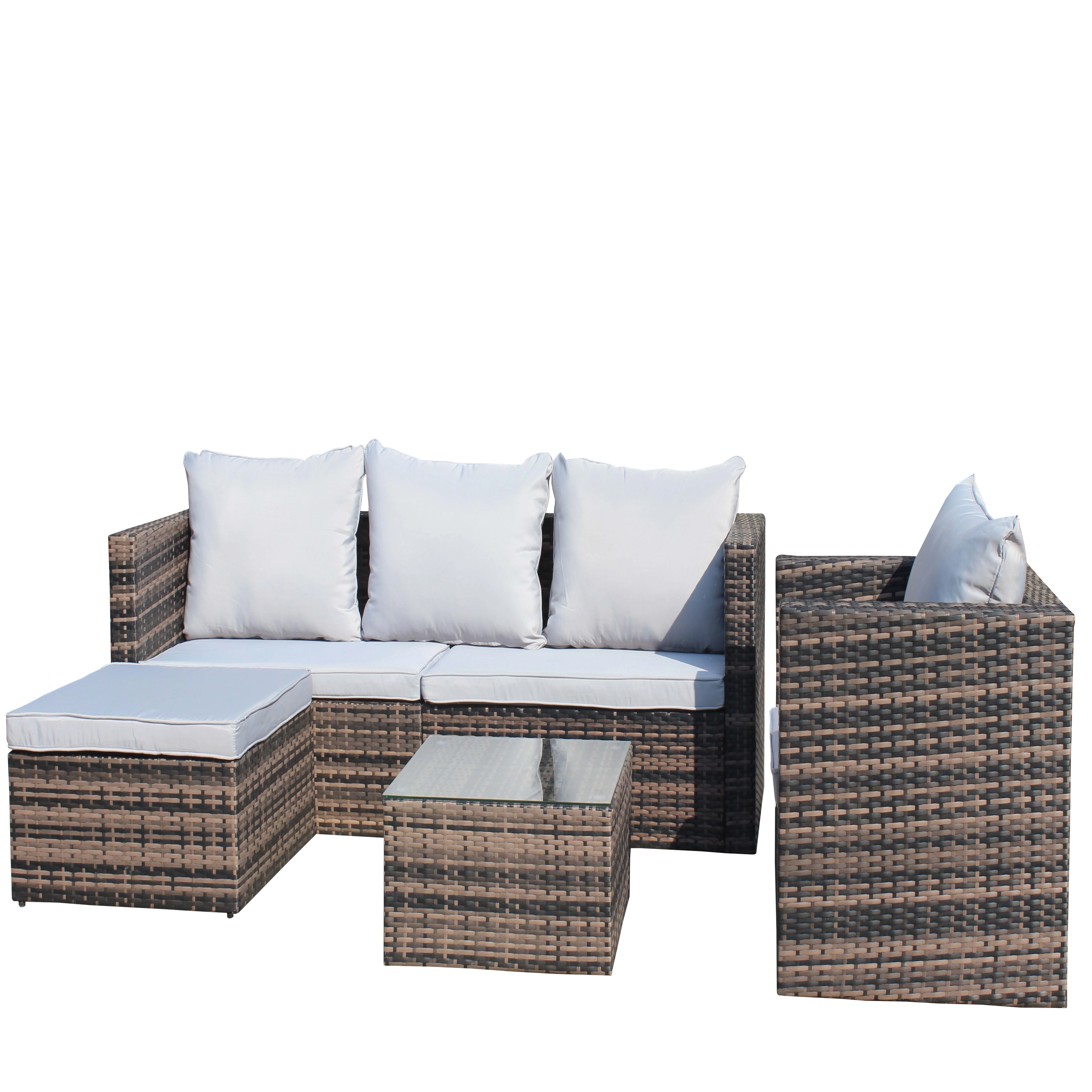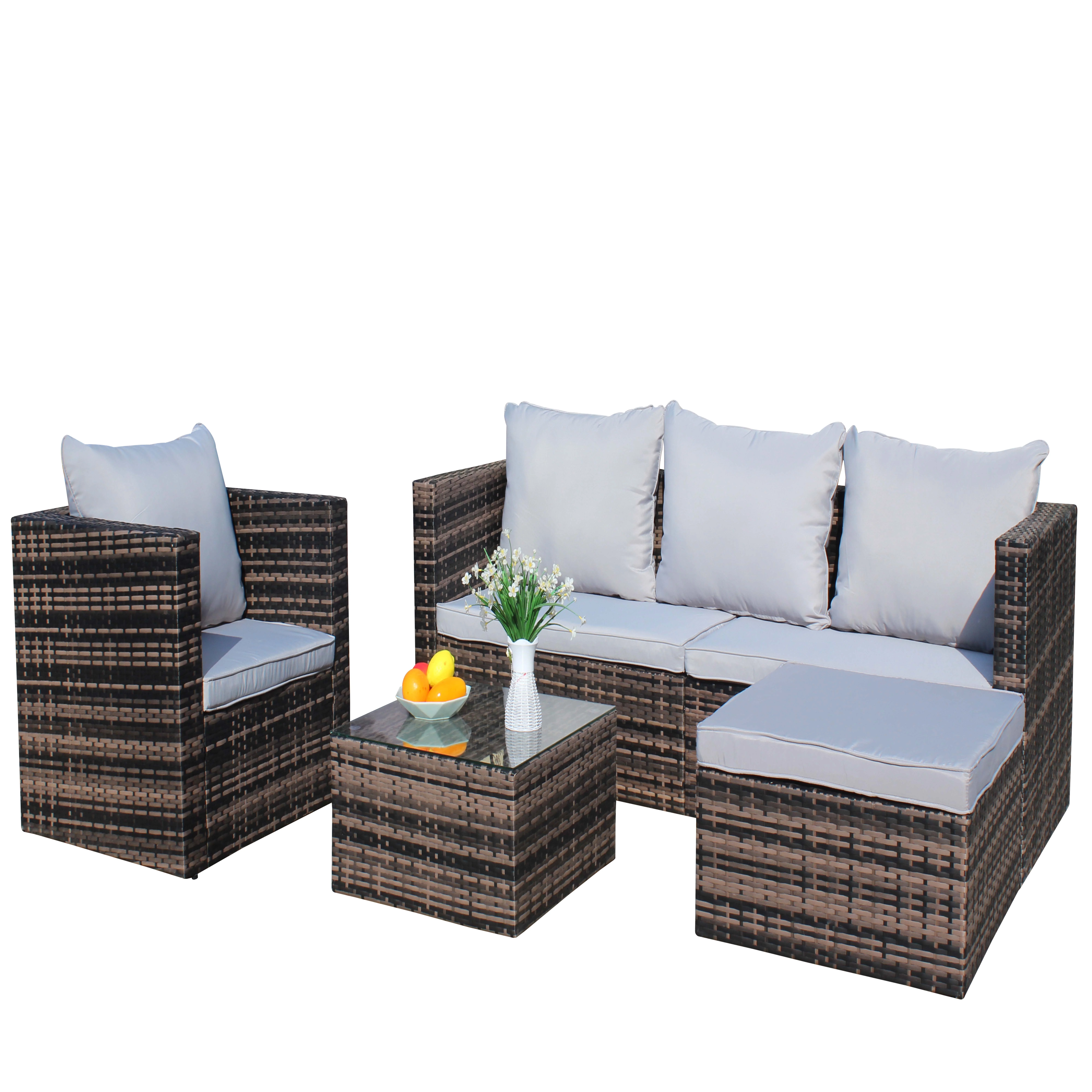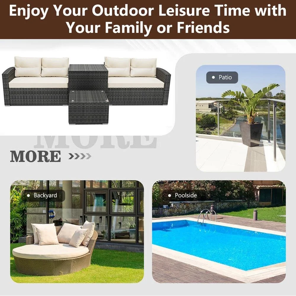The outdoor furniture set features a 3-seater sofa, 1 armchair, 1 ottoman, and 1 coffee table, which can be combined freely according to different occasions.