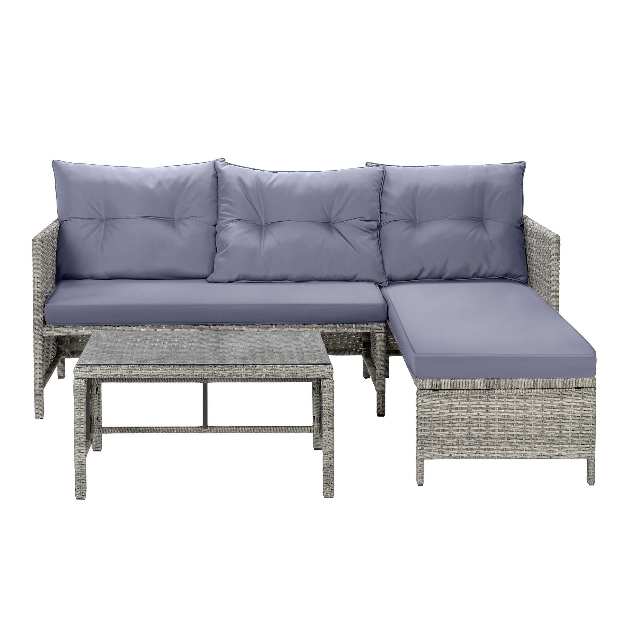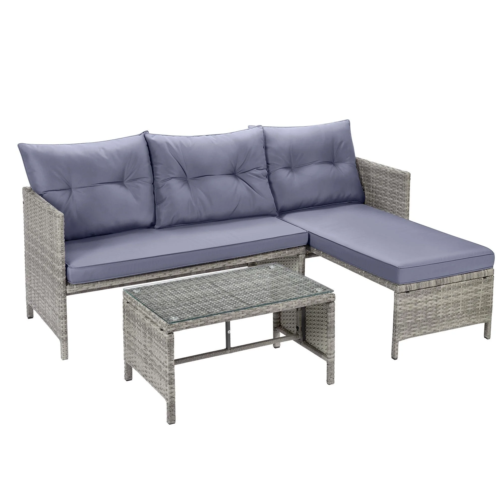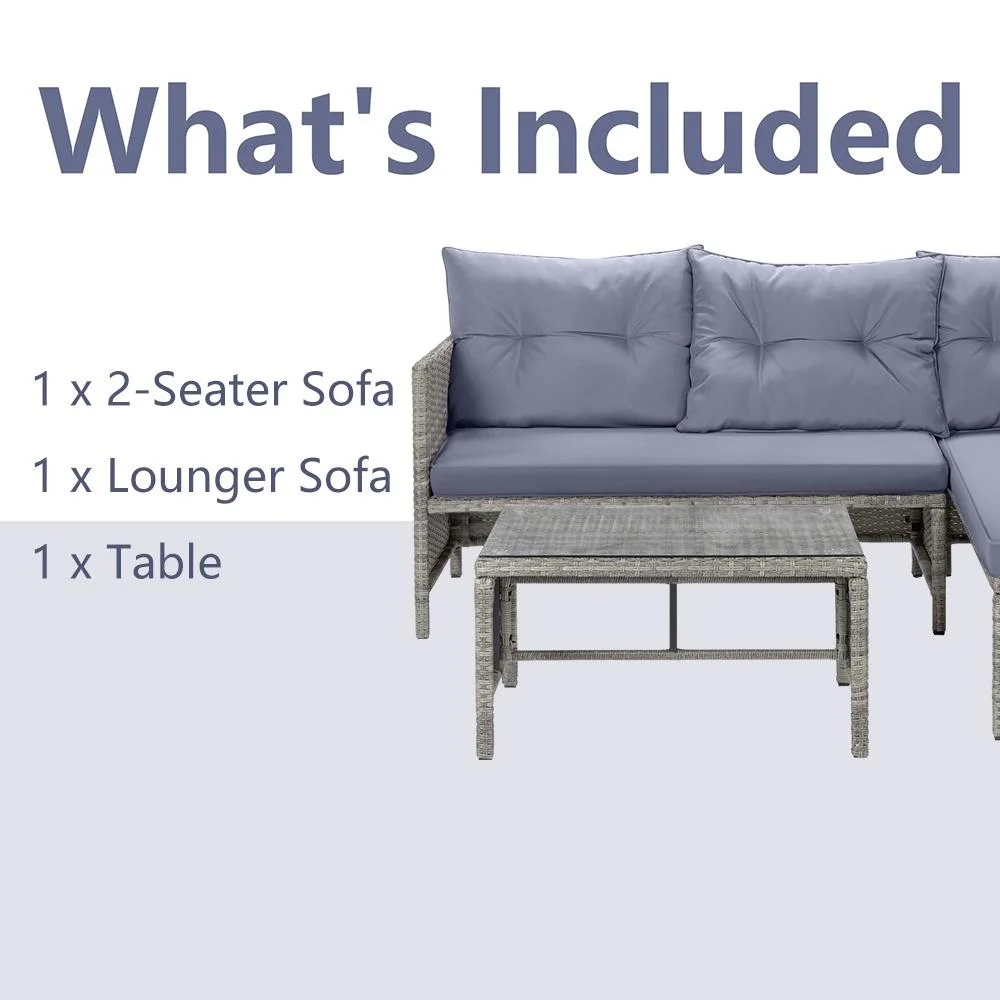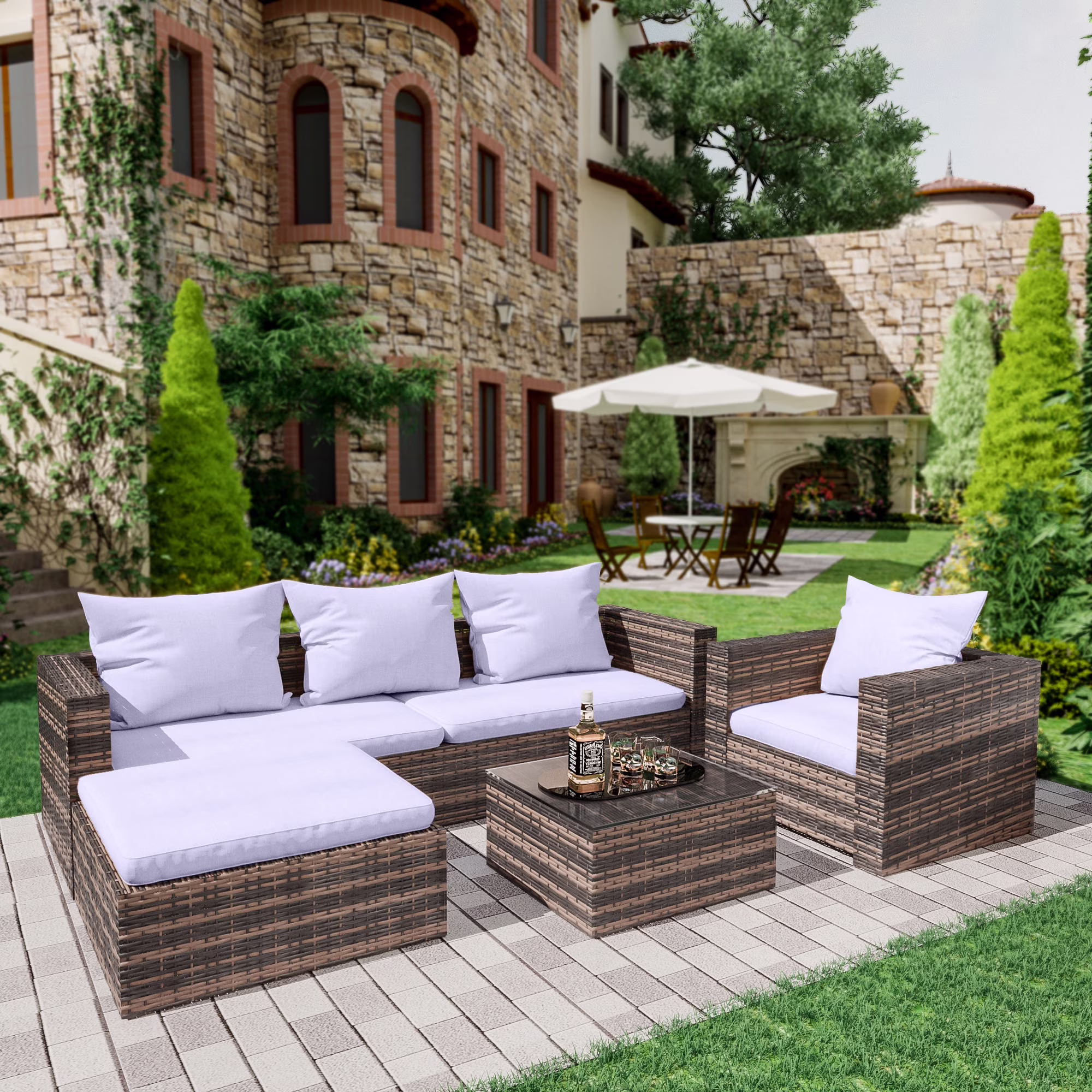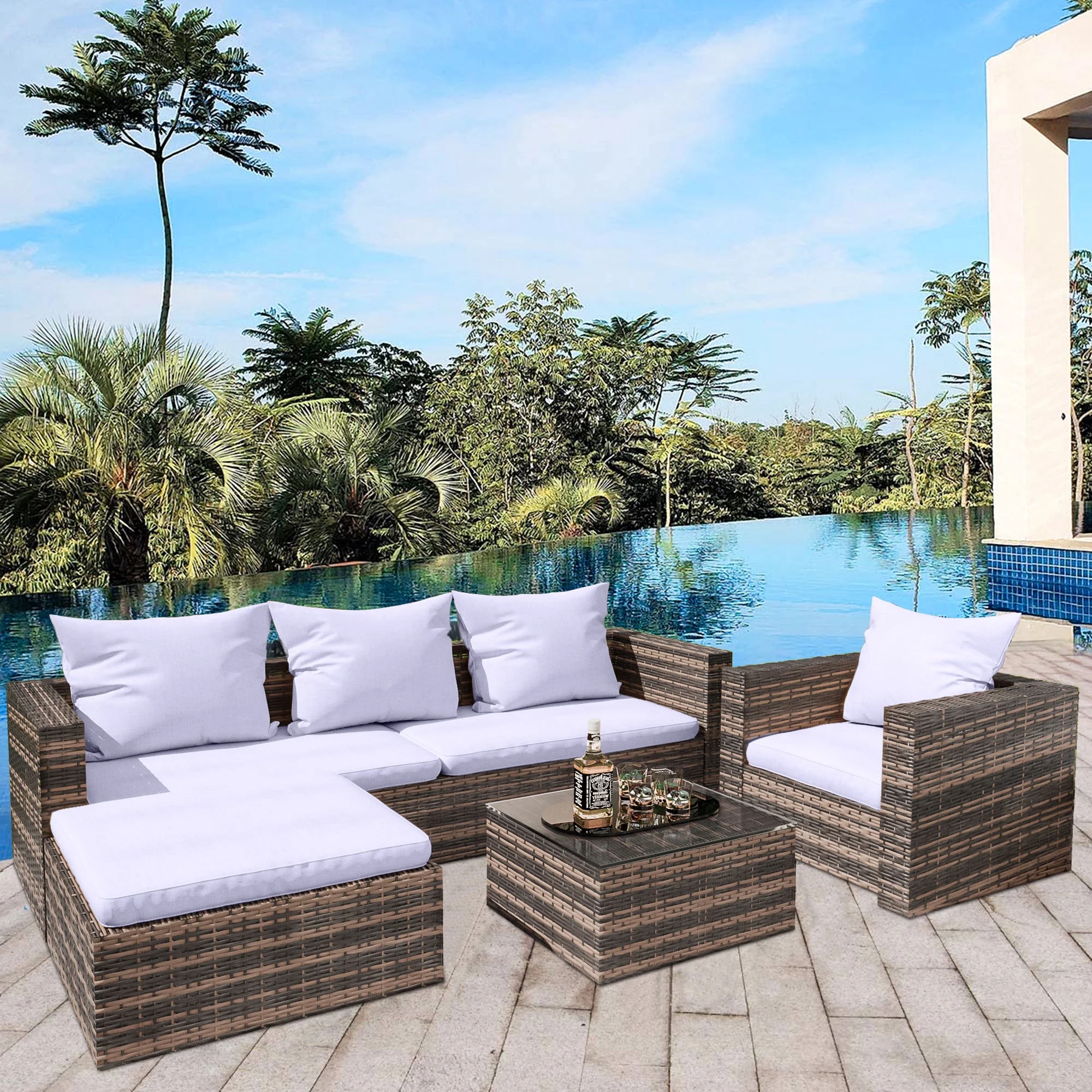 The outdoor furniture set features a 3-seater sofa, 1 armchair, 1 ottoman, and 1 coffee table, which can be combined freely according to different occasions.