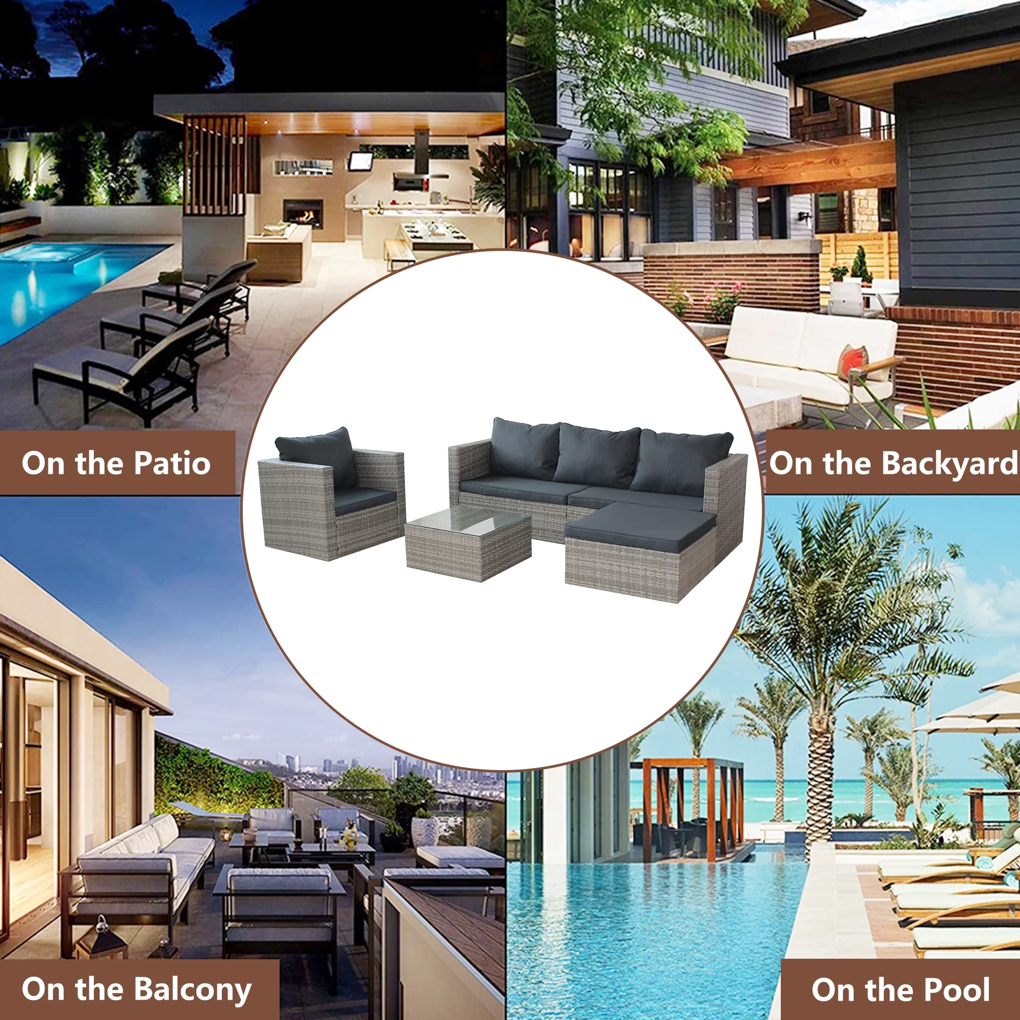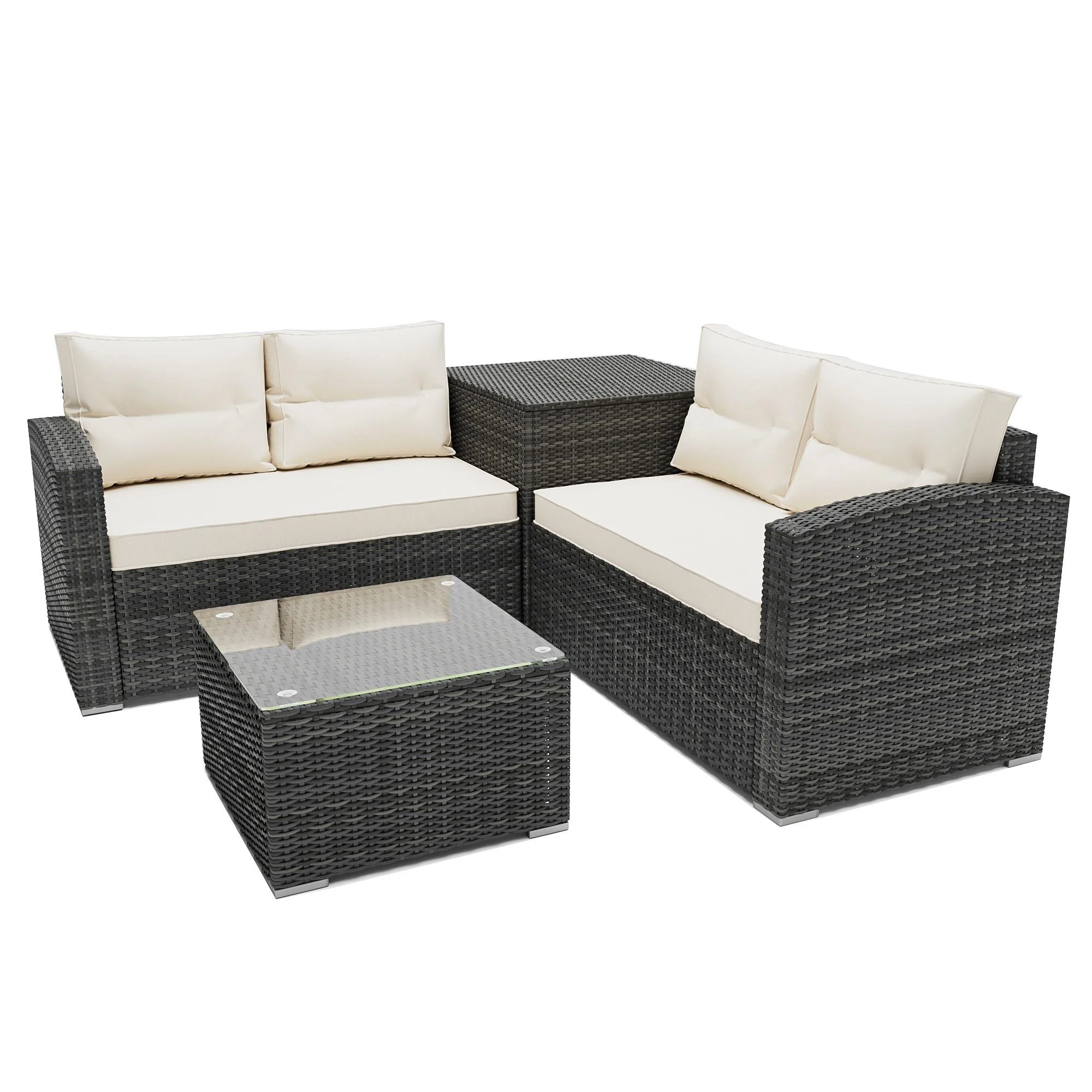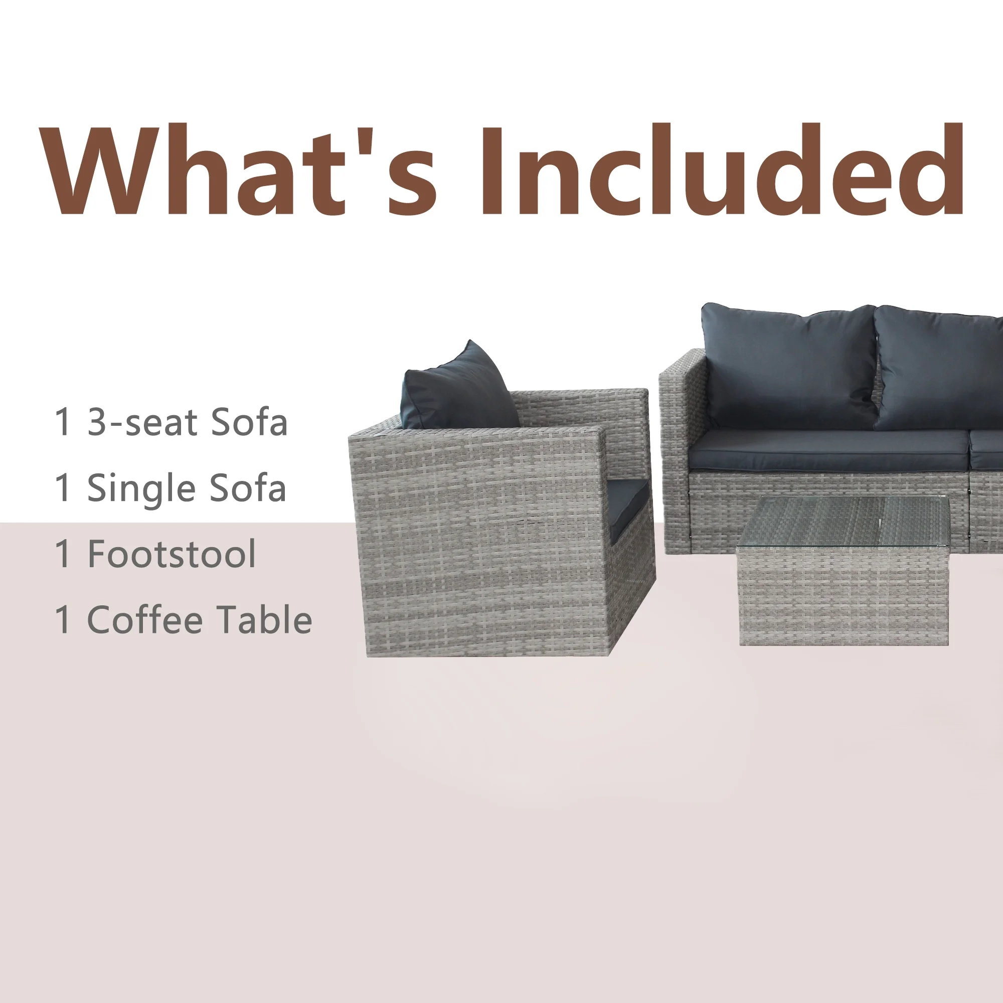 Rattan Patio Sofa Set, 4 Pieces Outdoor Sectional Furniture Set, All - Weather PE Rattan Wicker Patio Conversation Set, Cushioned Sofa Set with Glass Table for Patio Garden Poolside Deck