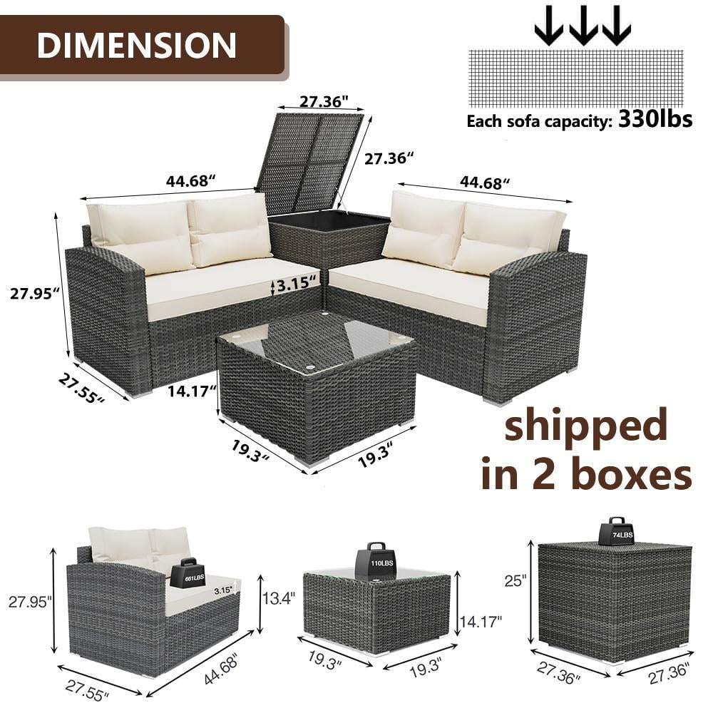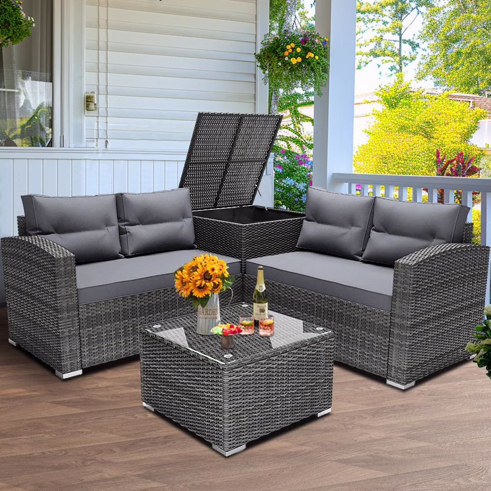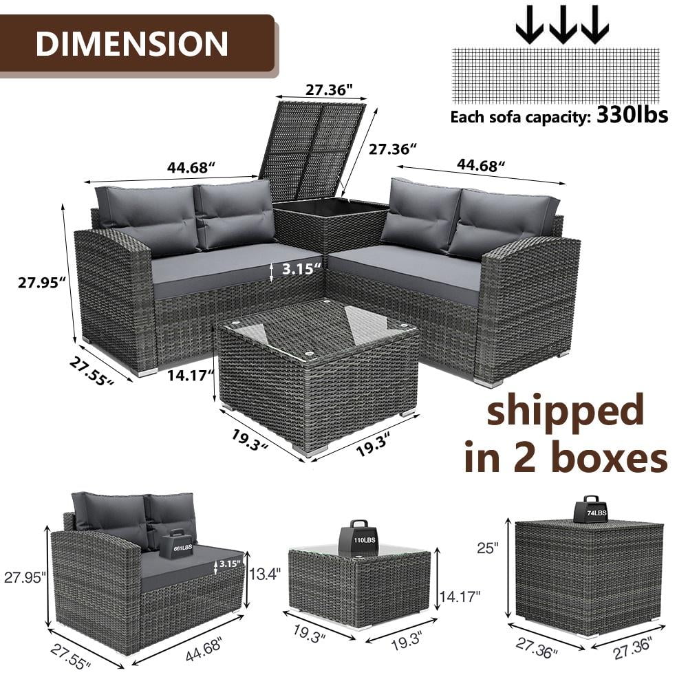 Rattan Patio Sofa Set, 4 Pieces Outdoor Sectional Furniture Set, All - Weather PE Rattan Wicker Patio Conversation Set, Cushioned Sofa Set with Glass Table for Patio Garden Poolside Deck