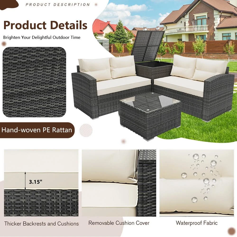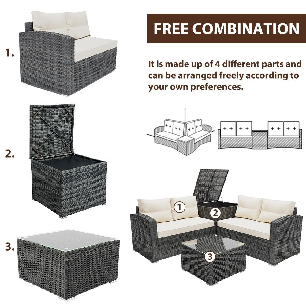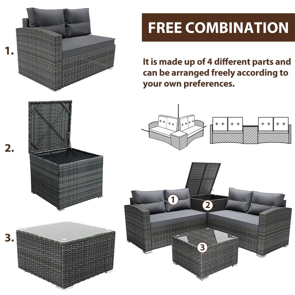 The 4-Piece Rattan Sofa Set will bring you the most comfortable casual experience! The sectional furniture set will provide stylish and comfortable lounging for having a conversation with your family or friends. The solid structure frame ensures stability, and the PE rattan has super weather resistance. The thickened cushion for leaning, which can be easily removed and cleaned, provides you with the greatest degree of comfort. A combination sofa can be disassembled freely according to demand and merged, which is very convenient for you. The simple and stylish exterior is ideal for patio, lawn, poolside, living room or garden.