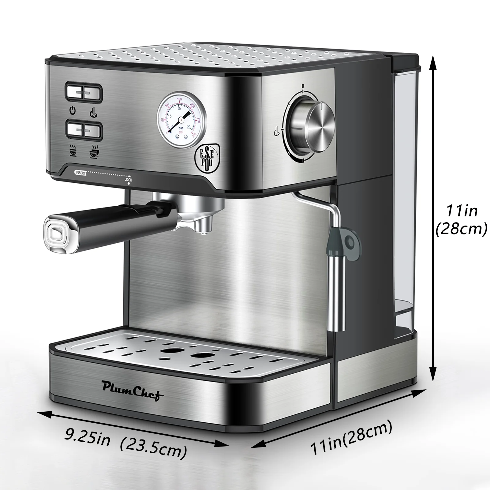 Plum Chef Espresso Coffee Machine, 20 Bar Cappuccino Latte Maker Coffee Machine with ESE POD Capsules Filter&Milk Frother, 1.6 L Water Tank, for Home Barista, Stainless Steel, 850W