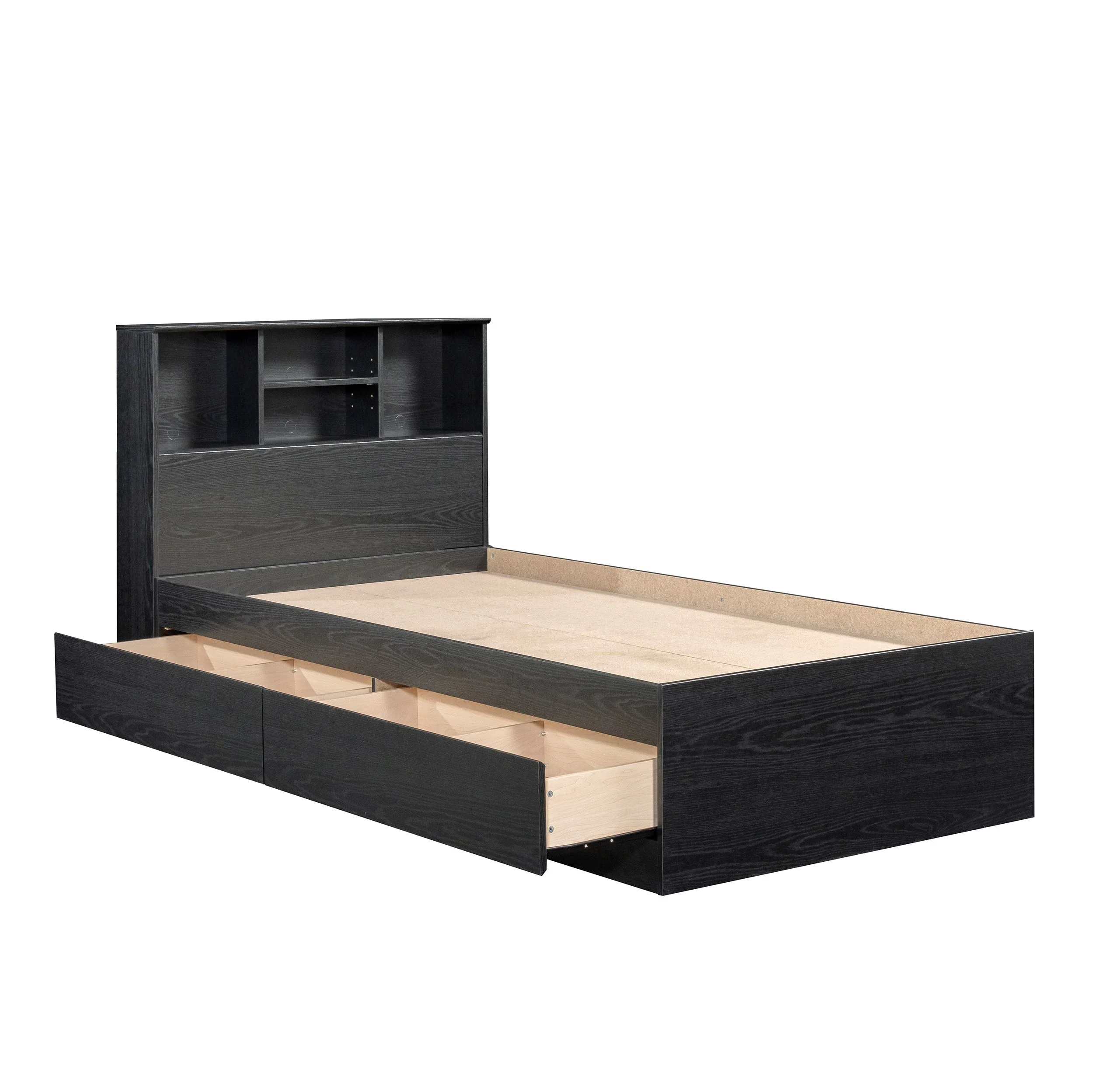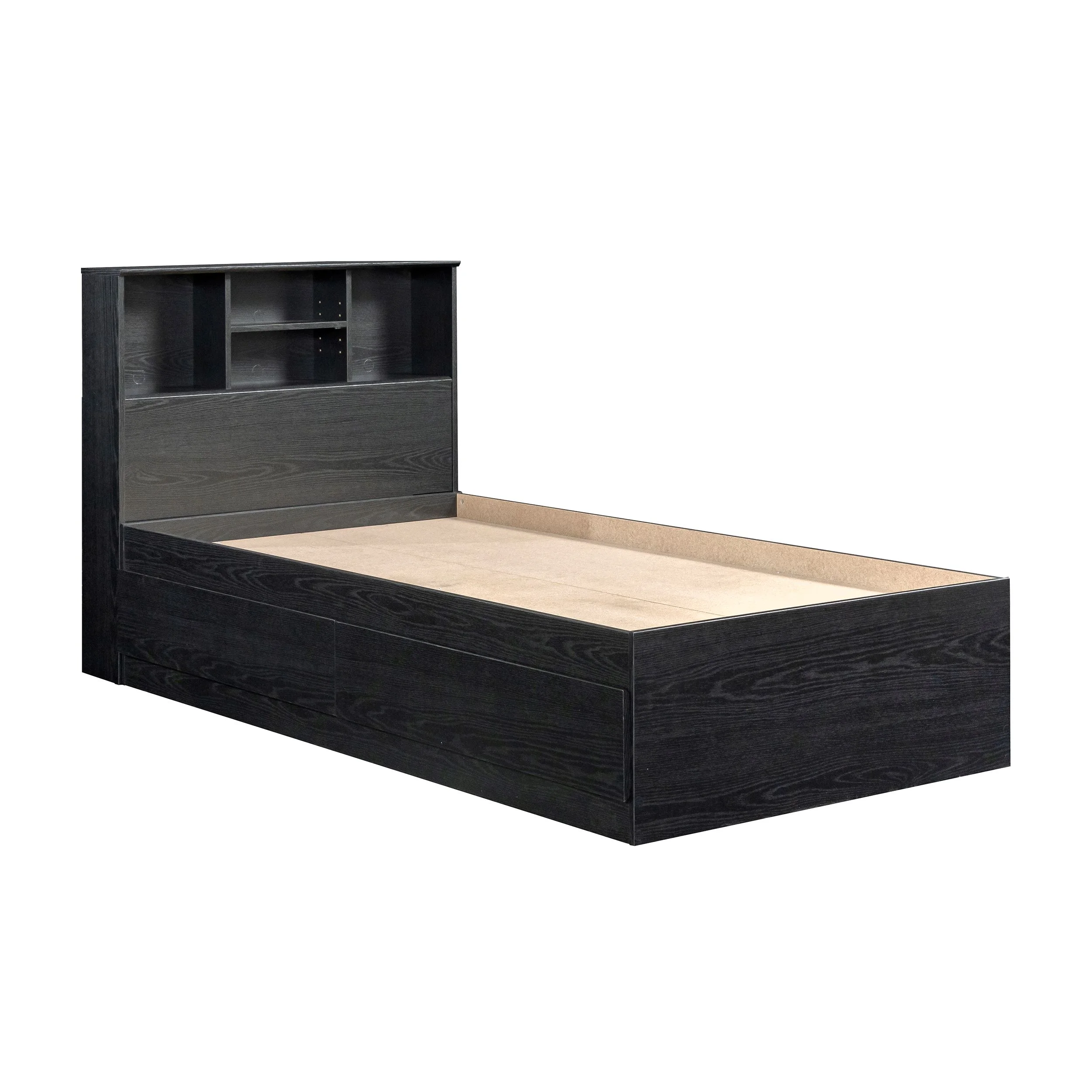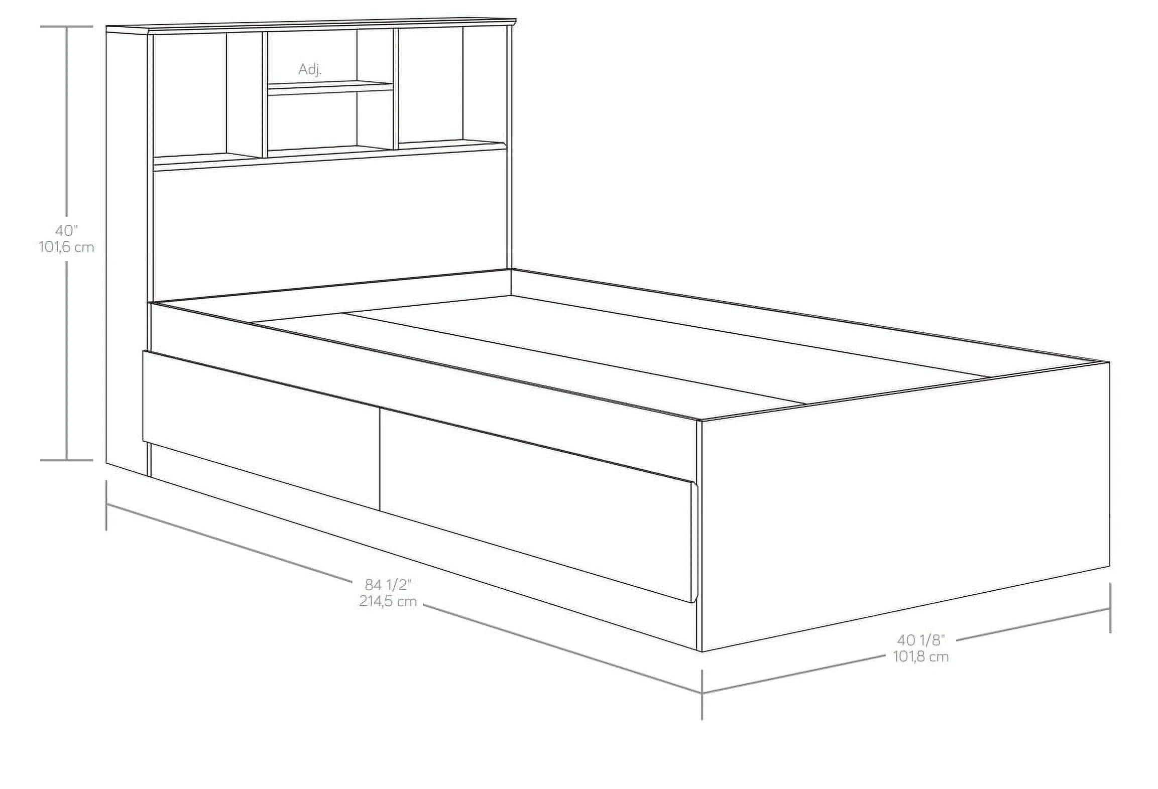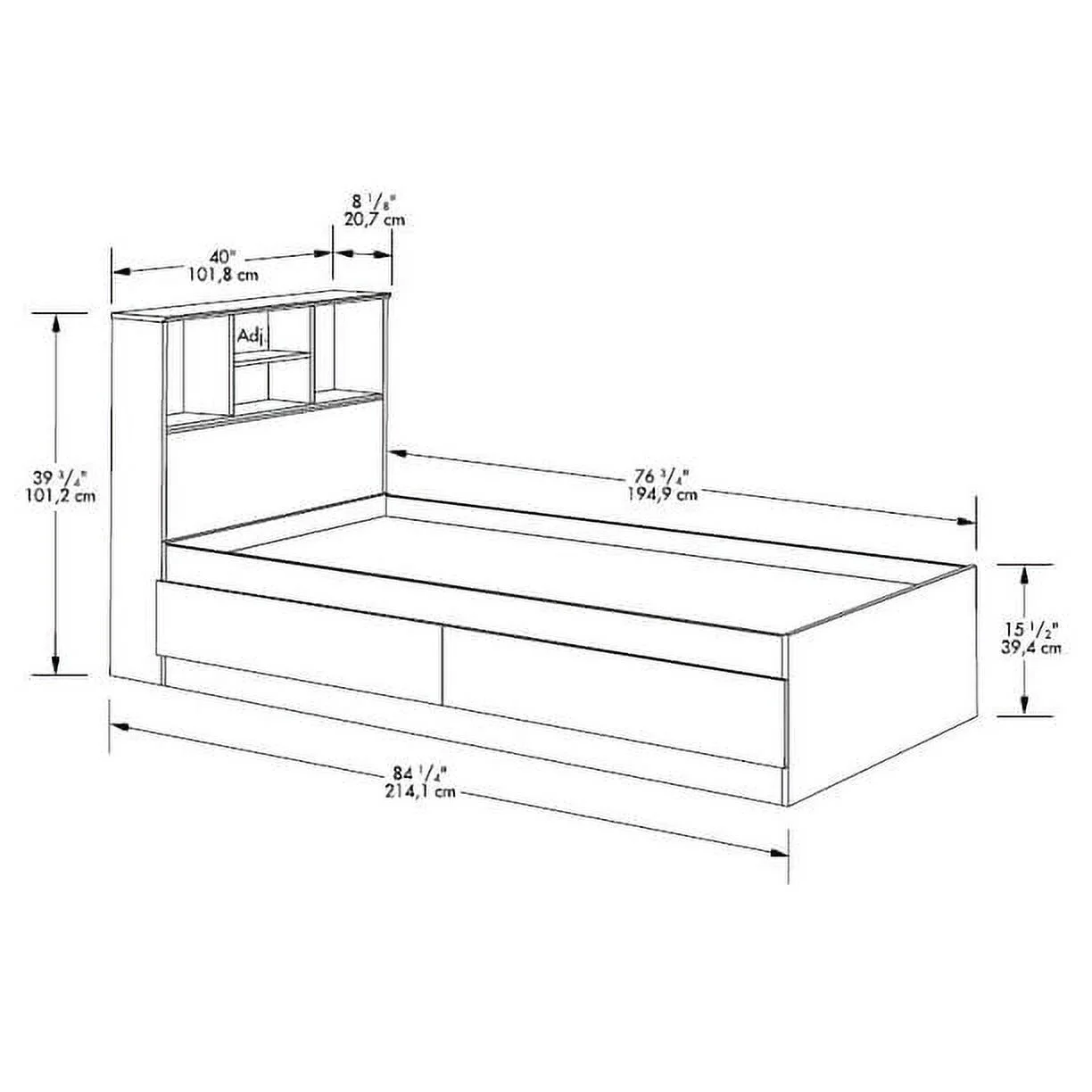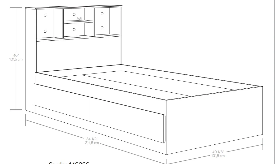 - Adjustable center headboard shelf with 2 open bookshelves