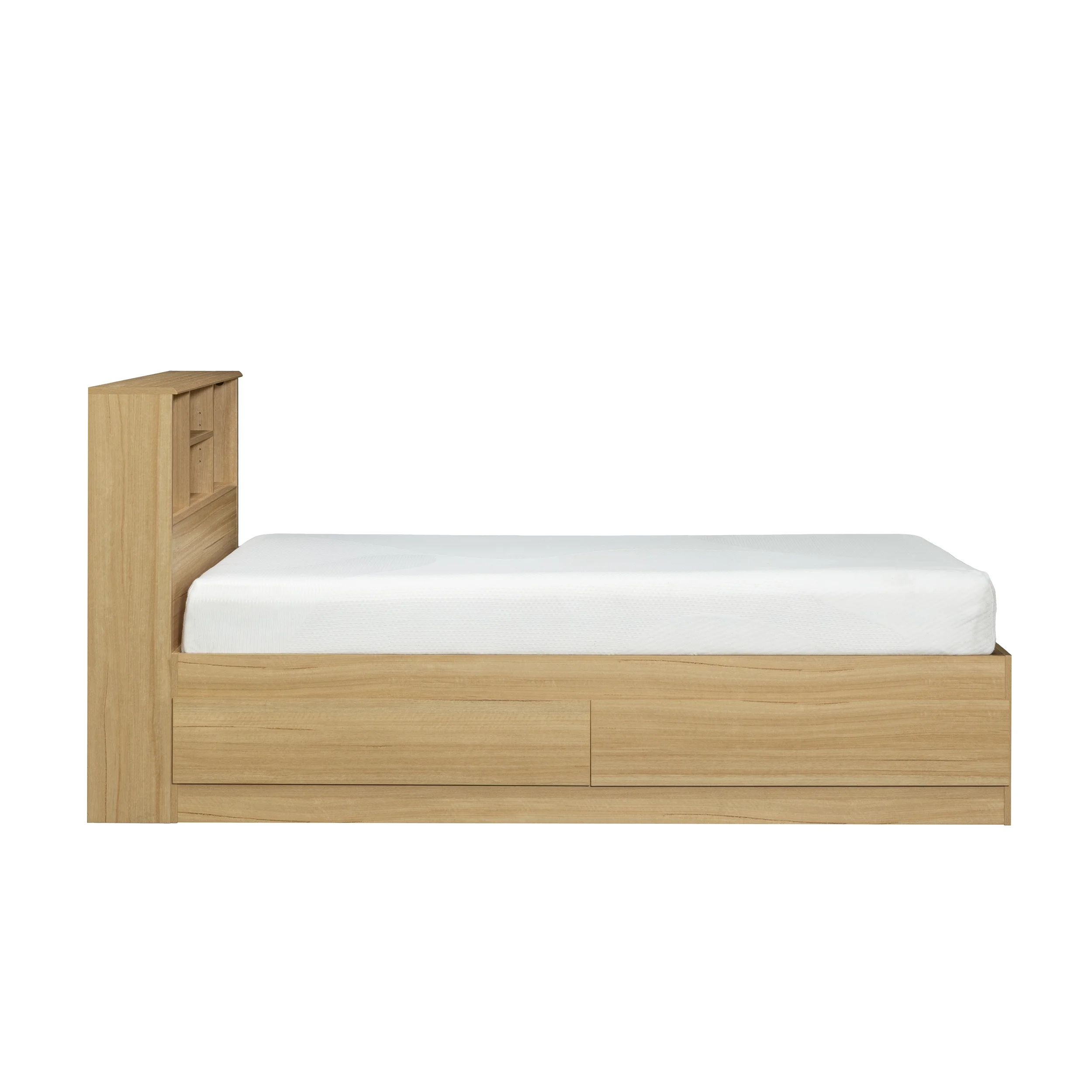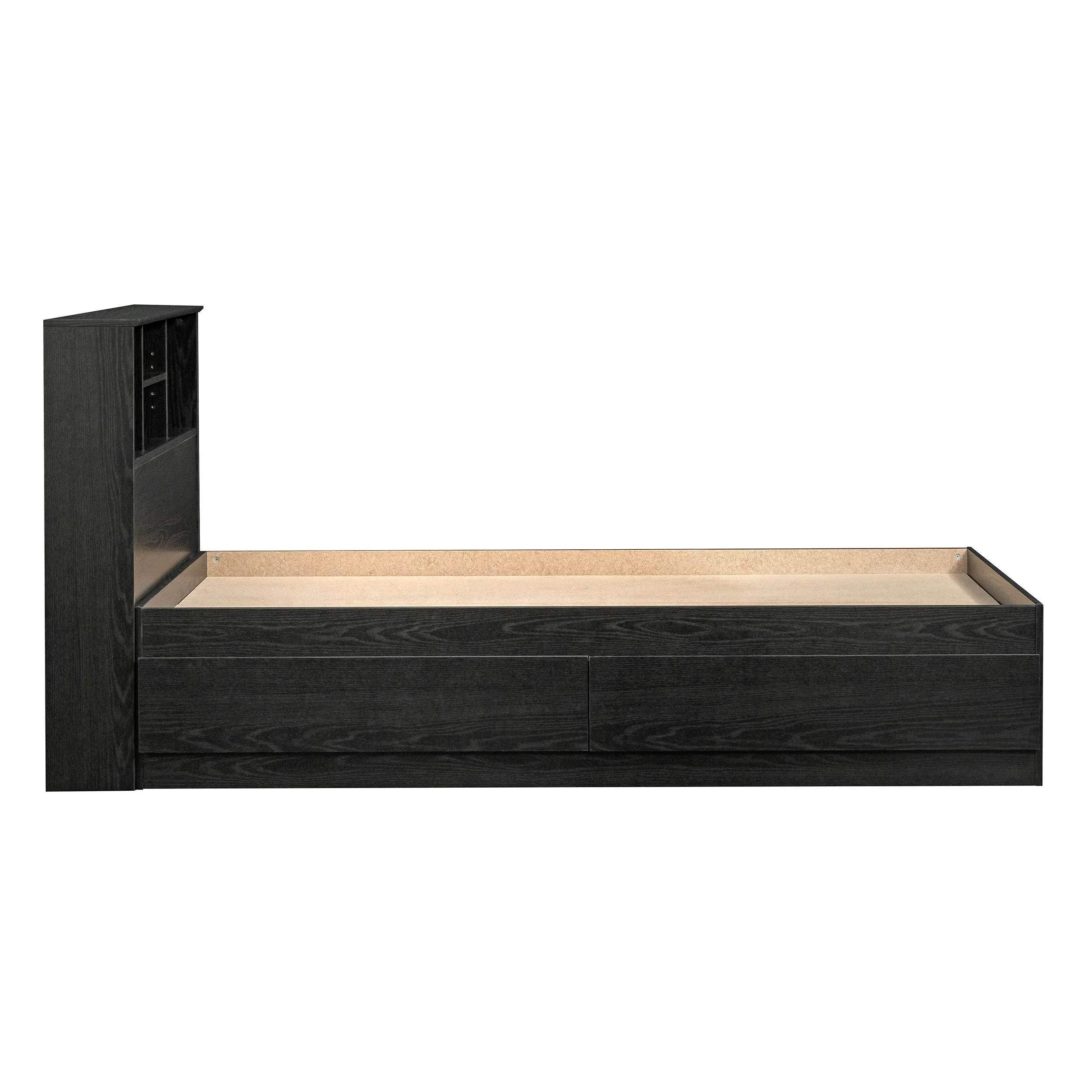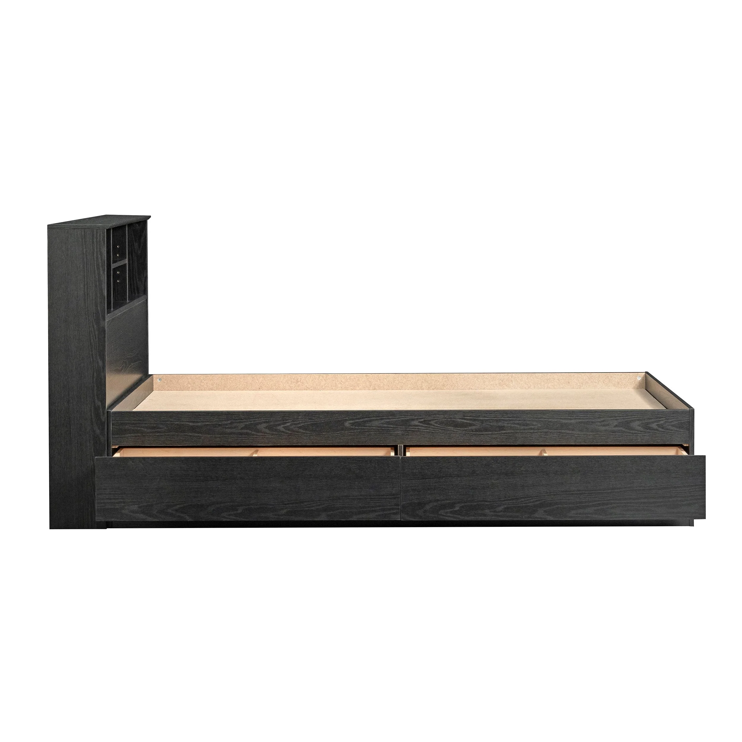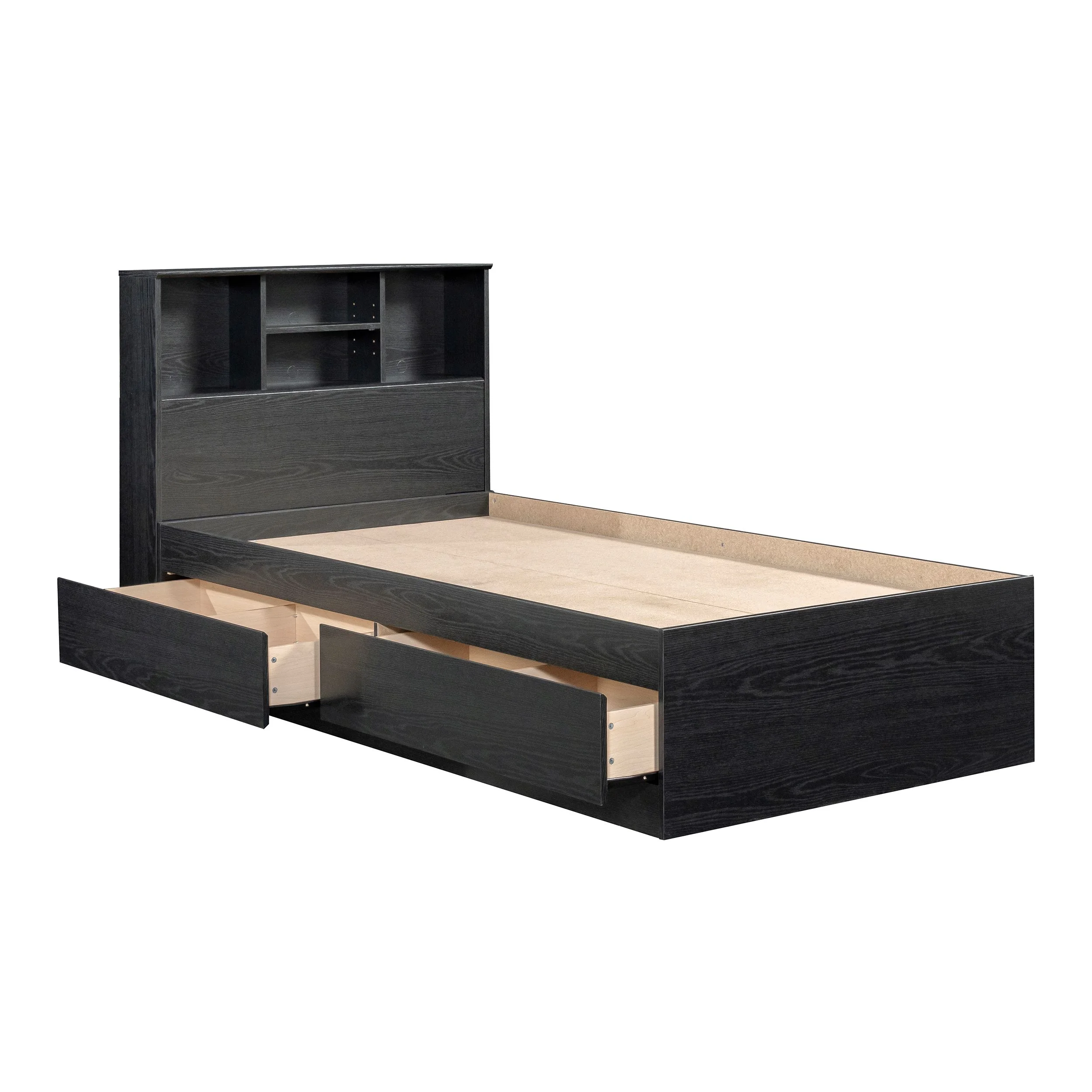 - Adjustable center headboard shelf with 2 open bookshelves