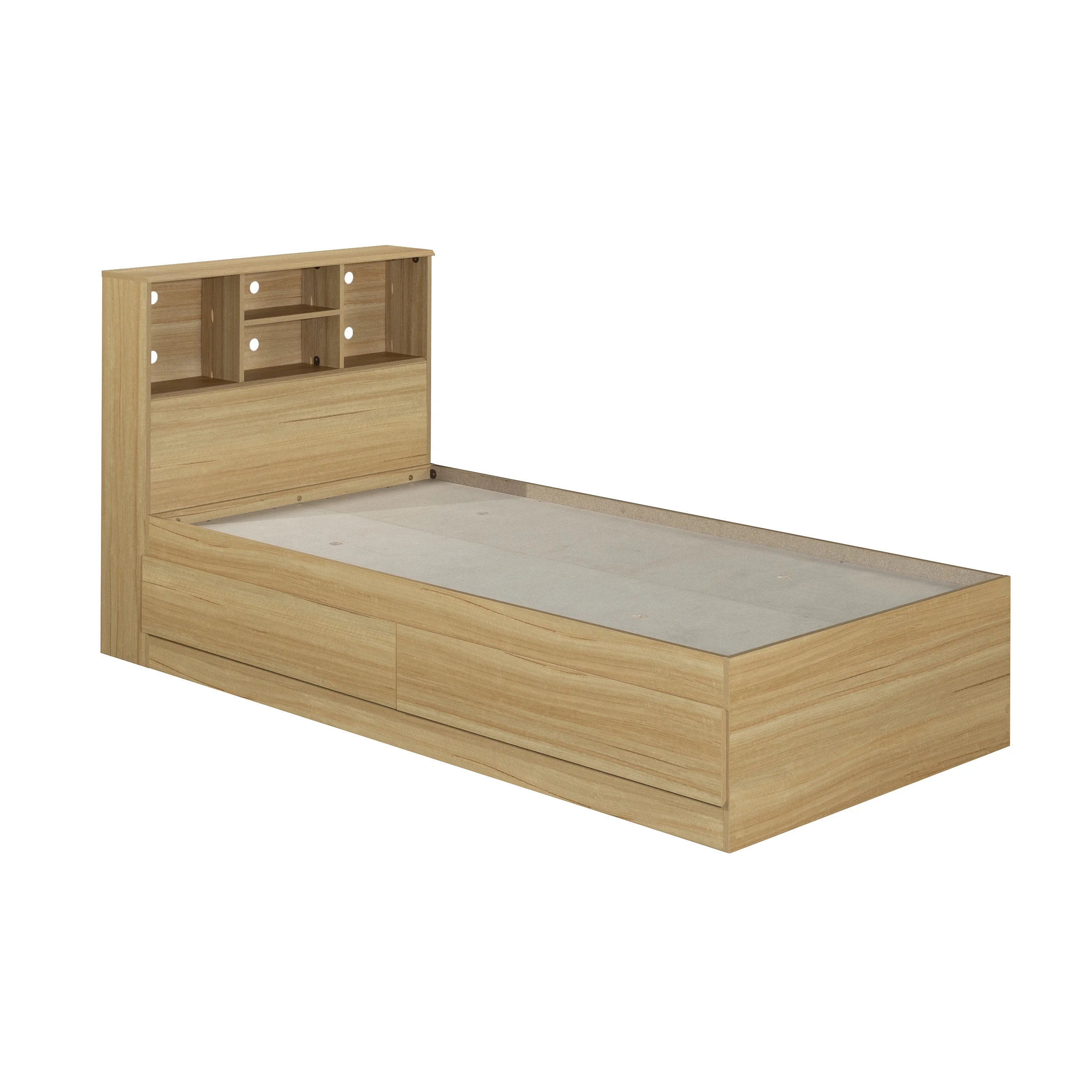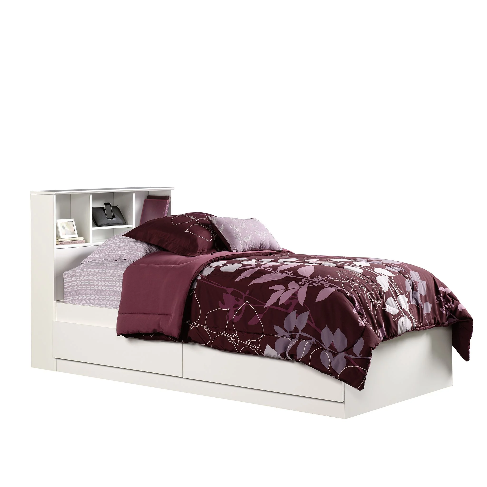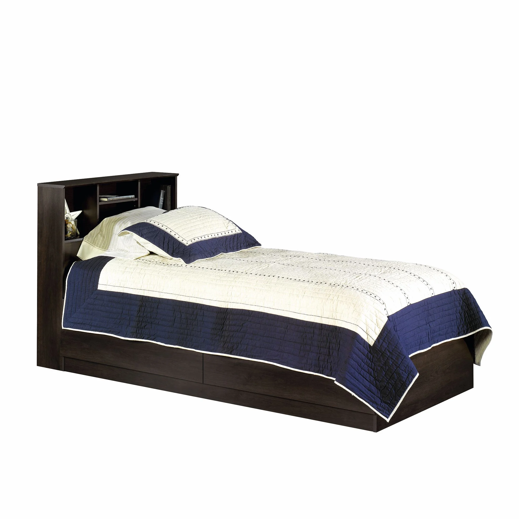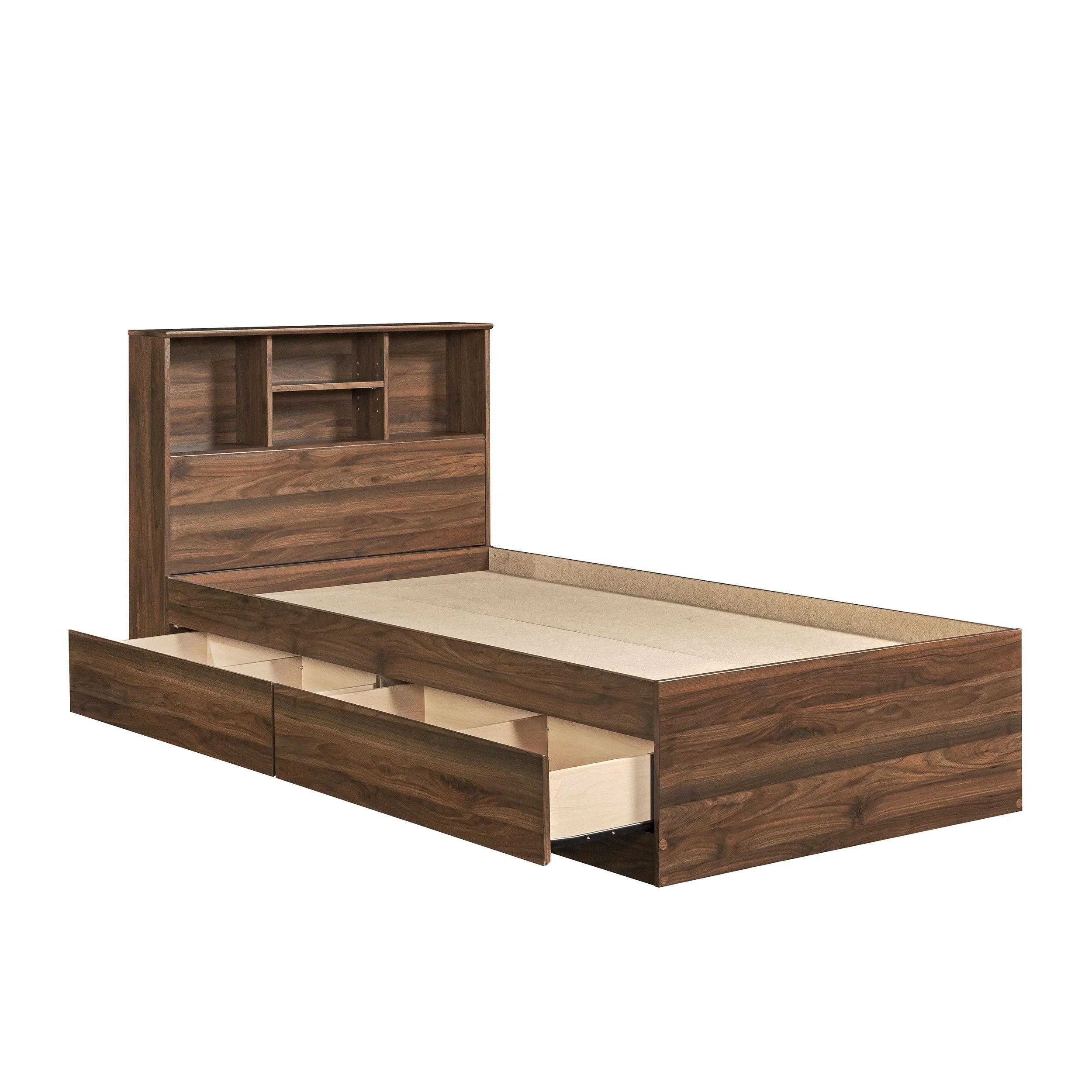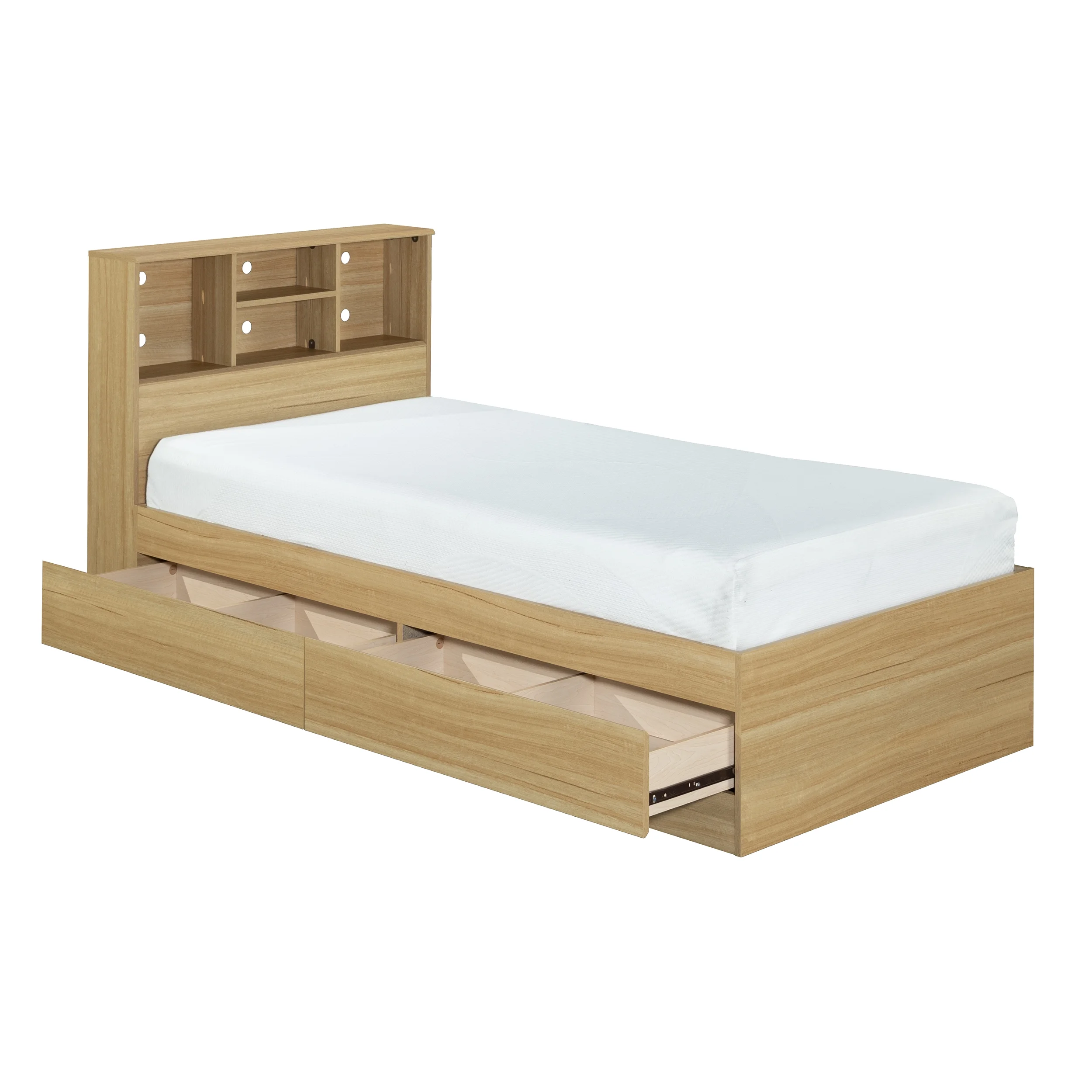 - Adjustable center headboard shelf with 2 open bookshelves