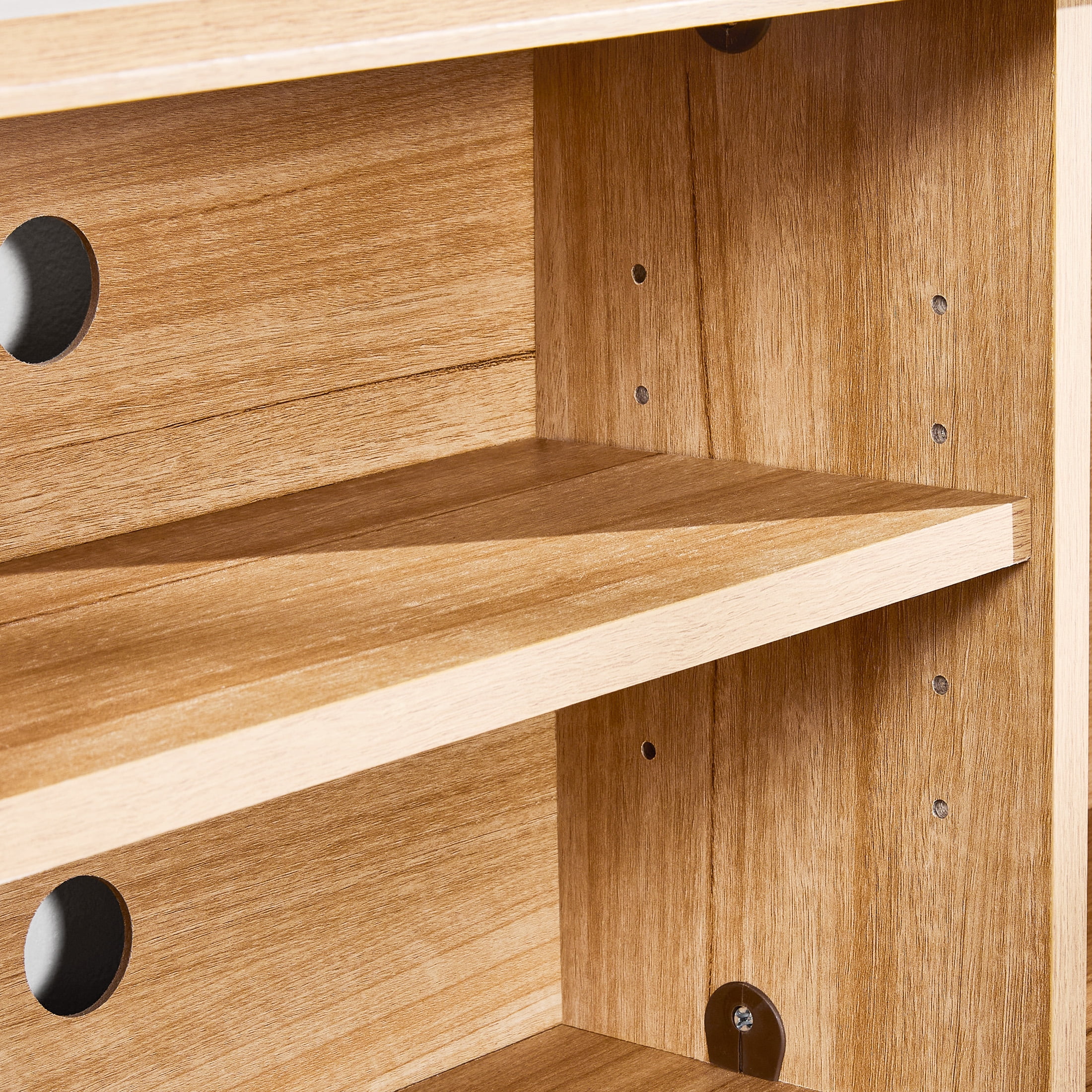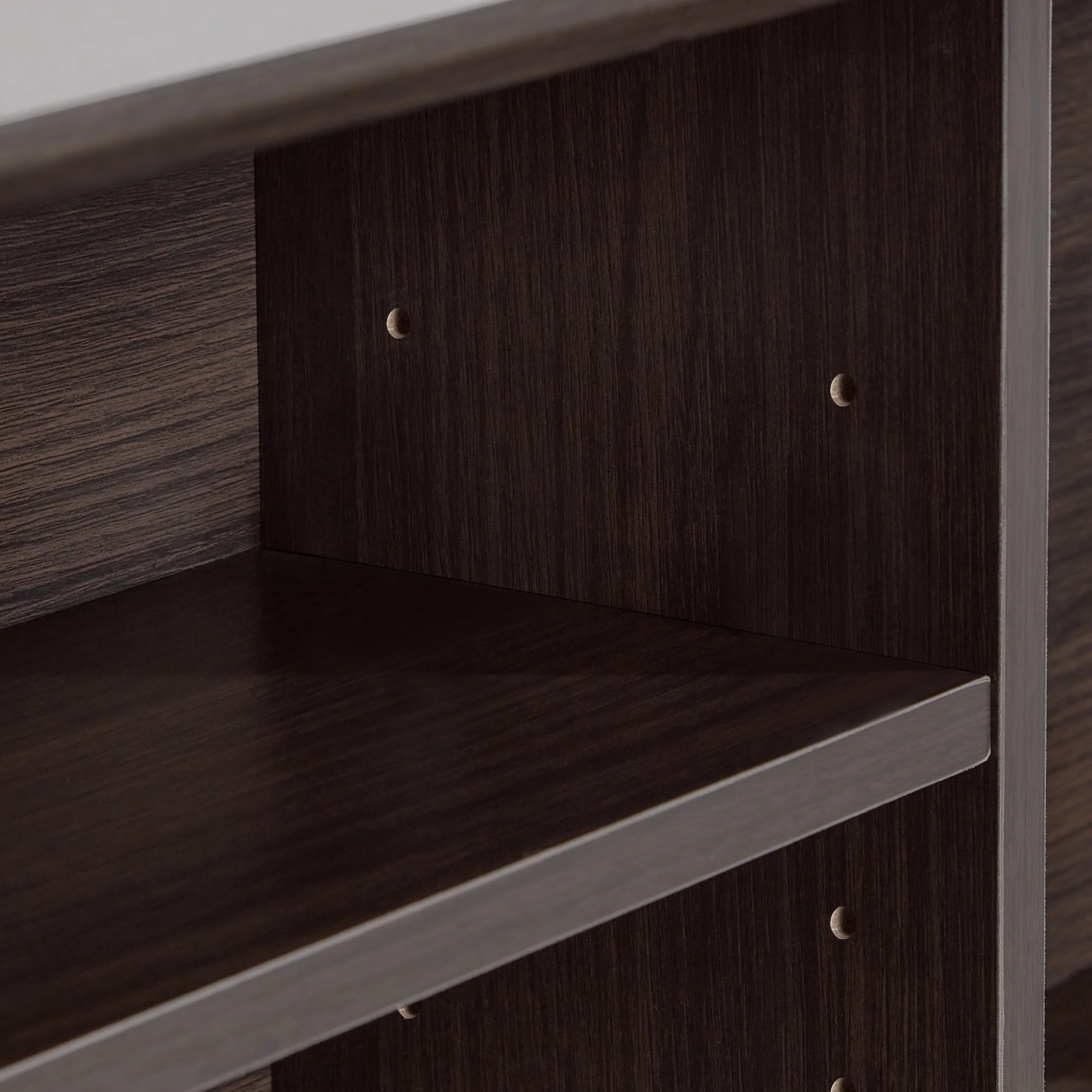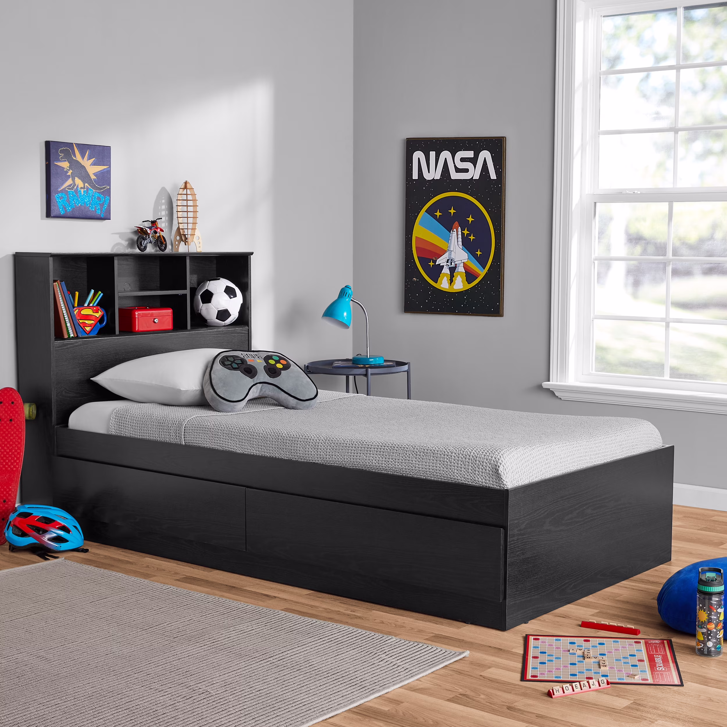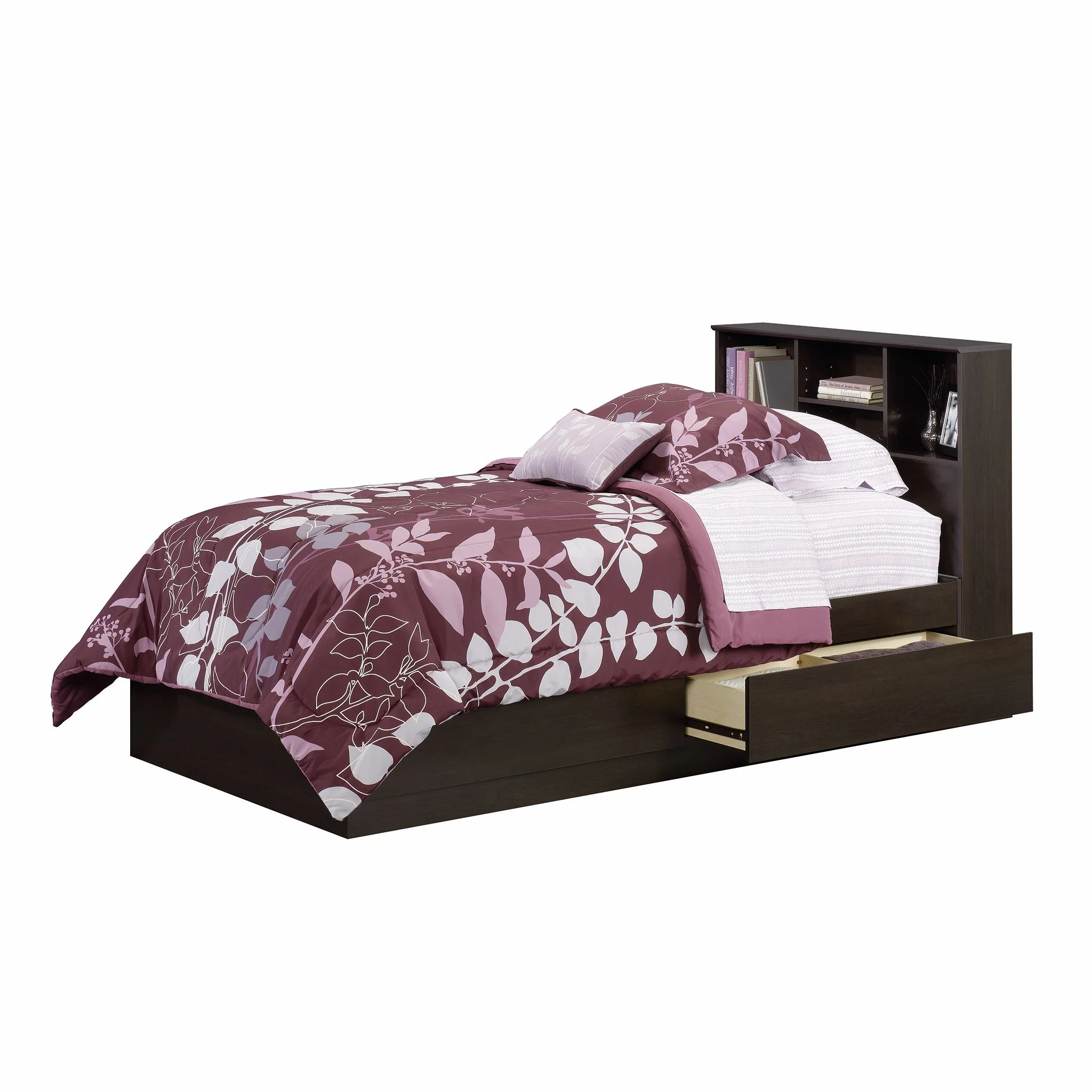 - Adjustable center headboard shelf with 2 open bookshelves