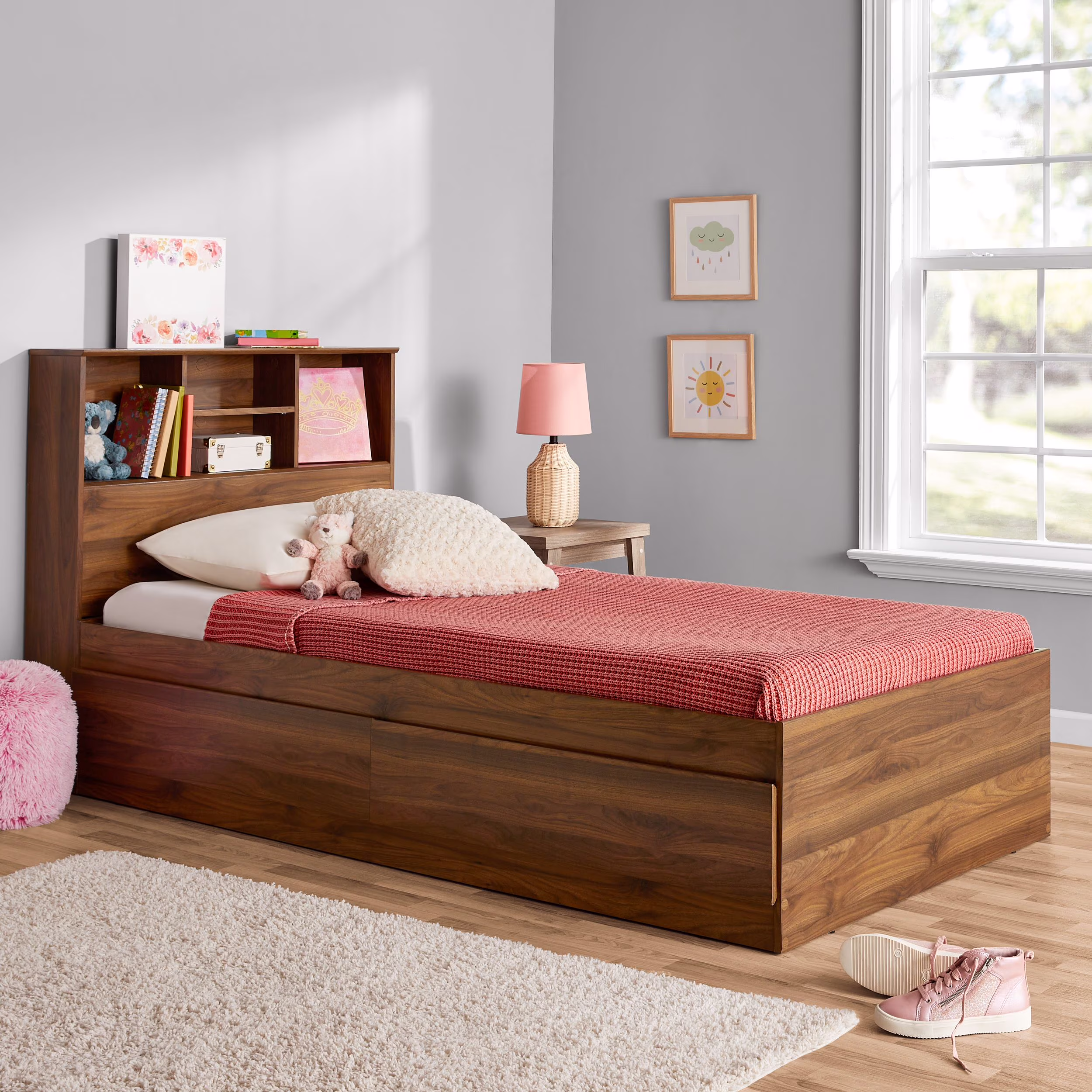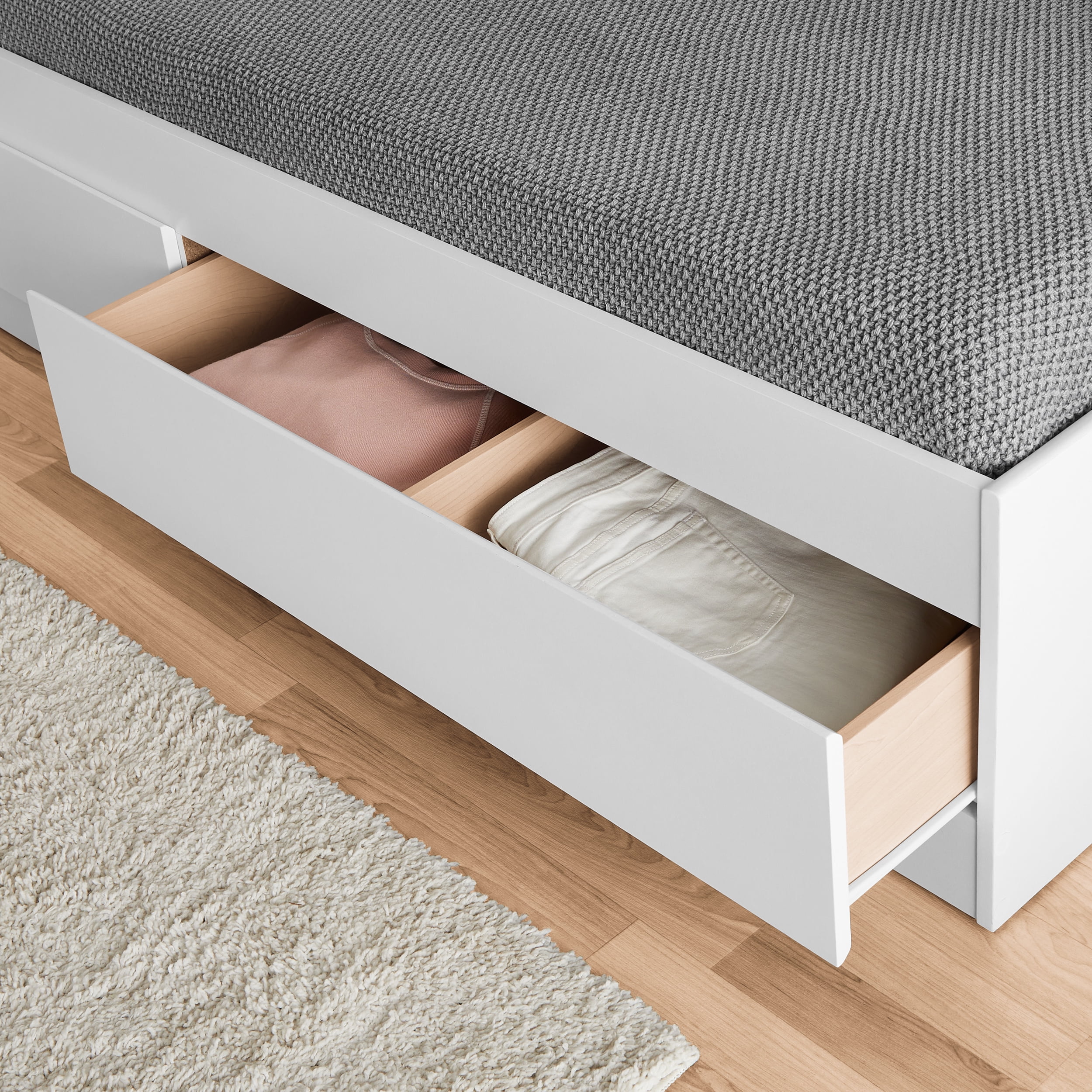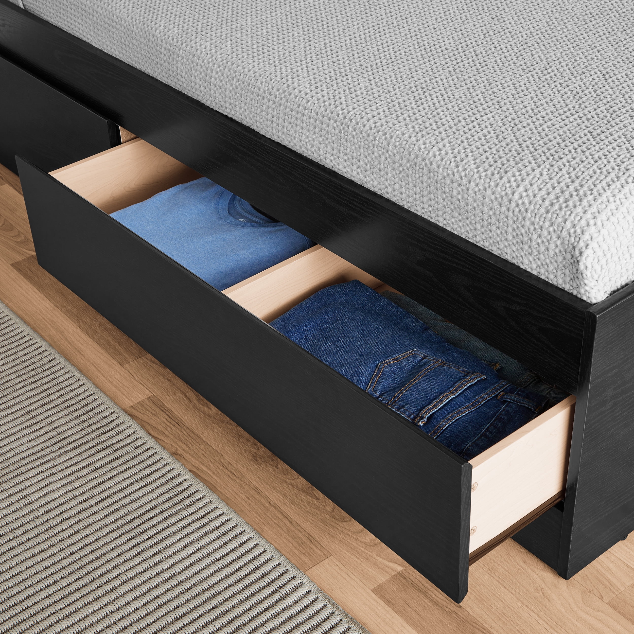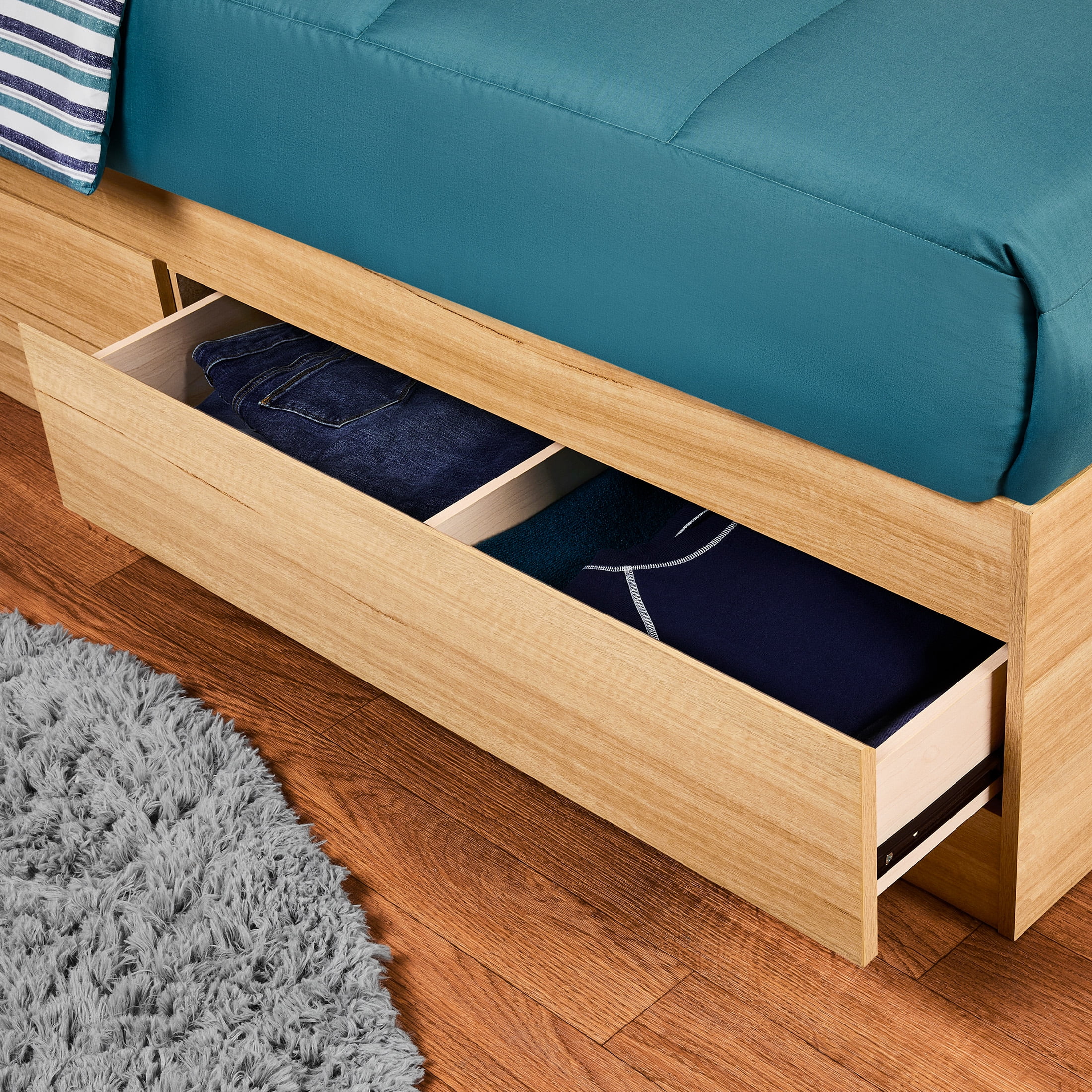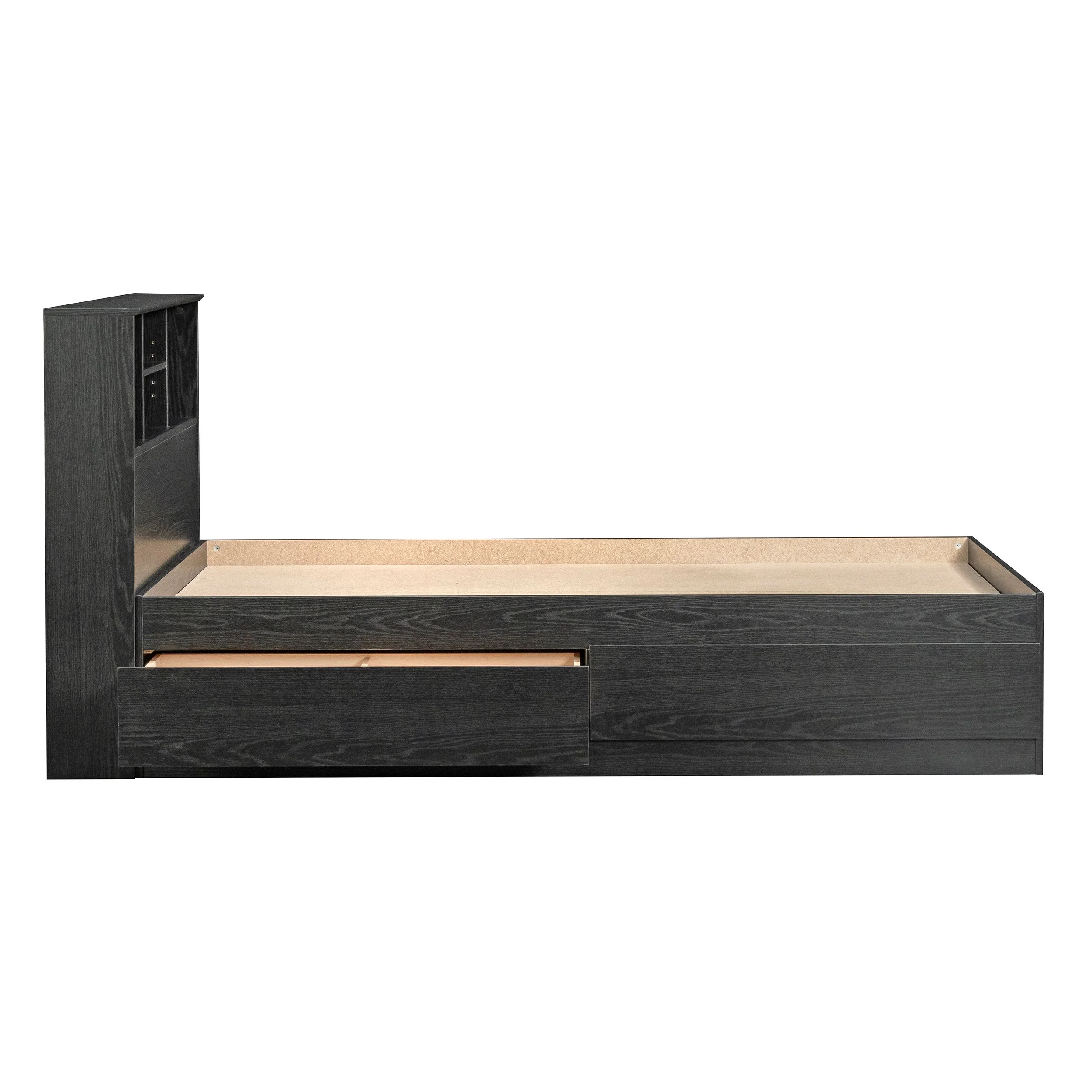 - Drawers can be fastened on either side of bed