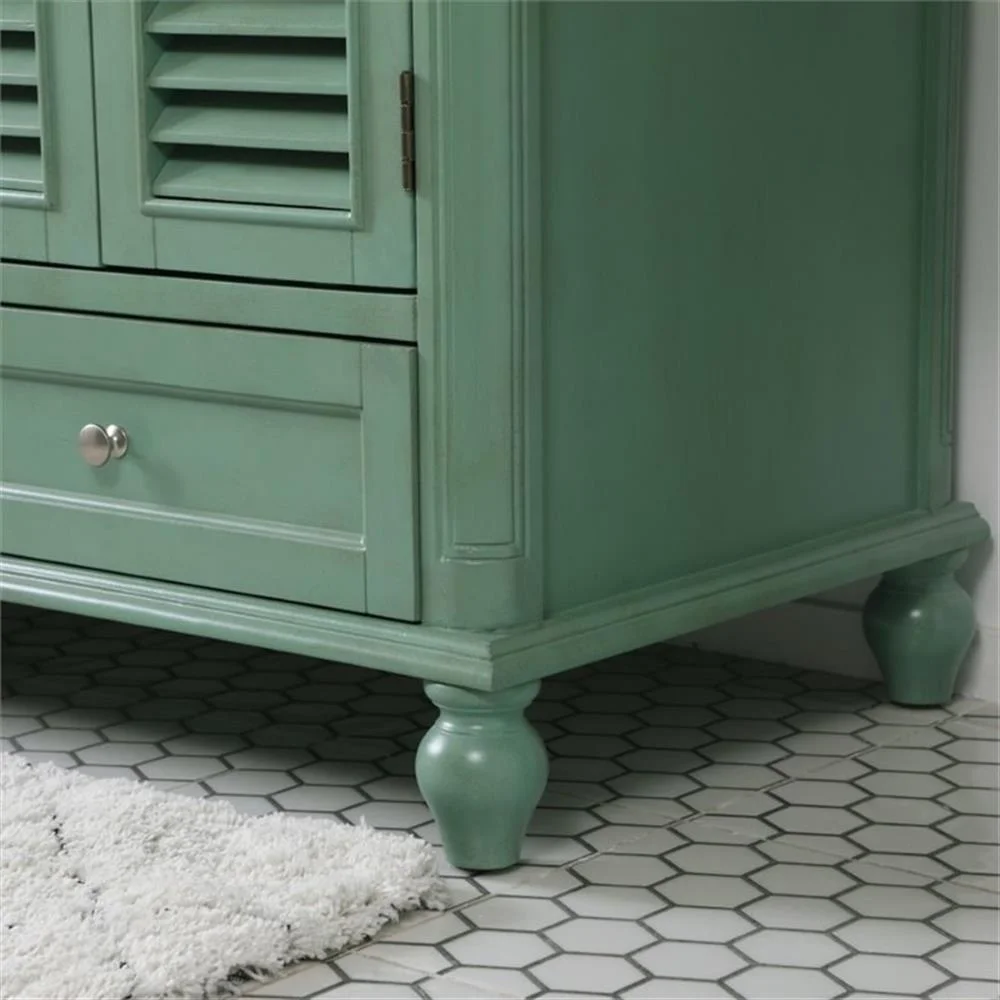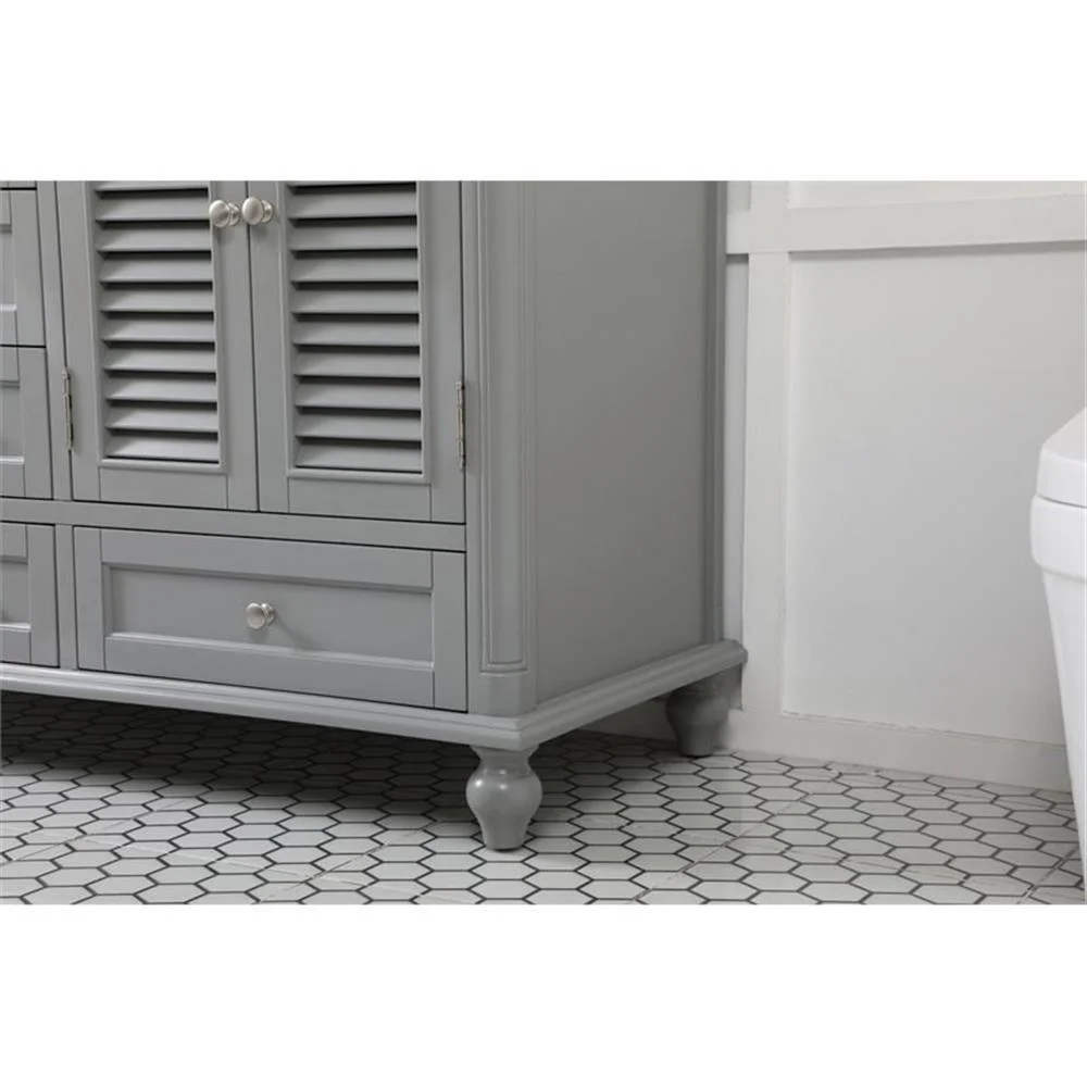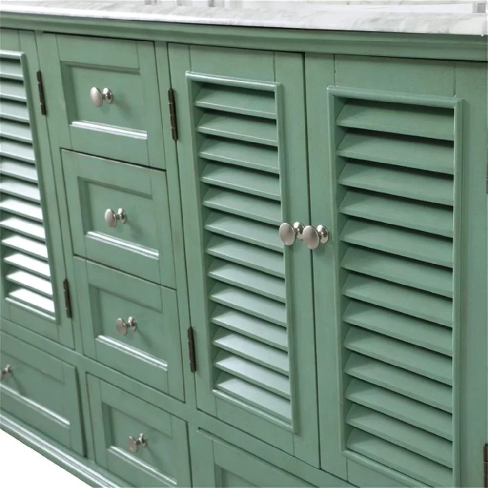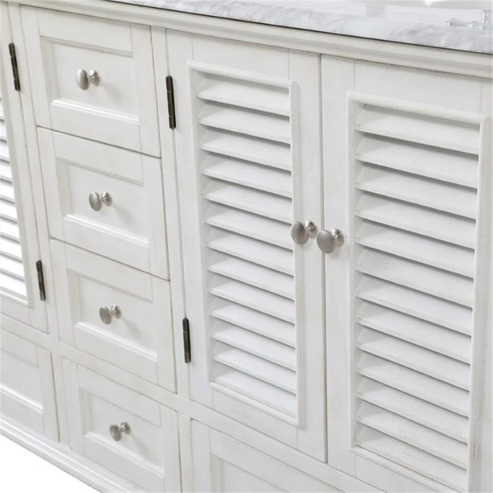 Never compromise beauty--the Rhodes collection stunning vanity in an antique white finish will add lovely sophistication and complement any bathroom or powder room, while utilizing its charm and function to provide you with ample storage spaces. Brushed nickel knobs gently adorn the four shuttered cabinet doors, two ample sized drawers at the base, and four center drawers allowing for you to store away all your bathroom essentials. The Carrara white marble countertop, porcelain undermount sink, dignified subtle engravings on the side edges, and rounded legs all come together to create contemporary beauty. The two porcelain sinks will allow for two people to get ready concurrently without getting in the way of another. Work with your space, and design a beautiful room, no matter the size.