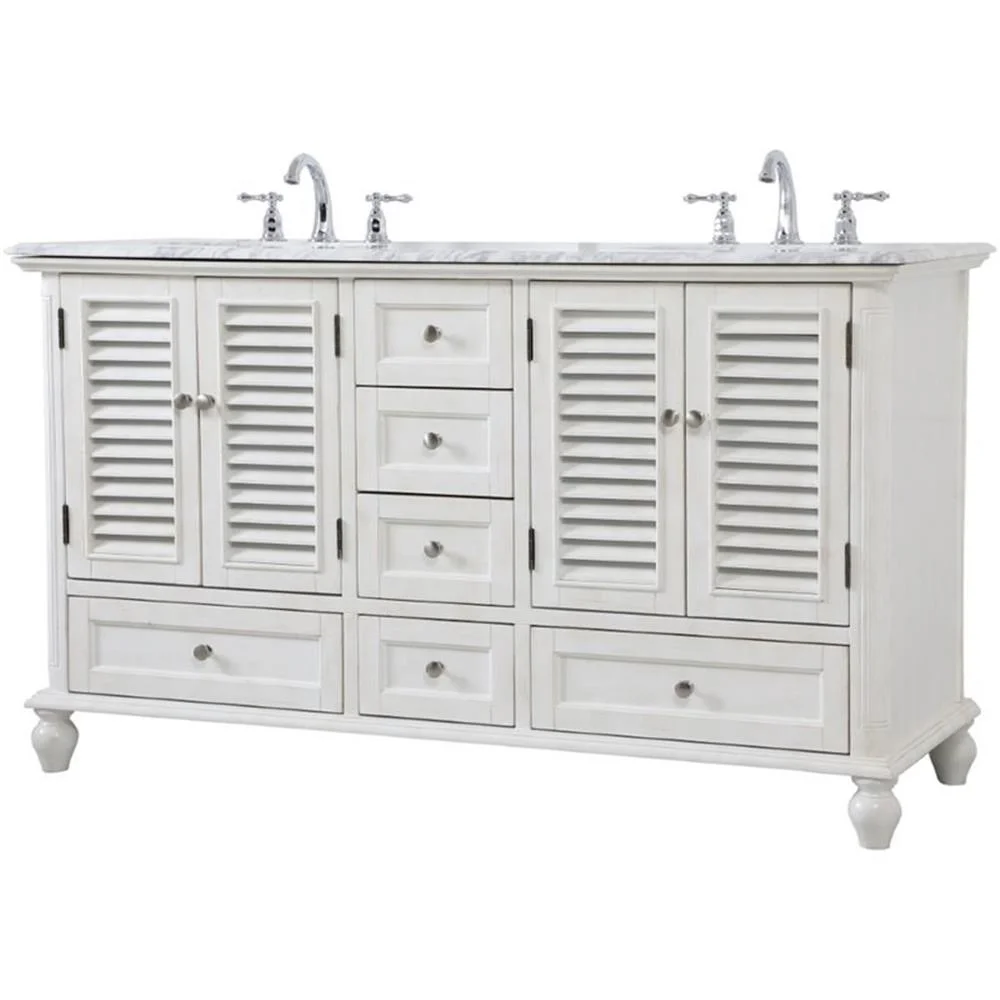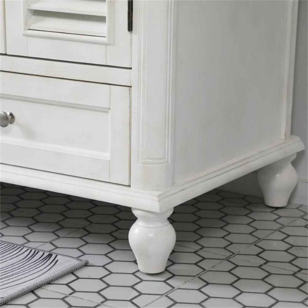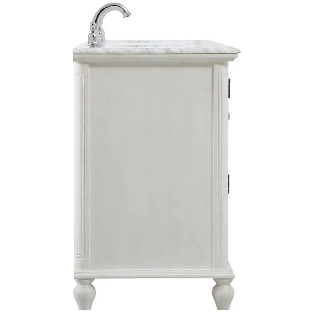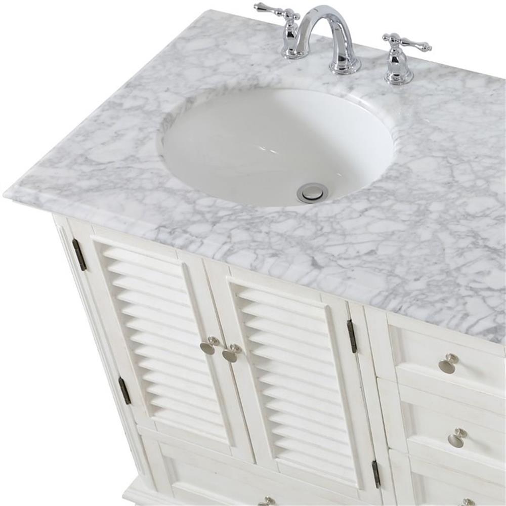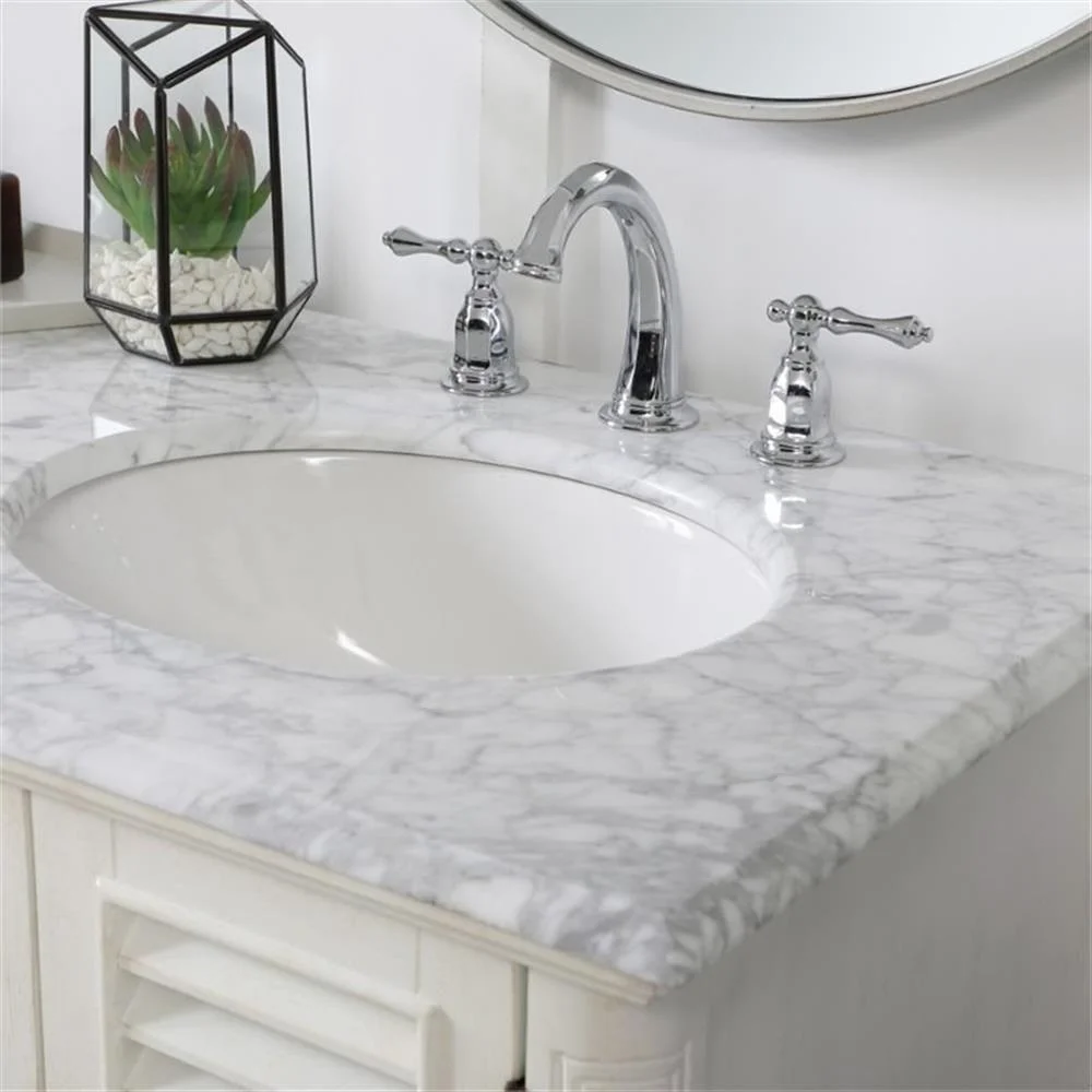 - distressed antique white finish with a luxurious Carrara White marble countertop