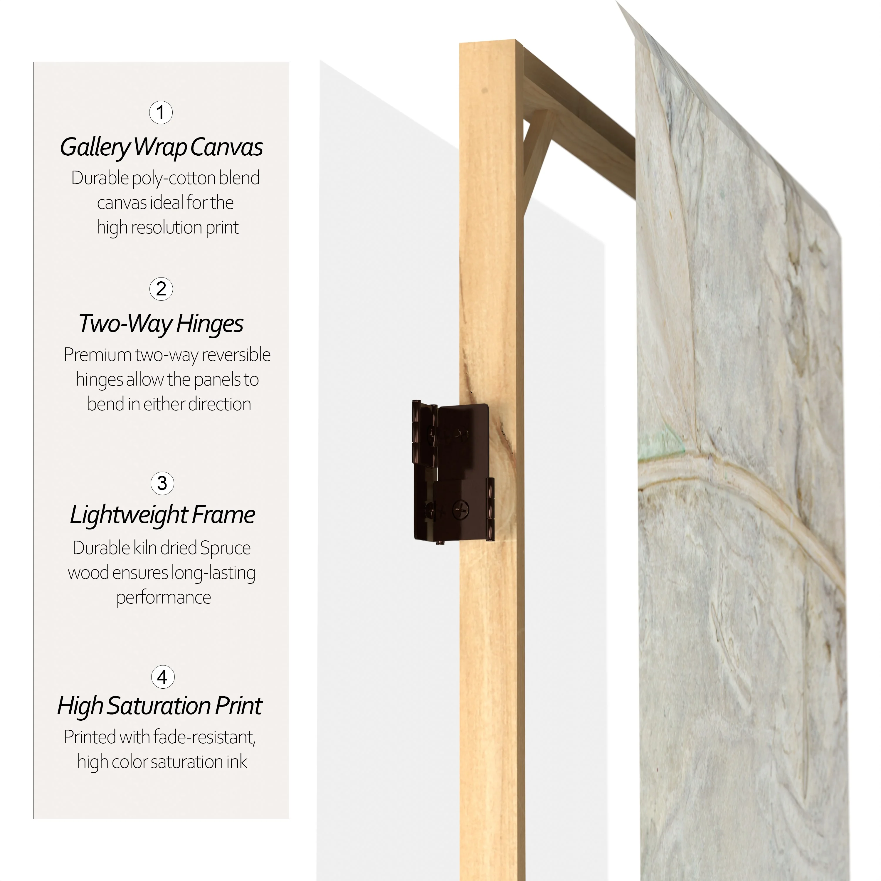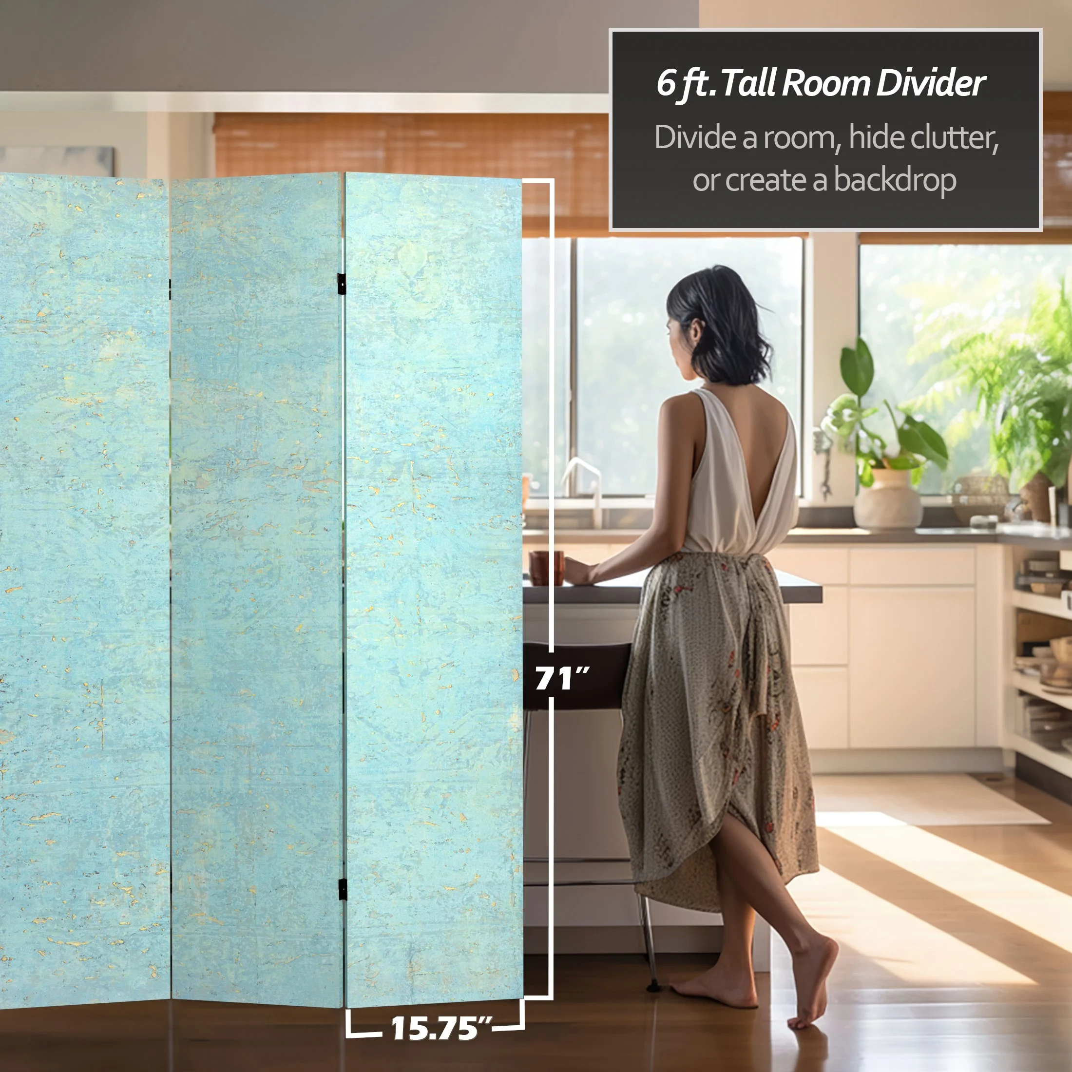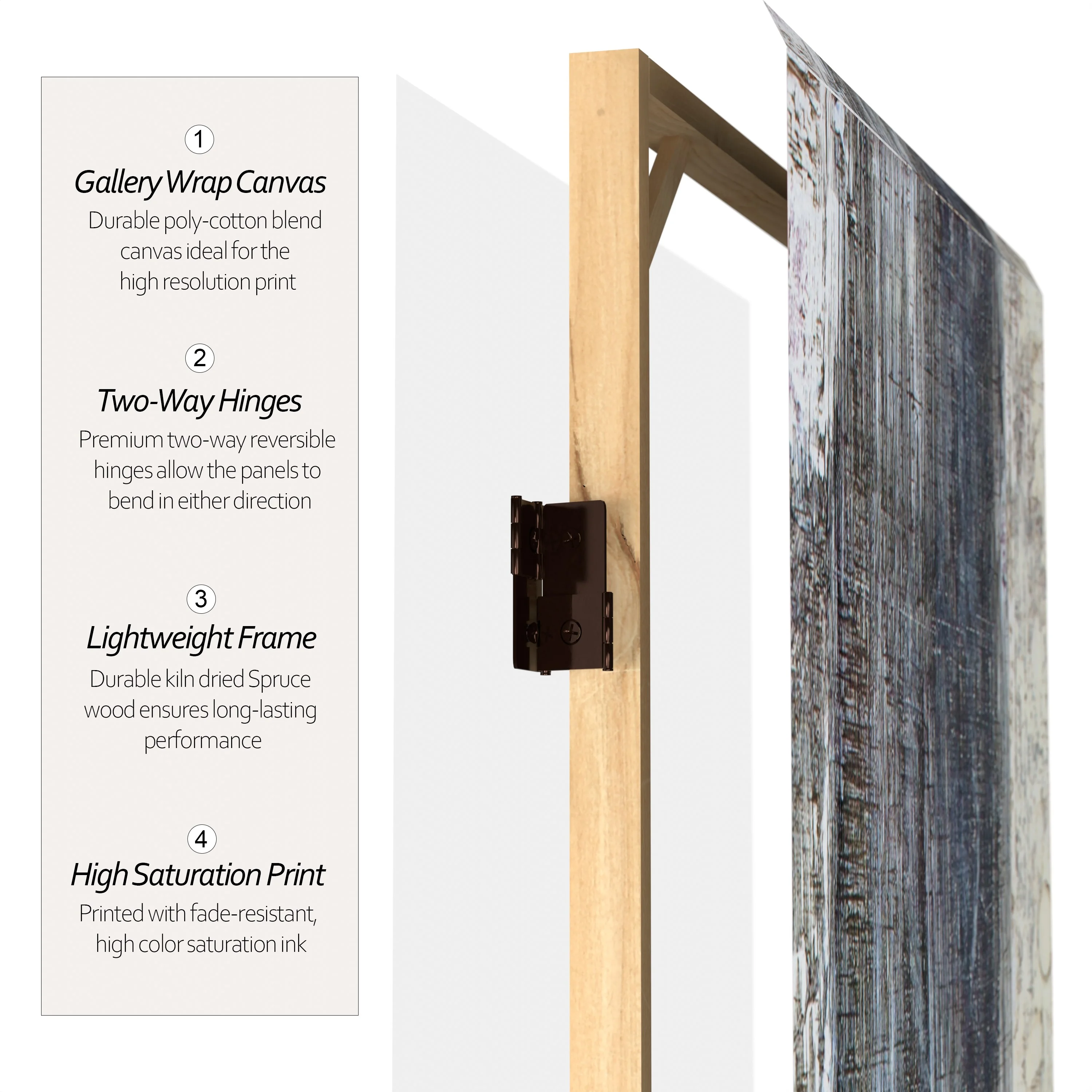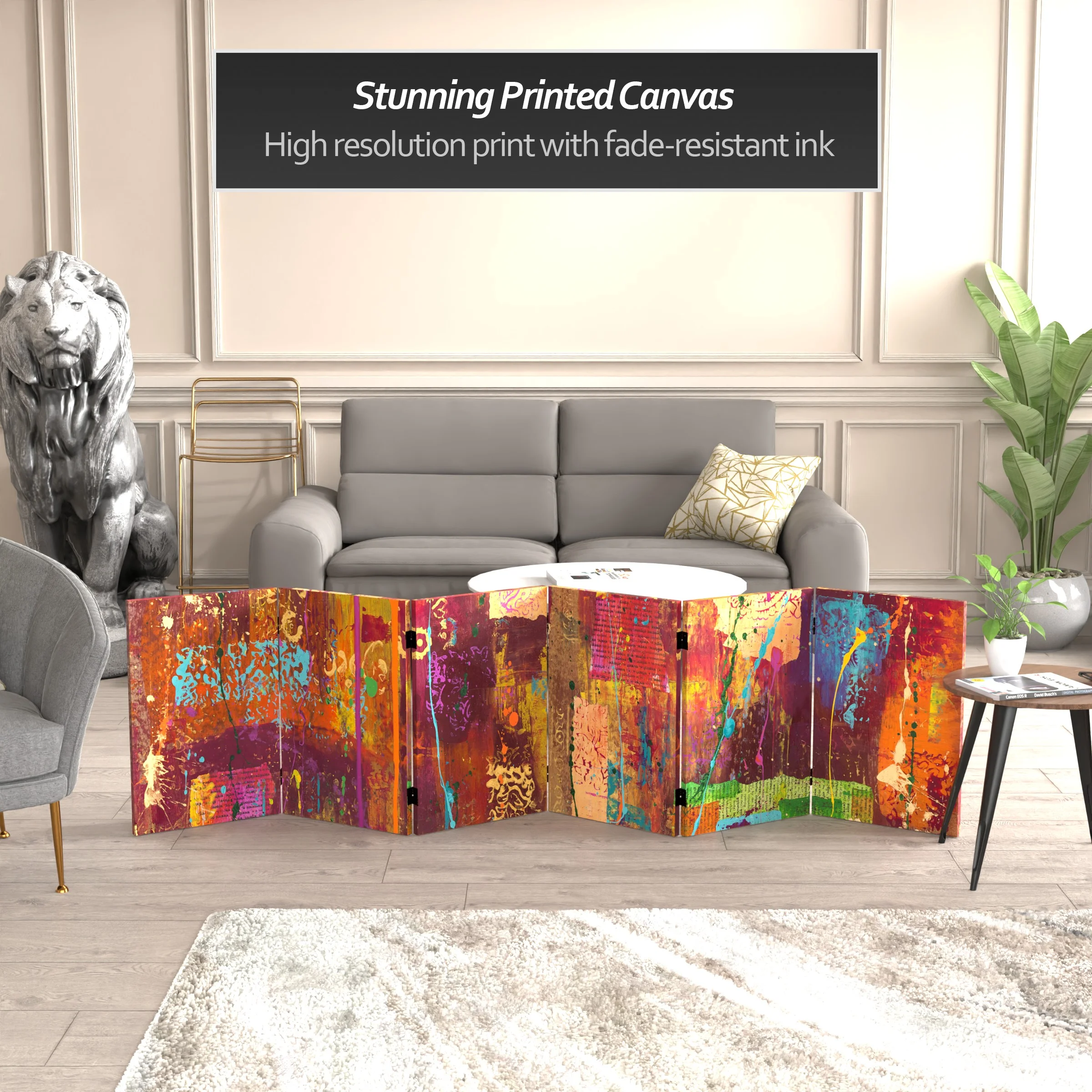 Let your mind take a walk through the woods with this six panel canvas room divider. The earthy design instantly transports you to the winter woods of New England.Foldable six panel screenDouble-SidedPrinted and stretched canvas over wood frameExclusive designFoldable six panel screen. Double-Sided. Printed and stretched canvas over wood frame. Exclusive design.