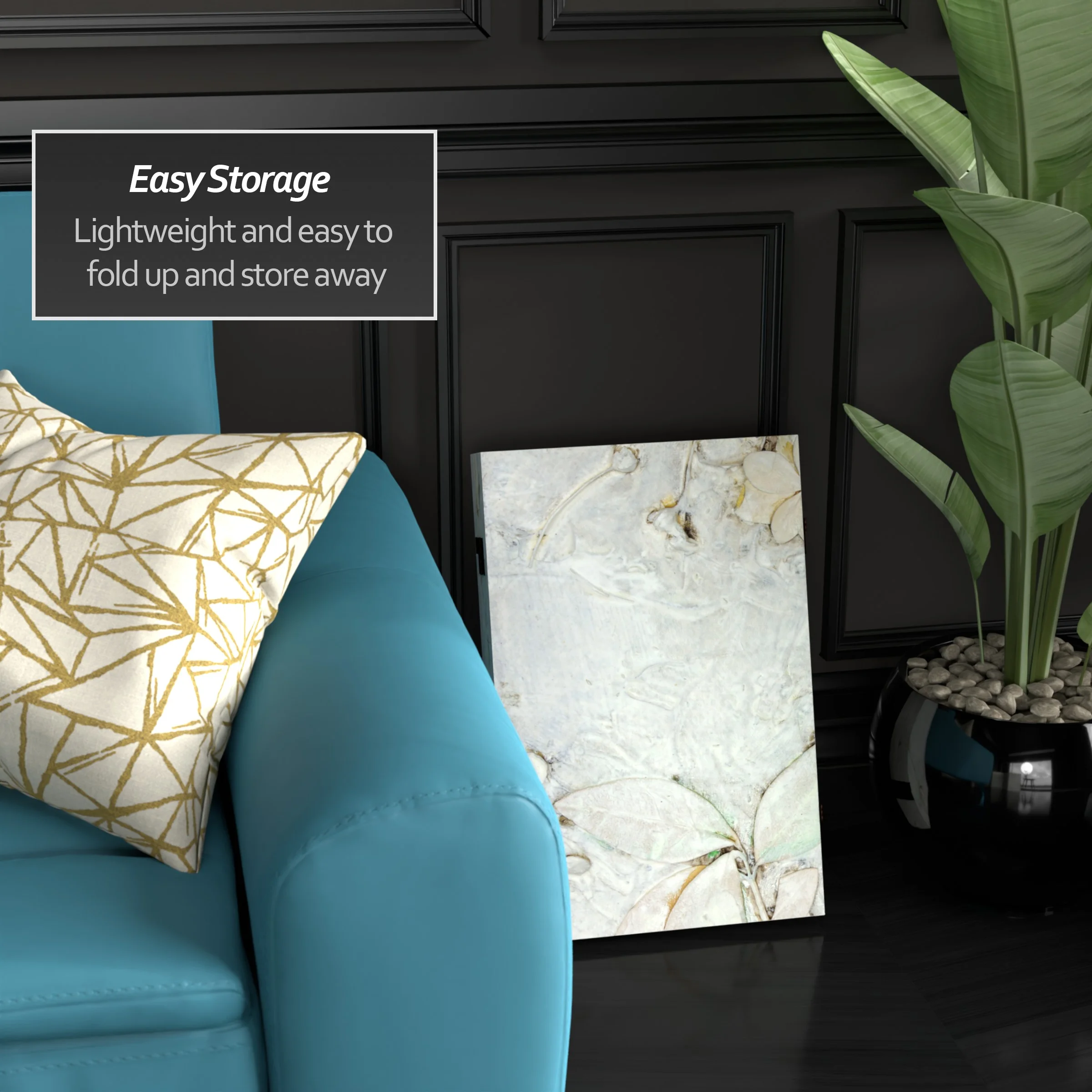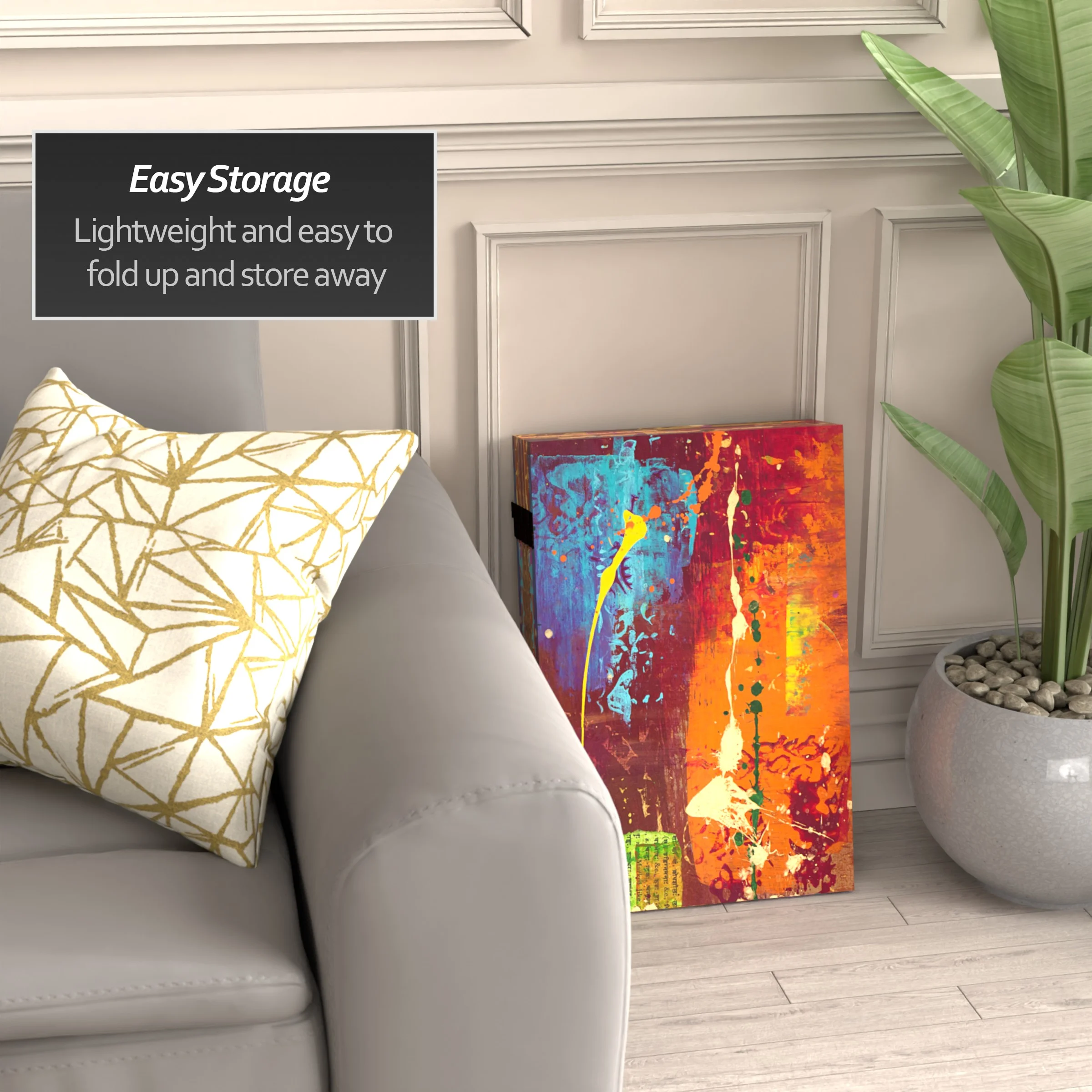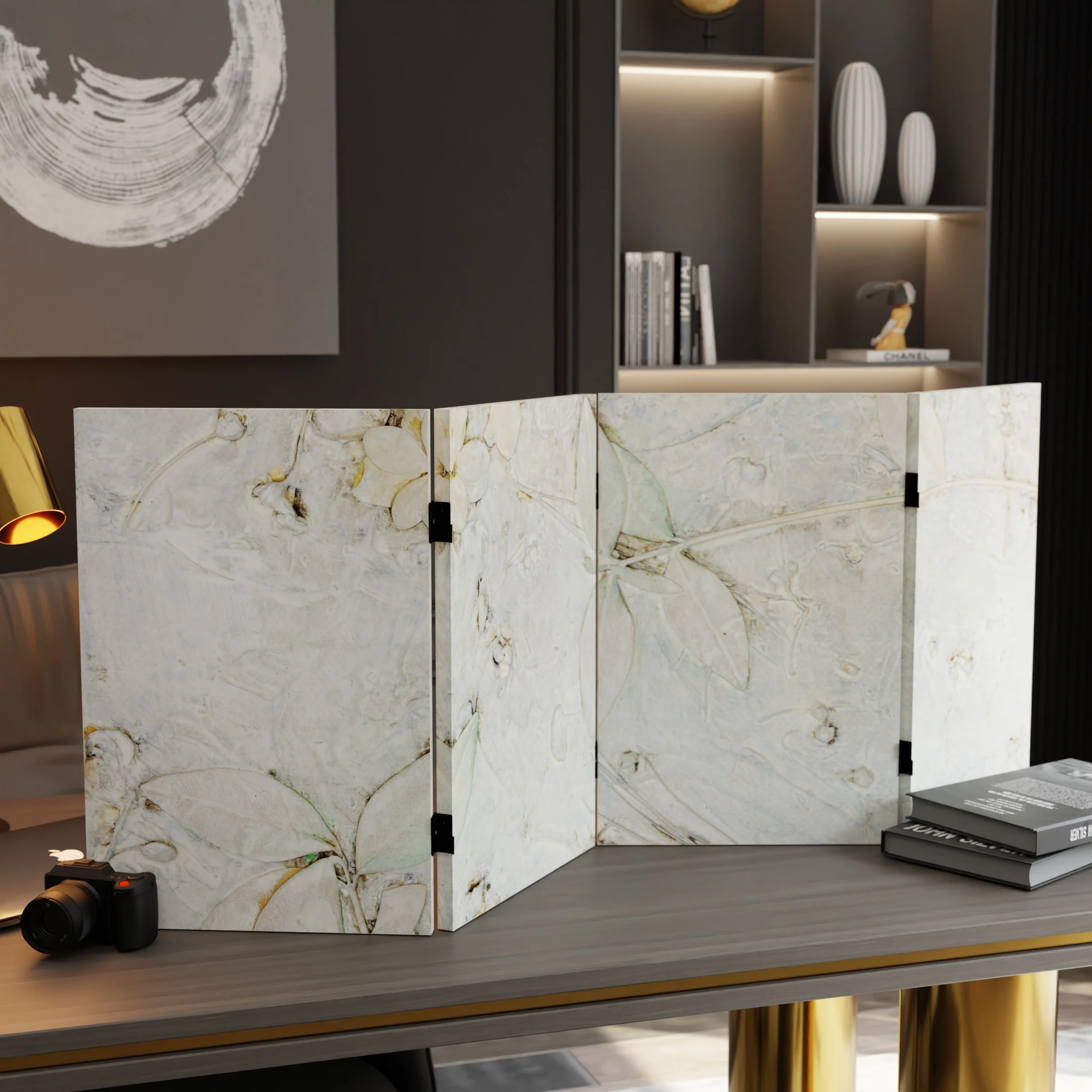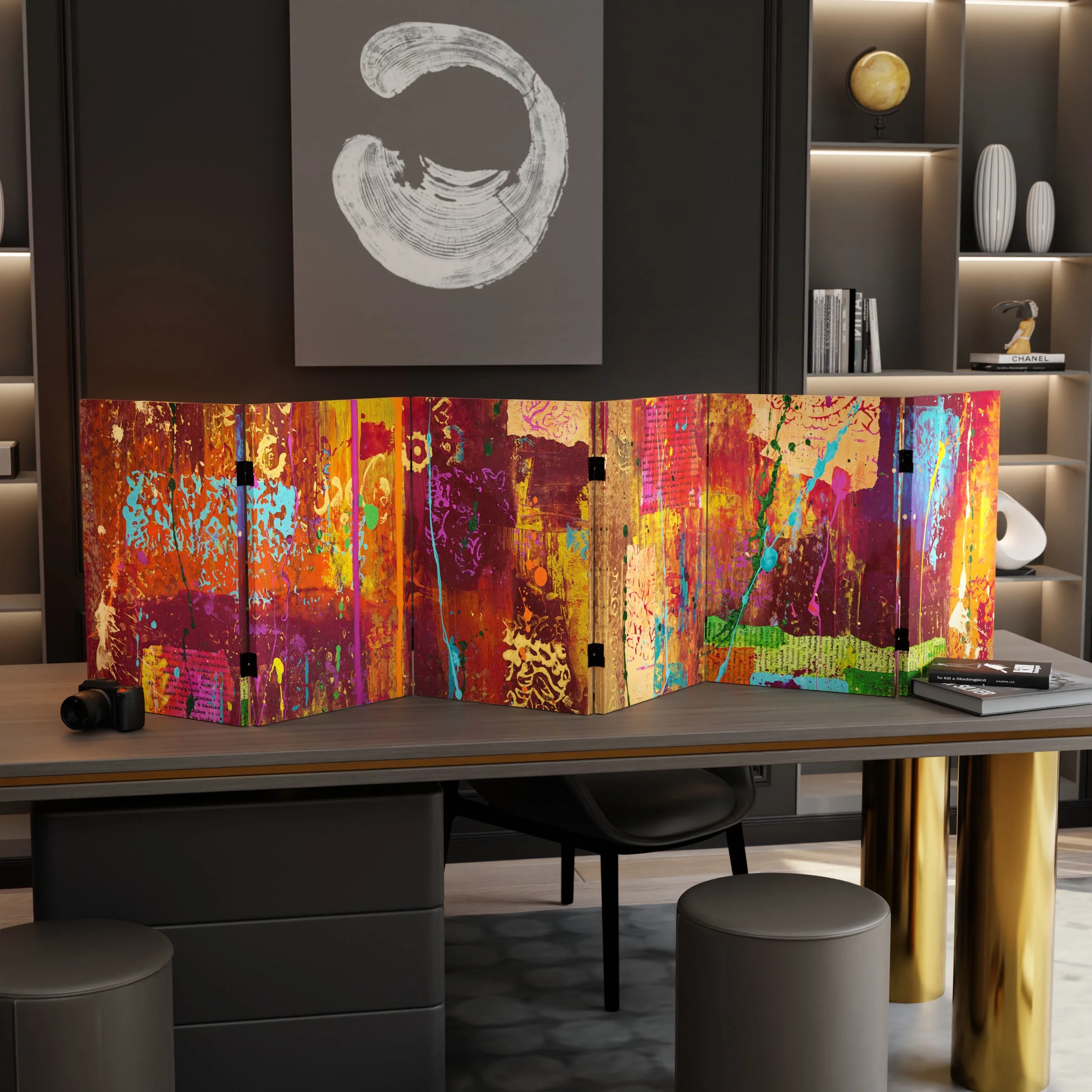 Let your mind take a walk through the woods with this six panel canvas room divider. The earthy design instantly transports you to the winter woods of New England.Foldable six panel screenDouble-SidedPrinted and stretched canvas over wood frameExclusive designFoldable six panel screen. Double-Sided. Printed and stretched canvas over wood frame. Exclusive design.