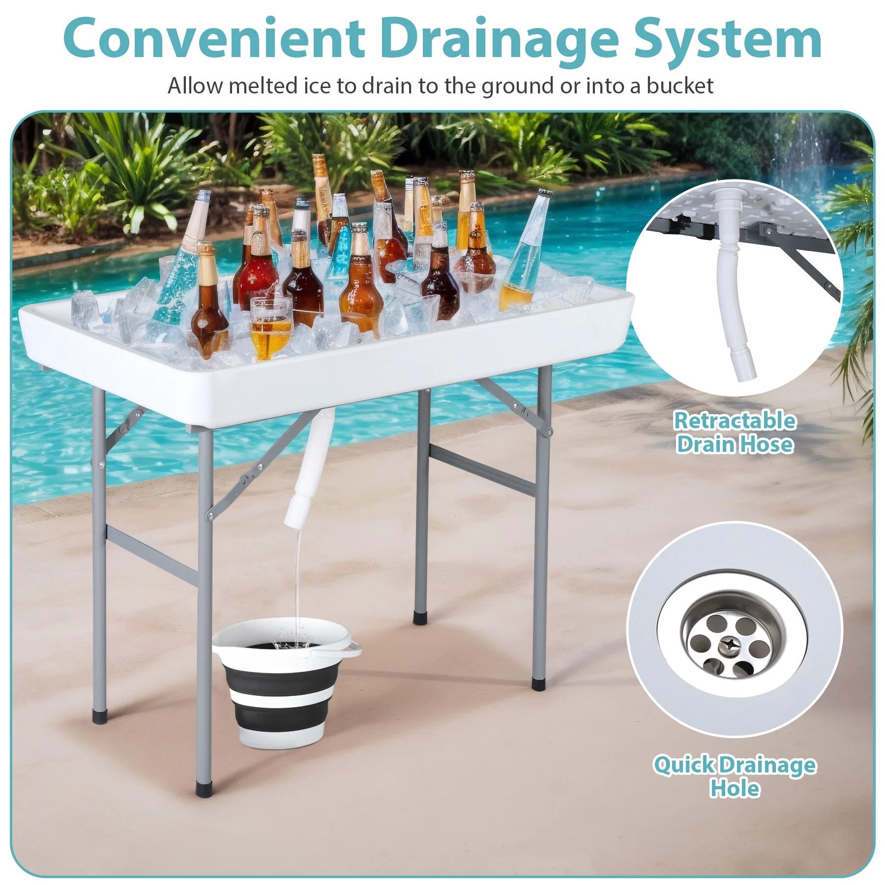 - The tabletop has a central drain that you can plug during use and easily empty with the included drain hose and bucket when the party ends.