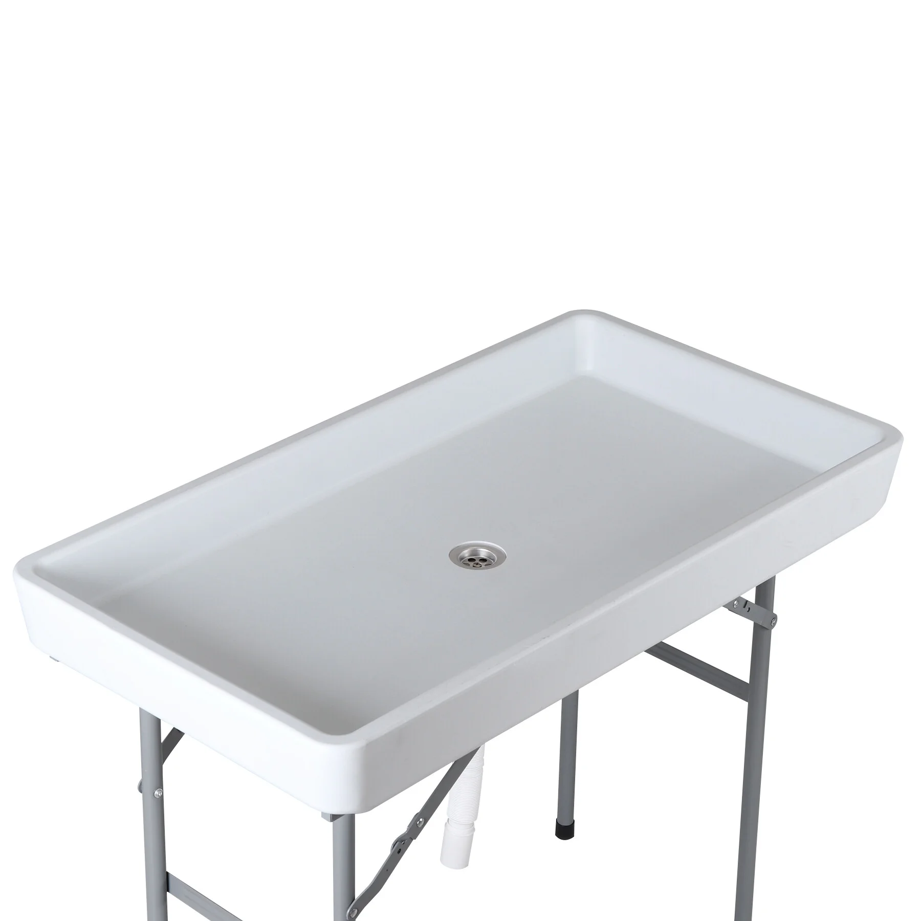 - Built with a high-density polyethylene surface, this ice table resists cold, heat, and corrosion for durable use, while its reinforced metal legs with foot pads support weights up to 440 lbs.