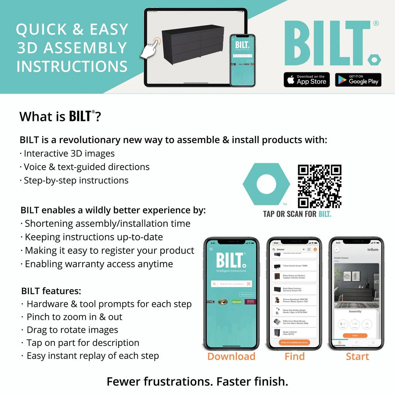 - 3D Interactive assembly through BILT: Instructions for this product are available through the free BILT app. Find a revolutionary way to assemble & install product with voice, text, & interactive animated images