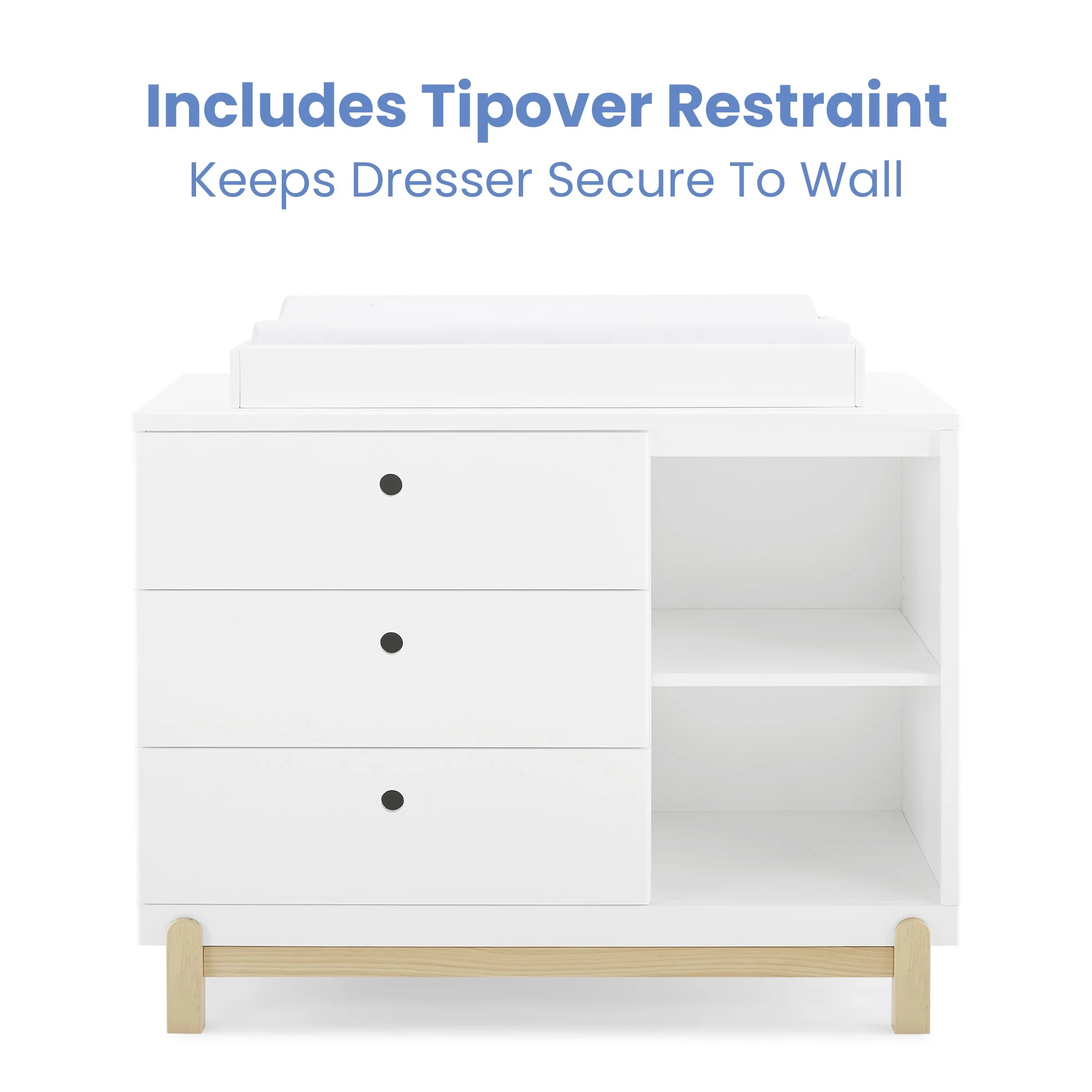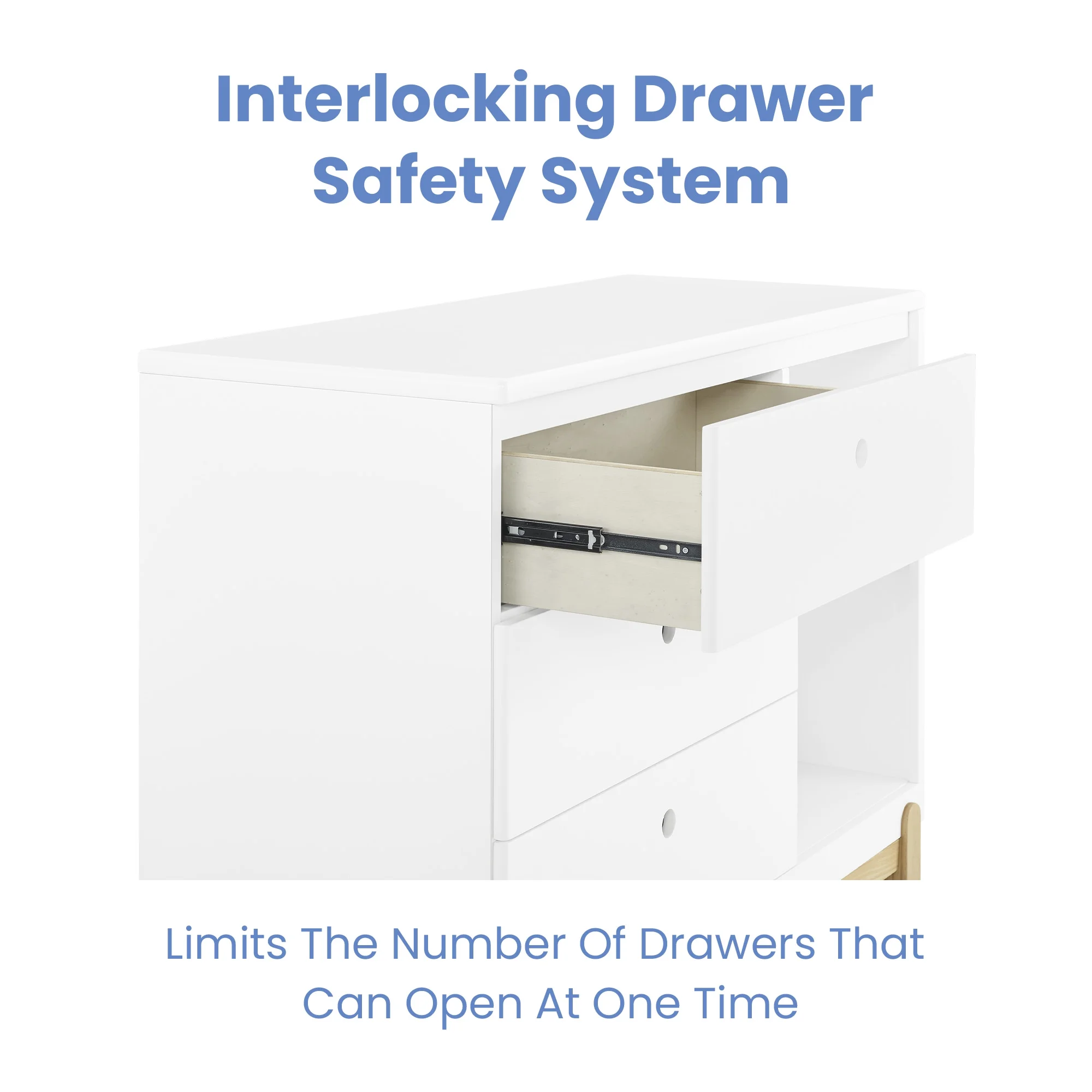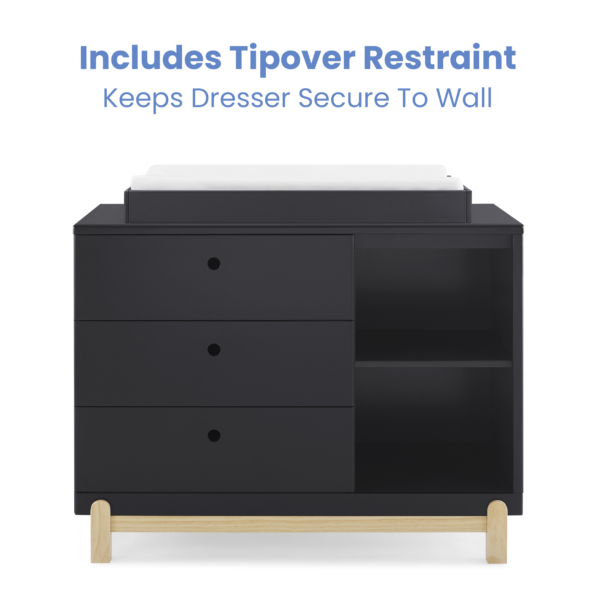 Bring style and convenient storage to your little one's bedroom with the Poppy 3 Drawer Dresser with Cubbies and Interlocking Drawers by Delta Children. This wood dresser features three drawers to keep shirts, pants and socks, while the other side features two open cubbies to house books, bins or toys. Modern and playful, this versatile dresser features a natural wood base and feet paired with a contrasting finish on top for a look that works from baby to big-kid. For your child��s safety, this dresser is outfitted with an interlocking drawer system that limits the number of drawers that can be opened at one time. To complete your child��s bedroom, pair the Poppy 3 Drawer Dresser with Cubbies with the Poppy 4-in-1 Convertible Crib by Delta Children.