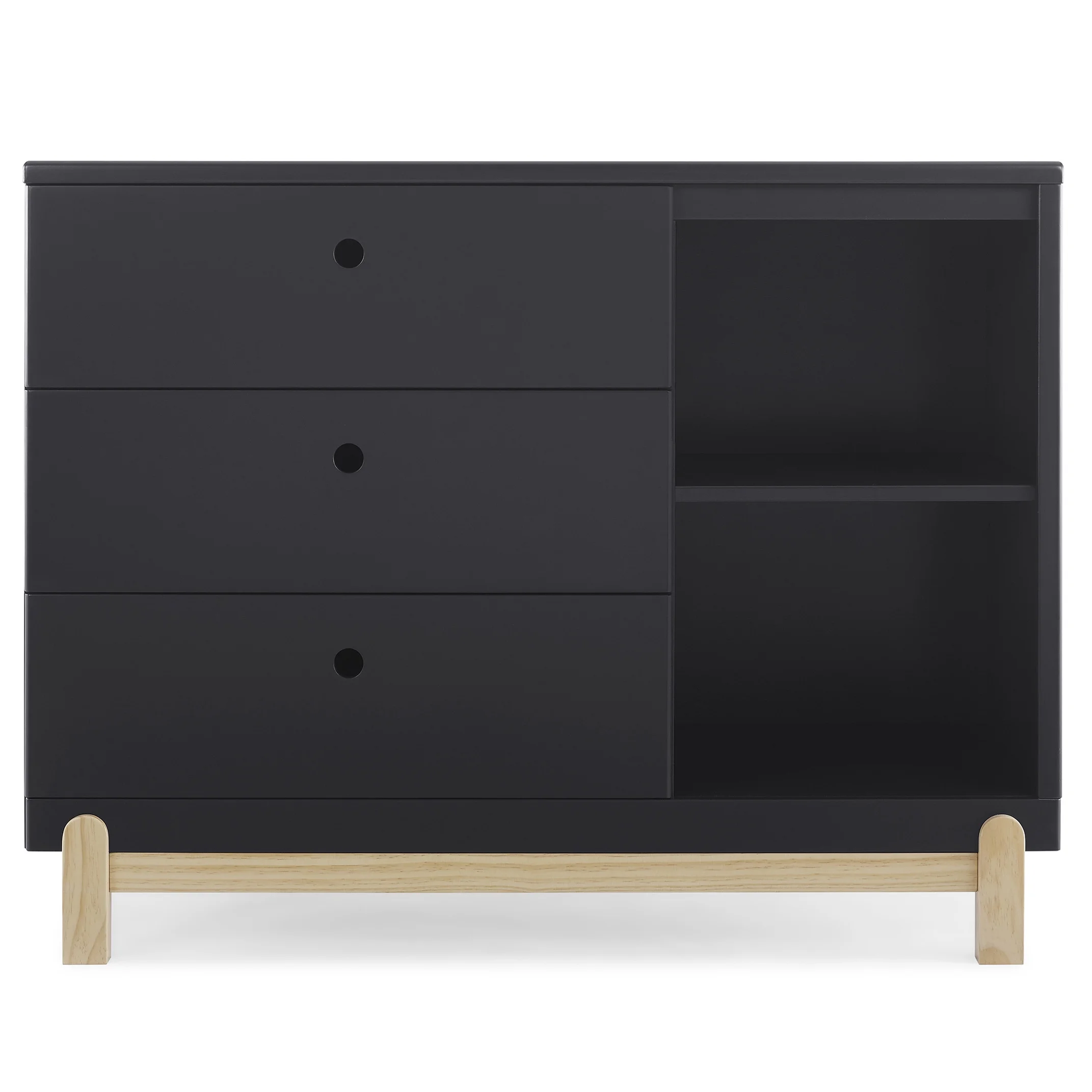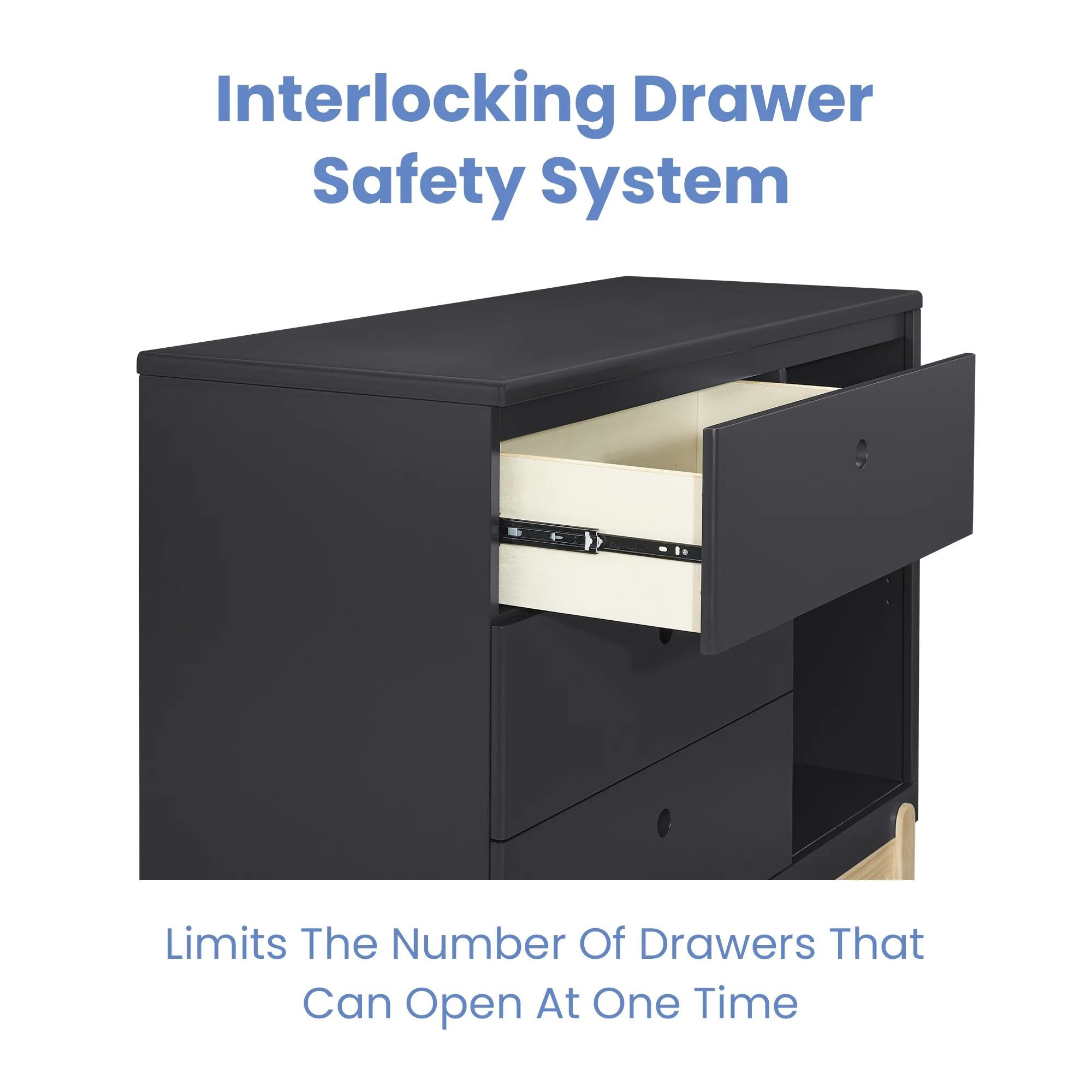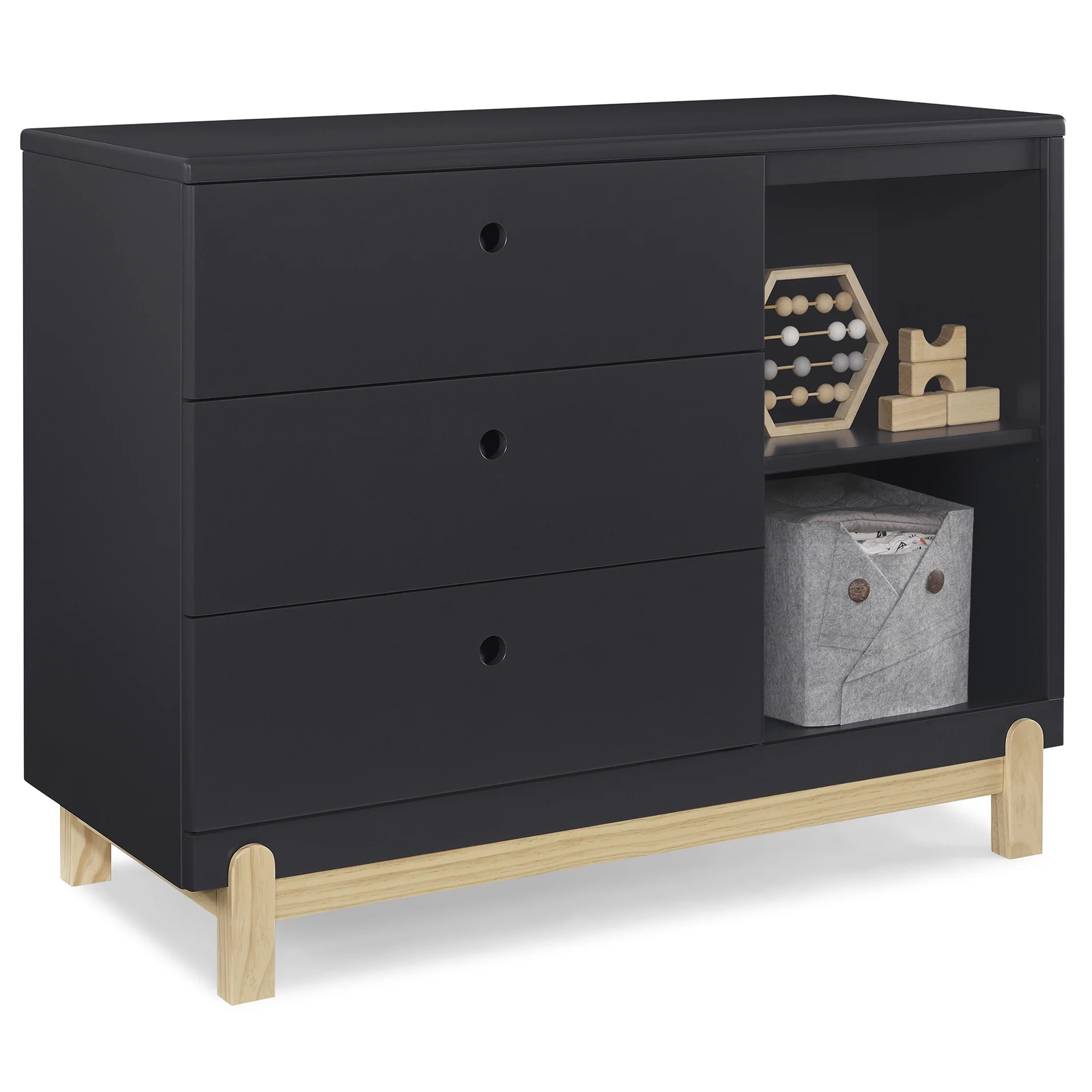 Bring style and convenient storage to your little one's bedroom with the Poppy 3 Drawer Dresser with Cubbies and Interlocking Drawers by Delta Children. This wood dresser features three drawers to keep shirts, pants and socks, while the other side features two open cubbies to house books, bins or toys. Modern and playful, this versatile dresser features a natural wood base and feet paired with a contrasting finish on top for a look that works from baby to big-kid. For your child��s safety, this dresser is outfitted with an interlocking drawer system that limits the number of drawers that can be opened at one time. To complete your child��s bedroom, pair the Poppy 3 Drawer Dresser with Cubbies with the Poppy 4-in-1 Convertible Crib by Delta Children.