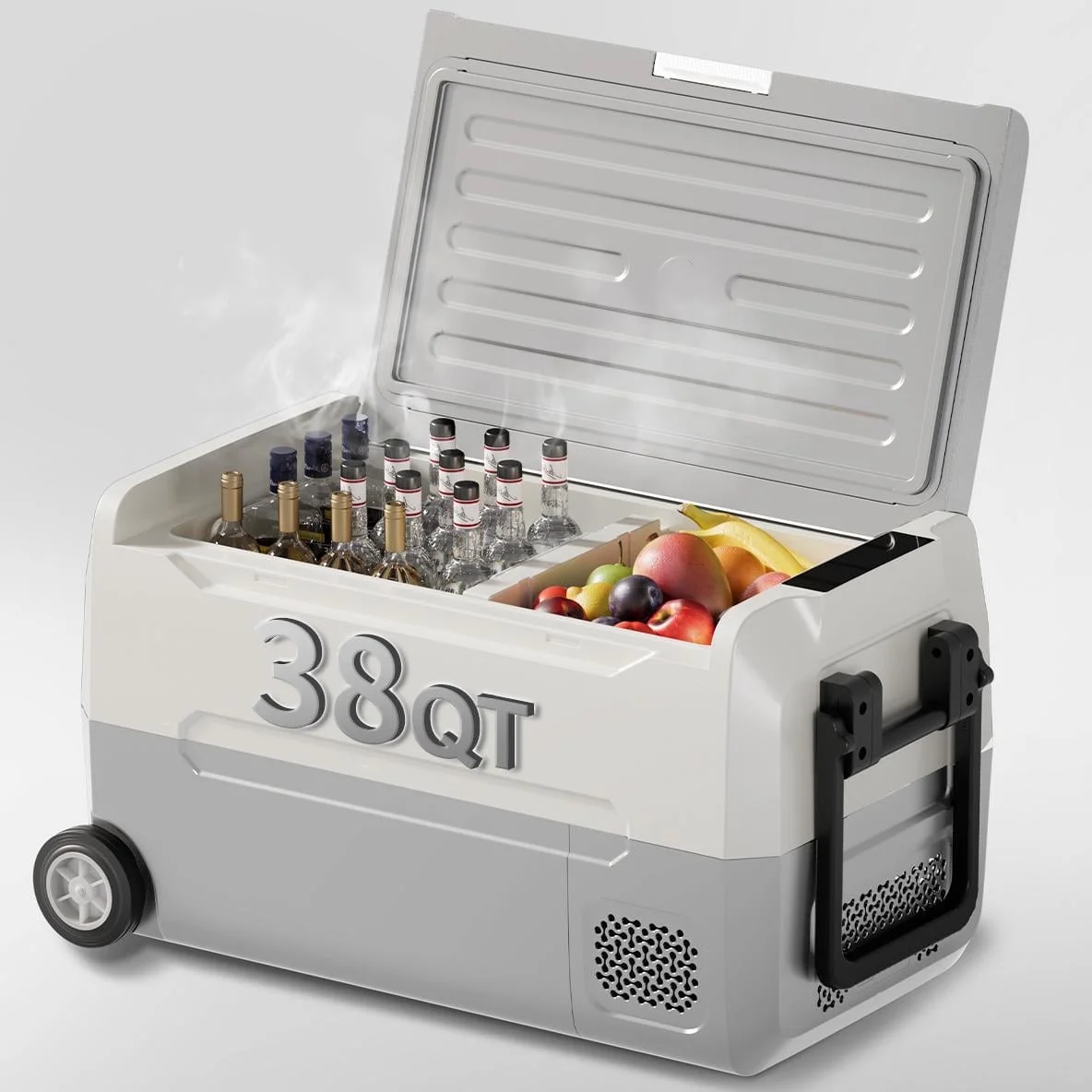 DISHUP 38QT(35L) portable car refrigerator keeps drinks ice-cold and food fresh with independent temperature zones (adjustable from -4��F to 68��F). Perfect for road trips or camping, this car fridge freezer holds 60 cans plus groceries��ideal for families, tailgating, or week-long adventures.