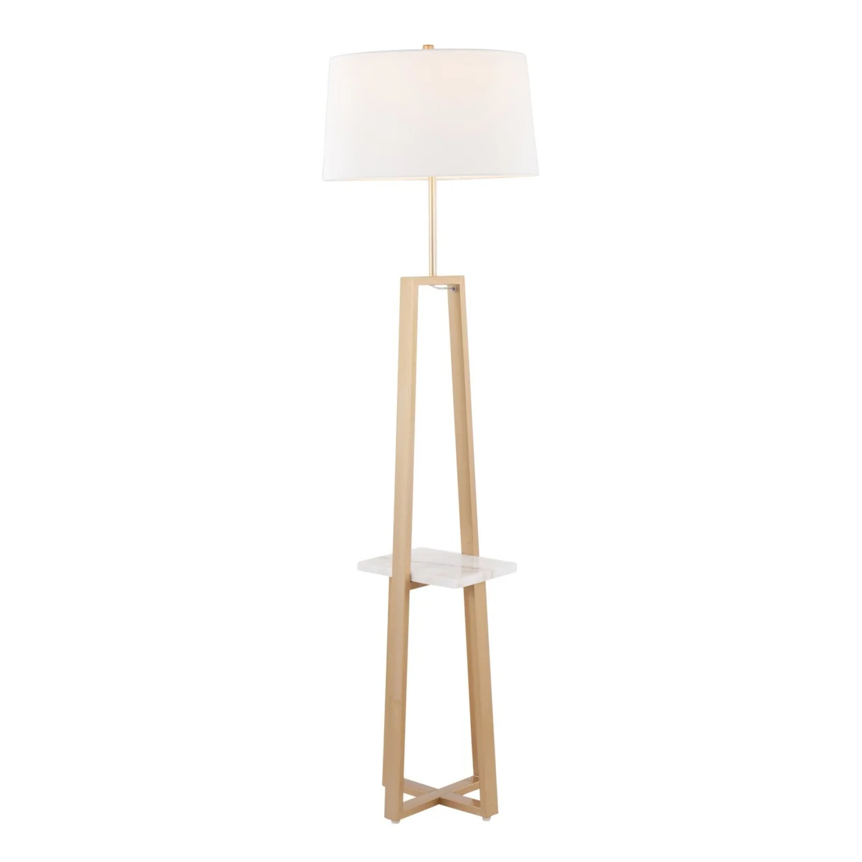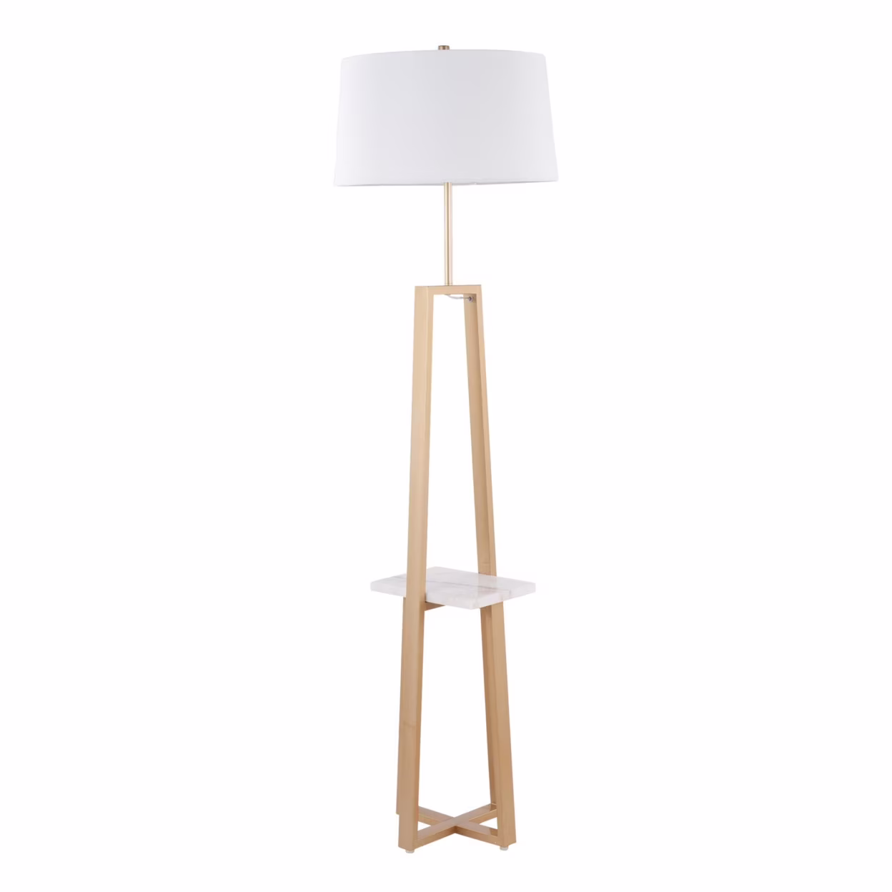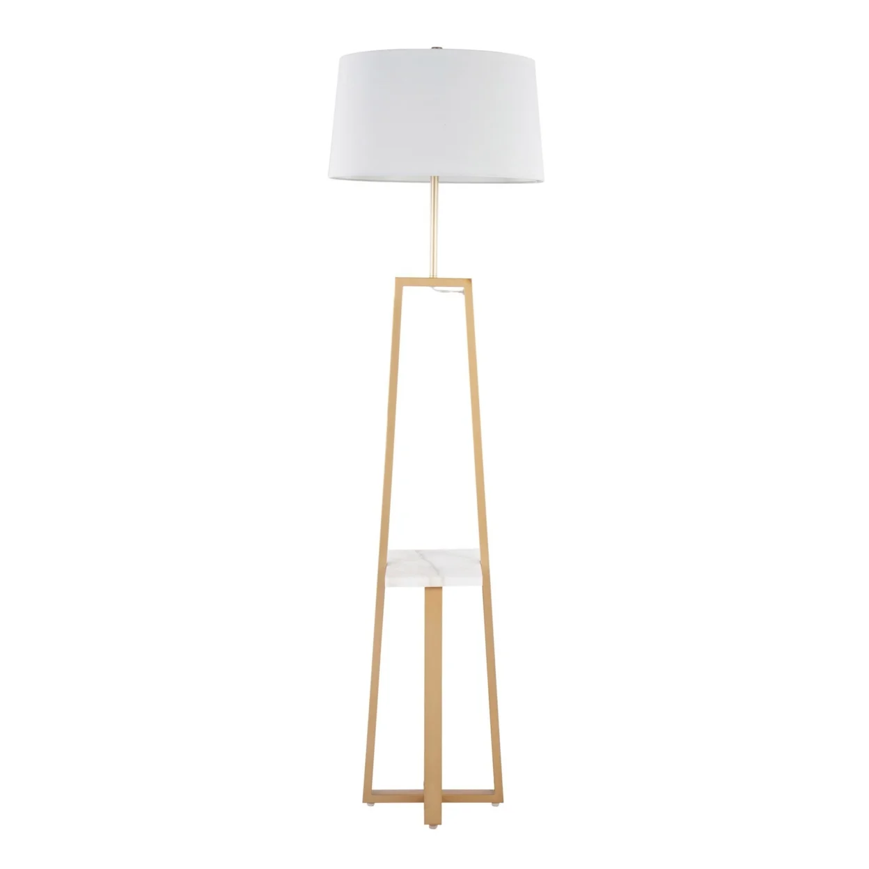 Full of modern elegance, the Cosmo Shelf Floor Lamp by LumiSource will elevate your room in effortless style. Featuring a stunning geometrical metal base, a sleek marble shelf, and a linen shade. Perfect for any living space, office, or bedroom.