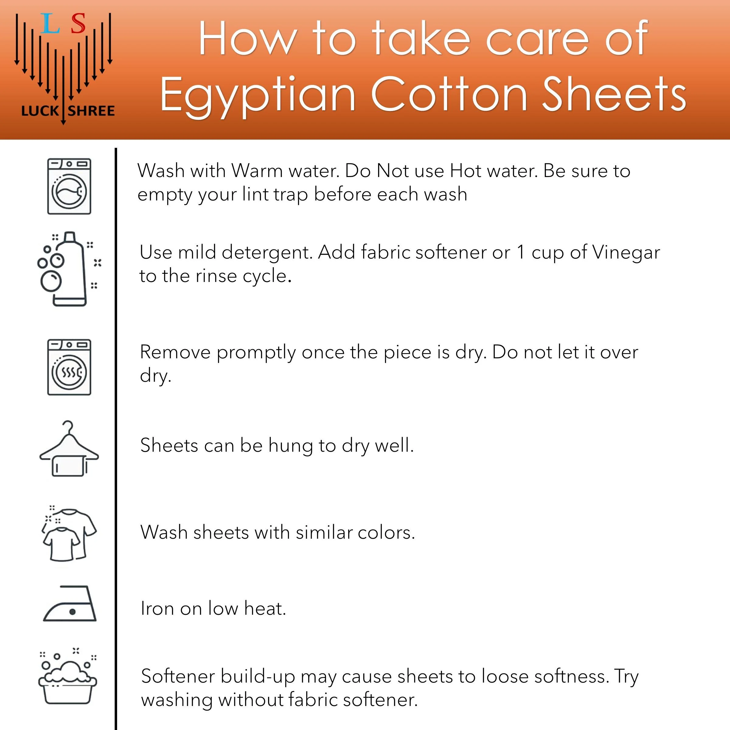 - WASH CARE INSTRUCTIONS: Please Note Egyptian Cotton sheets get softer with each wash, resist fading. To get the best out of these sheets, ensure that: Use Non - Chlorine washing agents. Tumble dry on low heat, remove quickly to avoid wrinkles.