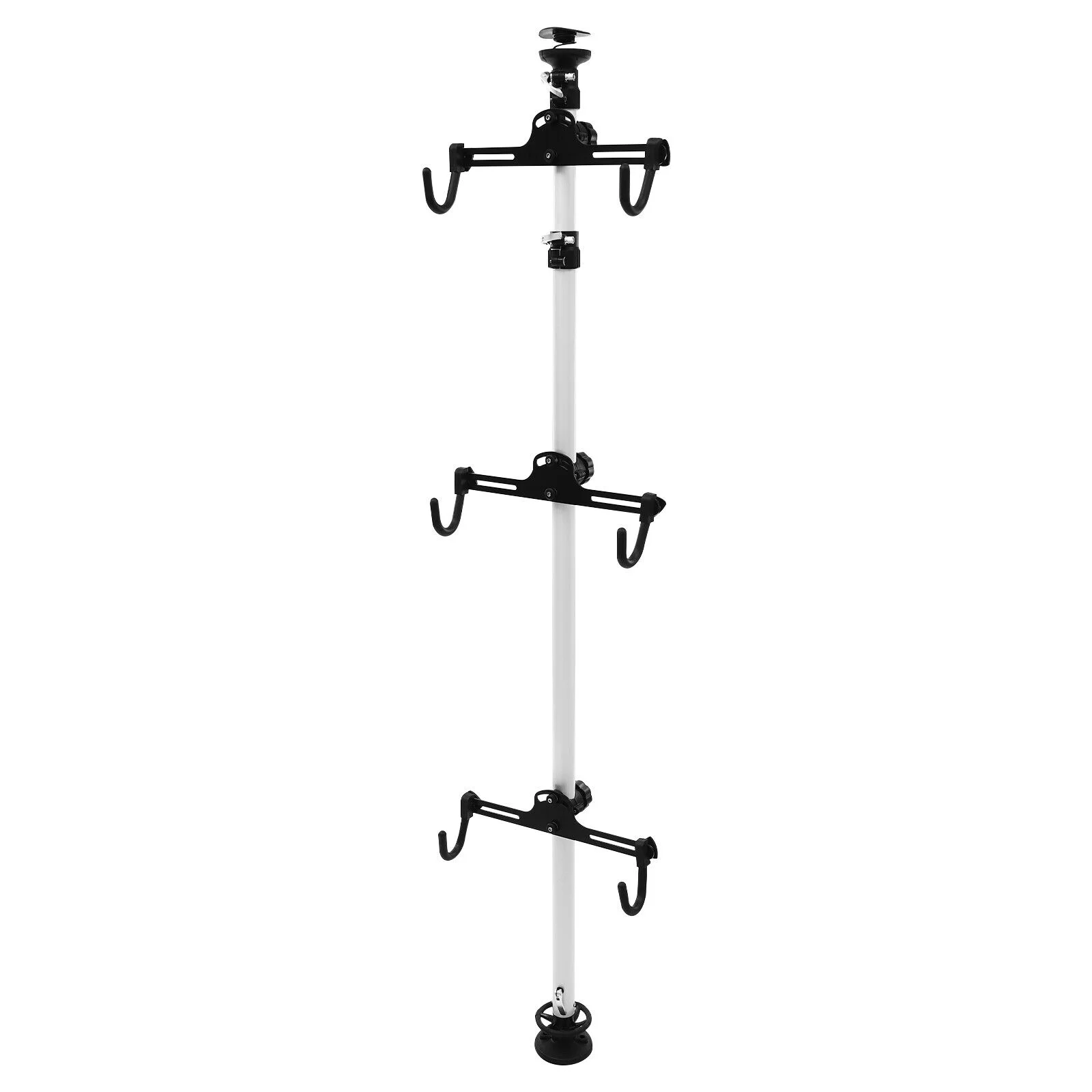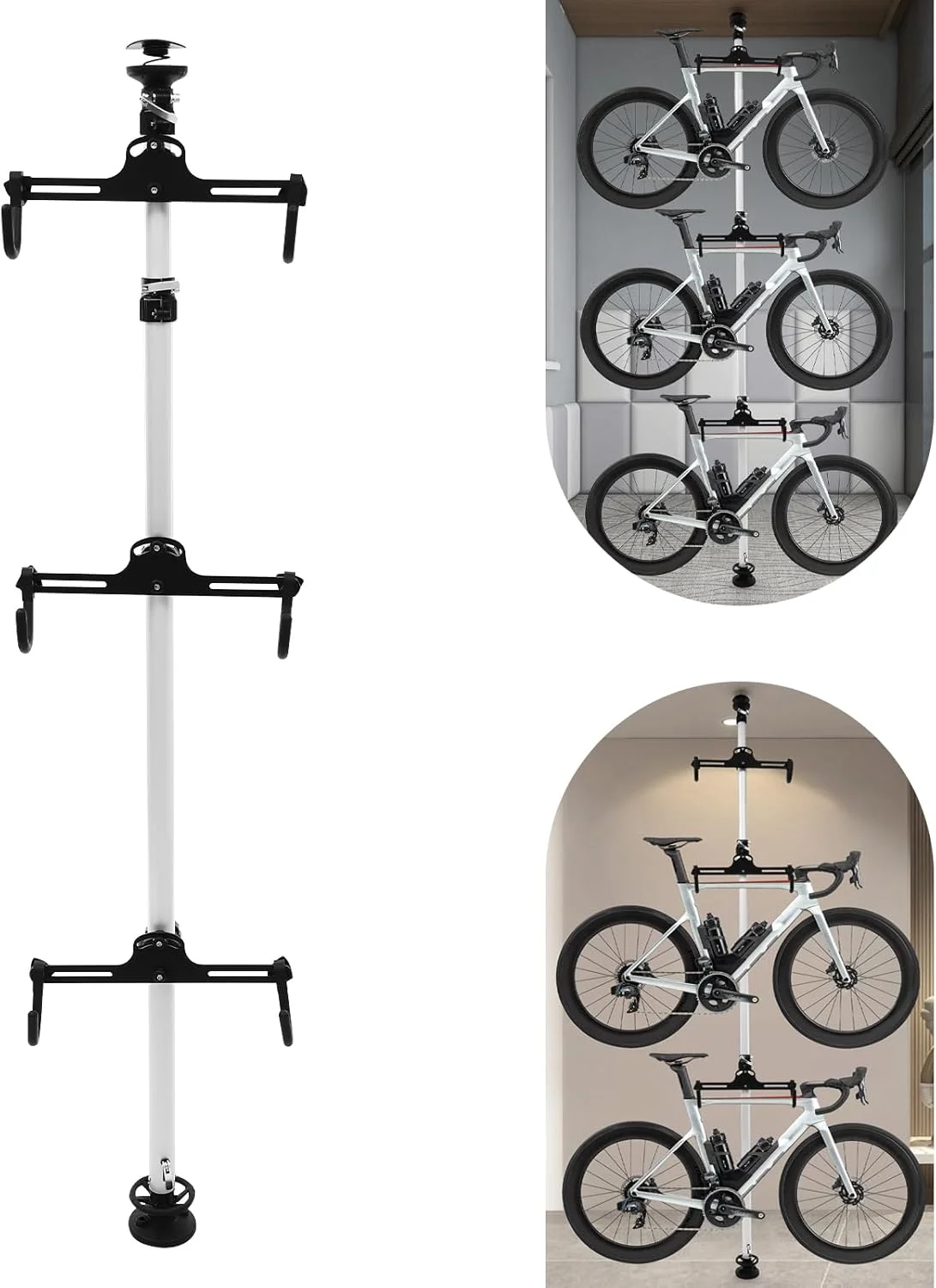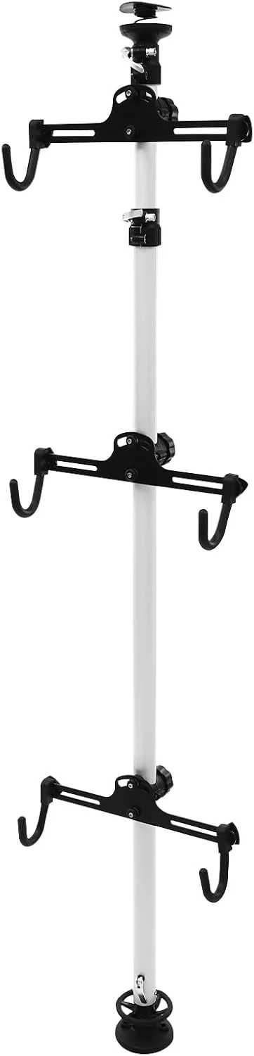 - 【Stable�?/b>This bike stand is designed with a booster spring top base, which can tighten the knob so that it will not shake with looseness. The screw holes on the base allow you to double tighten the hitch to further improve stability. Rubber feet on the top and bottom help the product stand firmly while avoiding damage to the ceiling and floor.