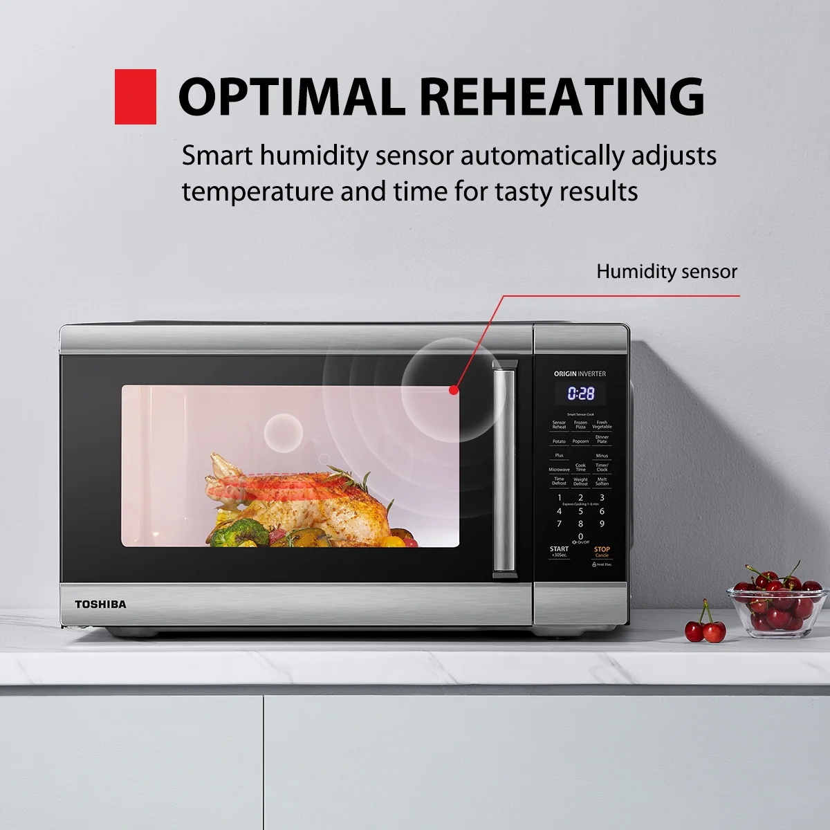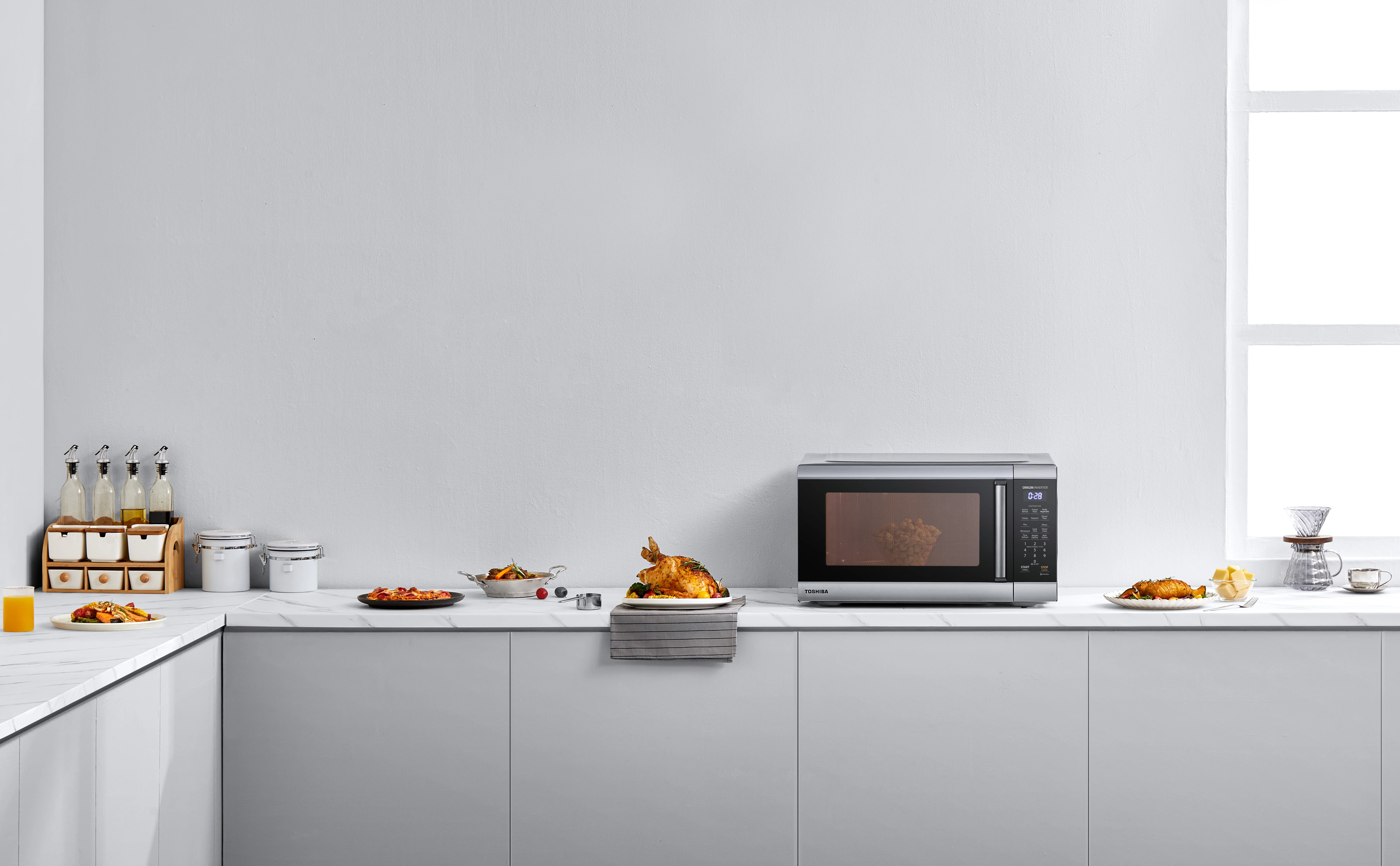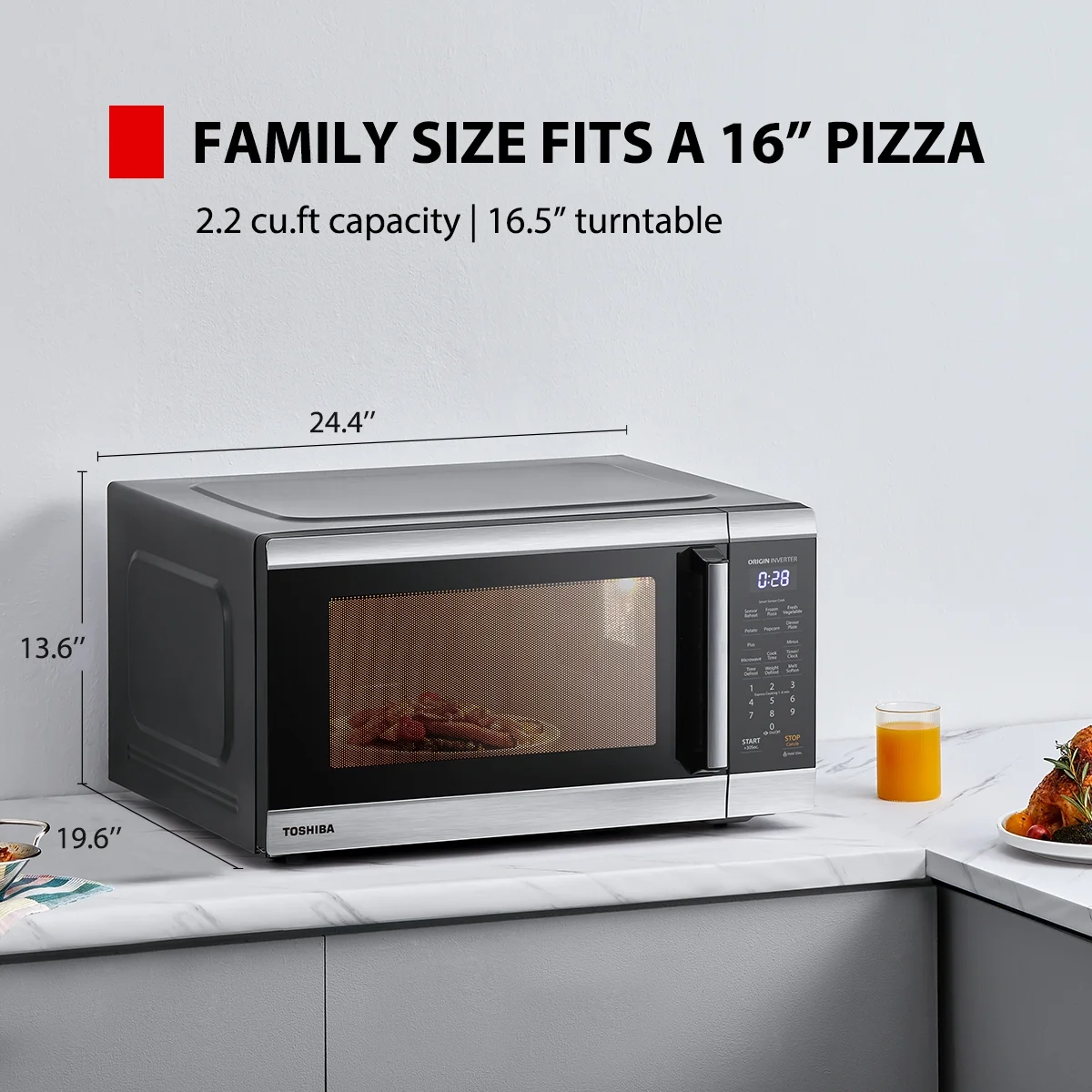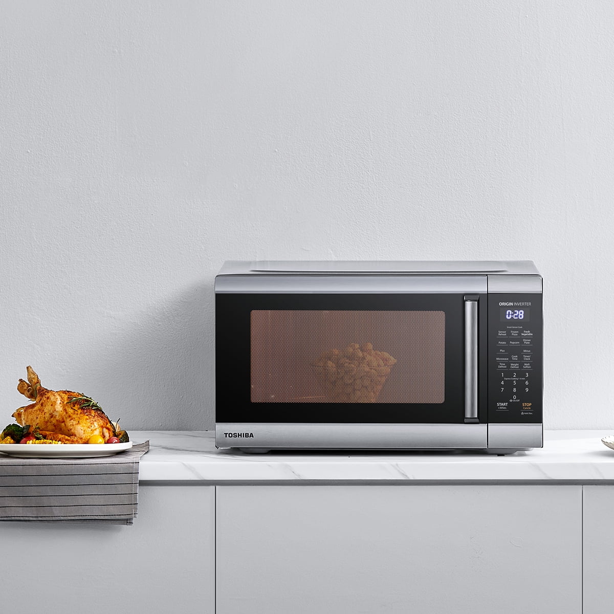 This Toshiba stainless steel microwave oven is a 2.2 2.2 Cu. ft. family-size microwave that brings you easy and nice cooking experience. The Toshiba inverter technology help to save energy and could cook the food more evenly and delicious. The built-in smart sensor that adjusts power level and time automatically takes the guesswork out of cooking. And the timeless look with stainless steel stripes will fit in with any kitchen style and the 2.2 cu ft super spacious cavity offers more possibilities for a family dinner. The adjustable 10 power levels allow for optimal cooking and reheating results of a variety of foods. Other convenient options, such as Express Cook 1-6 min, +30 seconds, preset menus, not only add up the flexibility, but also make daily operation easier and faster. This microwave can defrost your ingredients evenly by time and weight. Digital clock and timer light up on easy-to-read LED display. It also comes with power saving ECO mode that helps save energy. And you could choose the sound off to have a quiet environment.