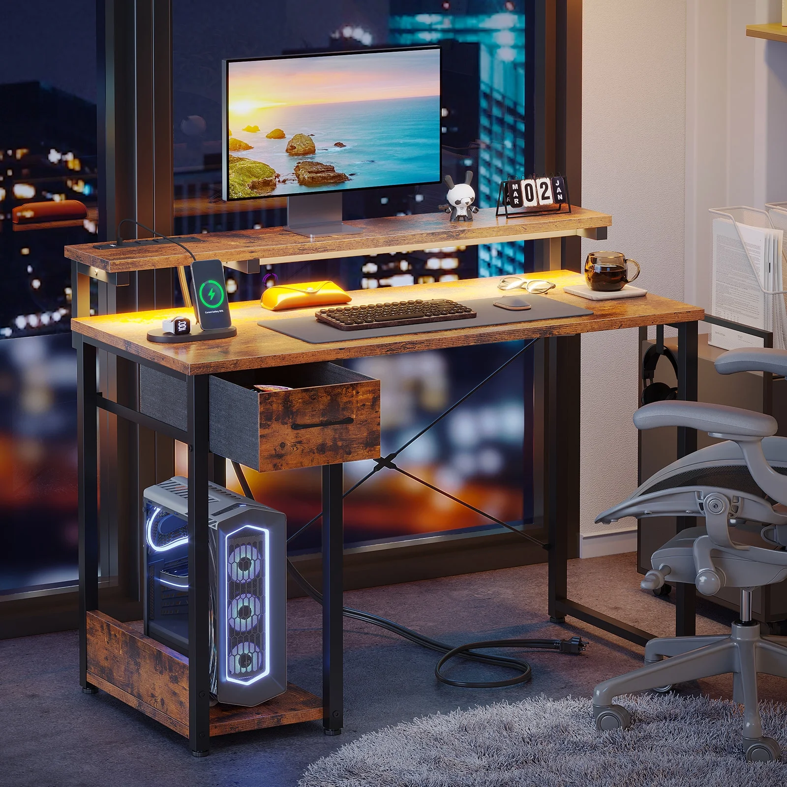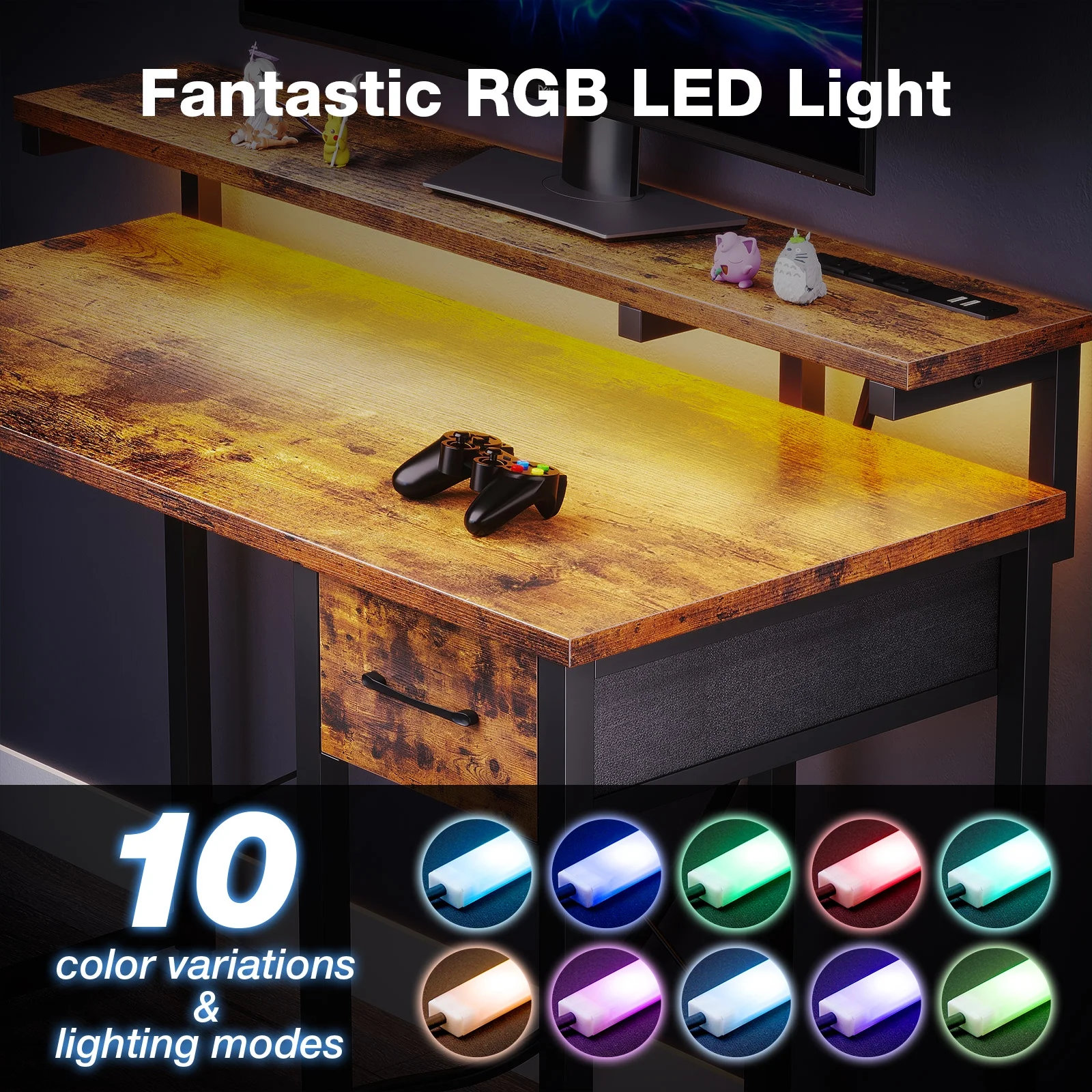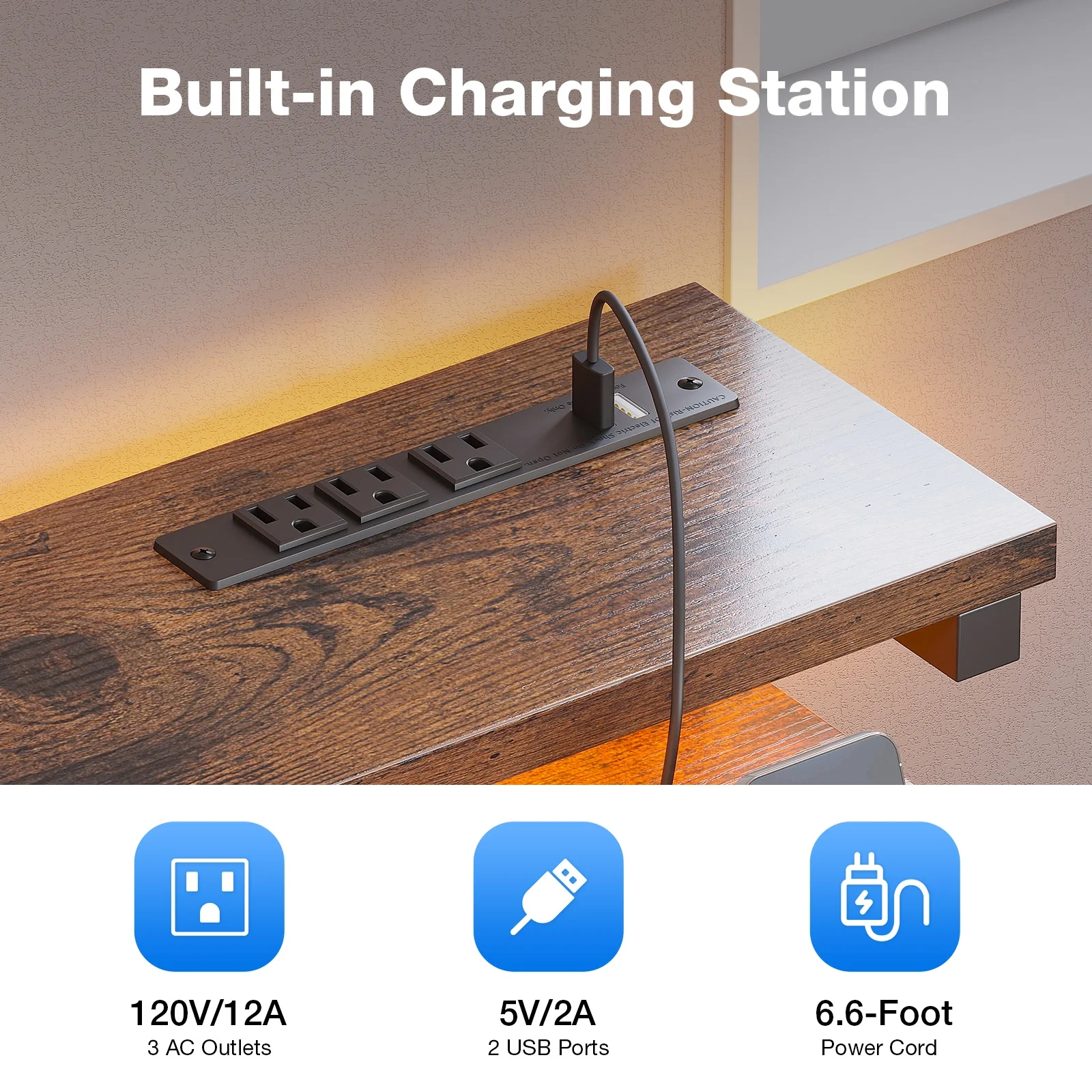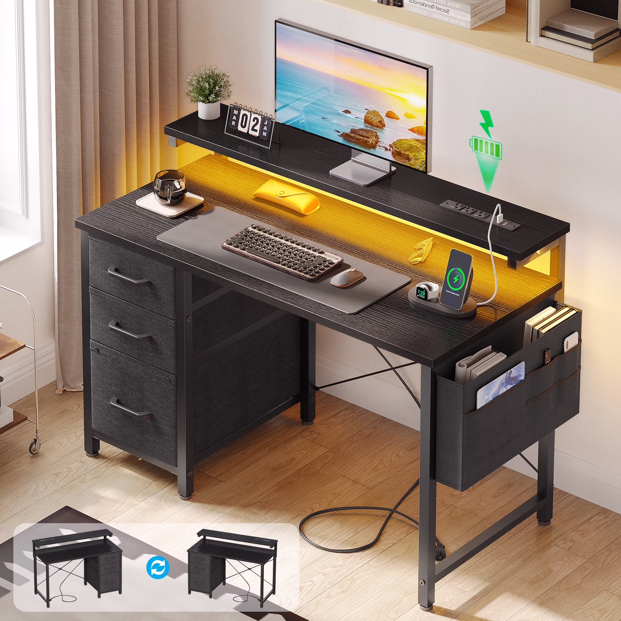 - The desk features built-in power outlets and LED lights, allowing you to keep your devices charged and your workspace well-lit.