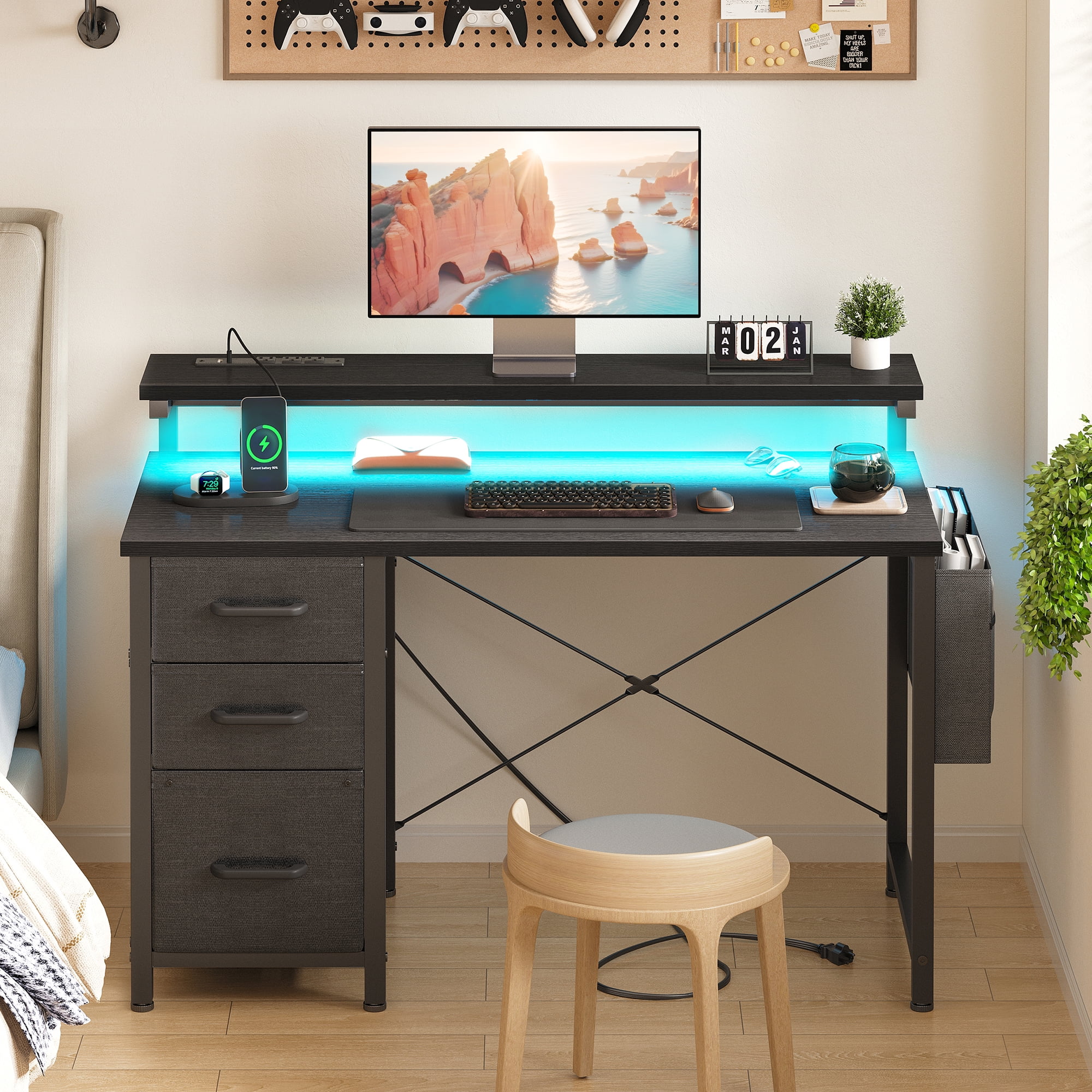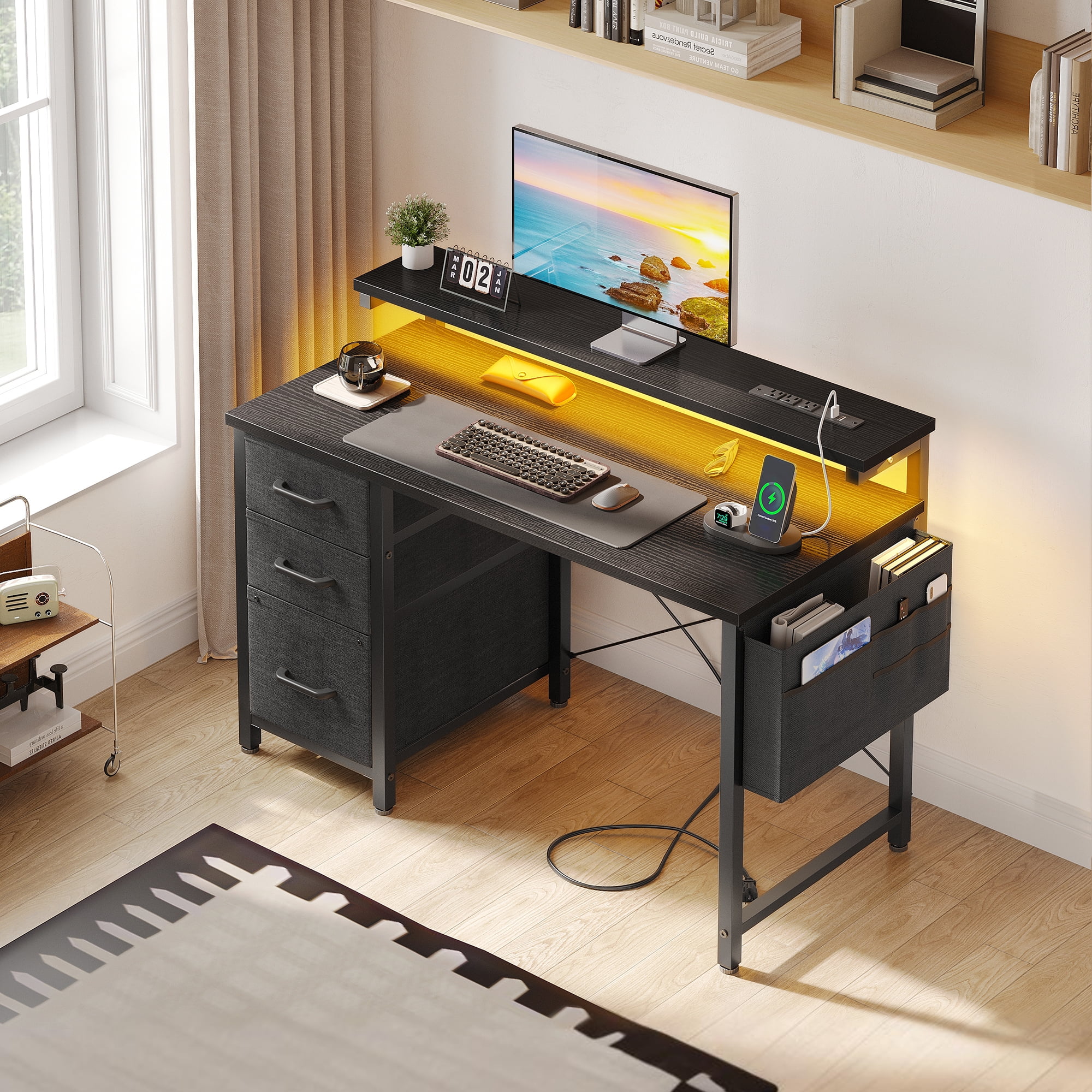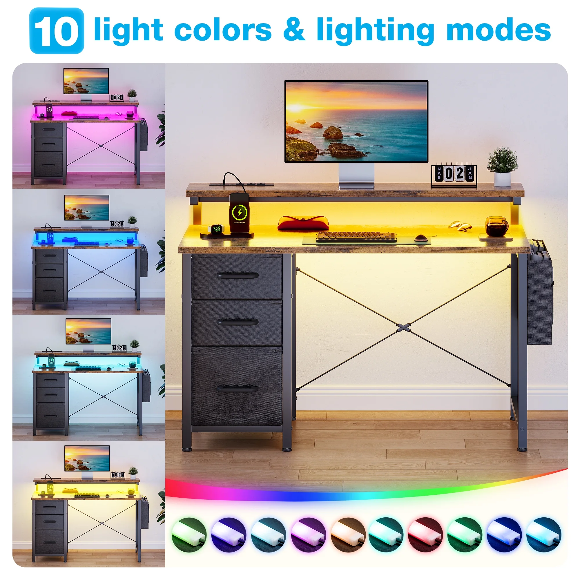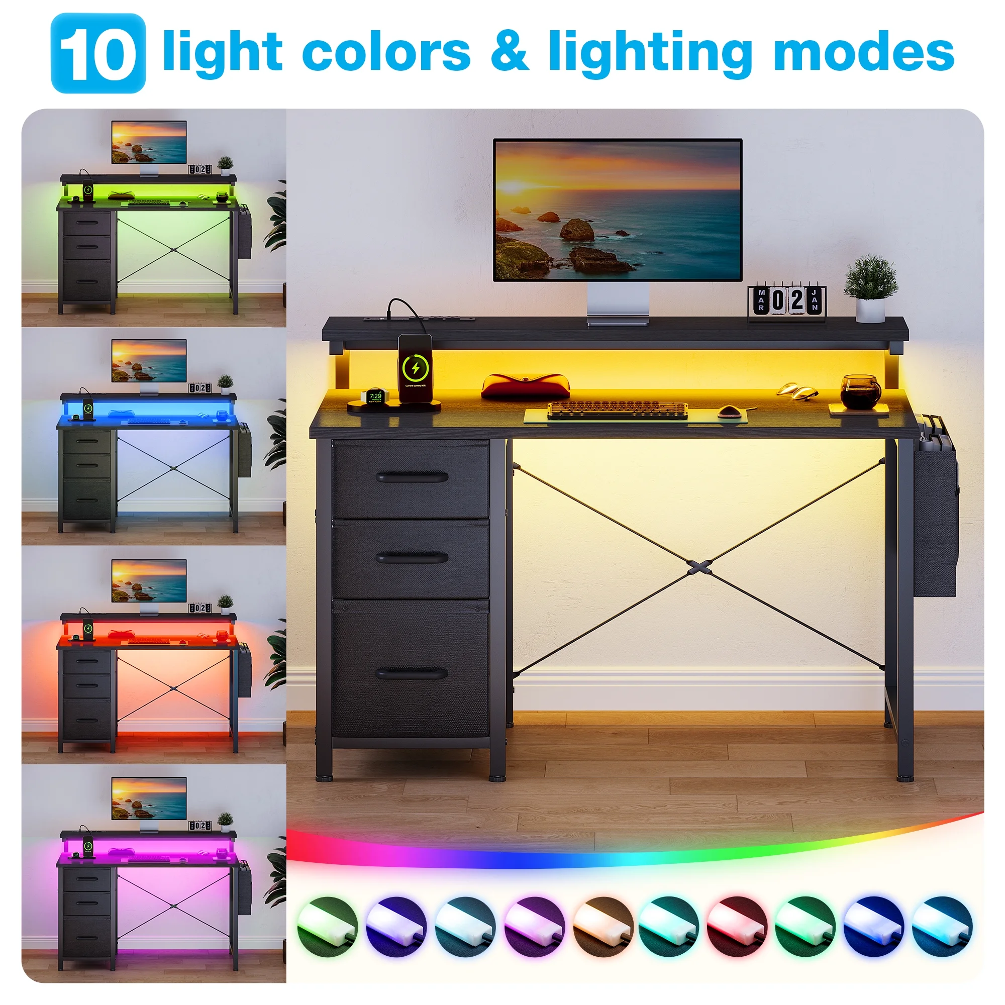 - The desk features built-in power outlets and LED lights, allowing you to keep your devices charged and your workspace well-lit.