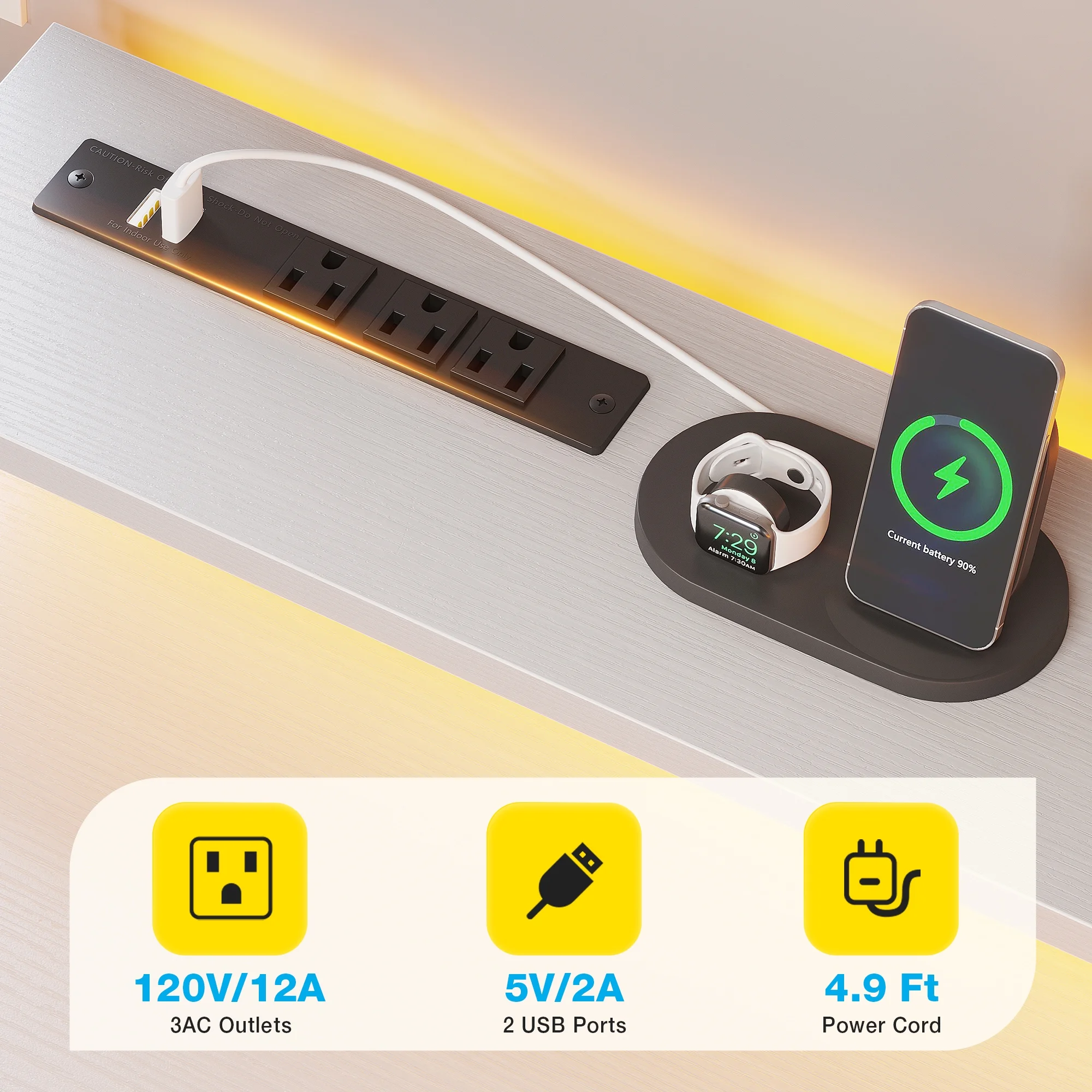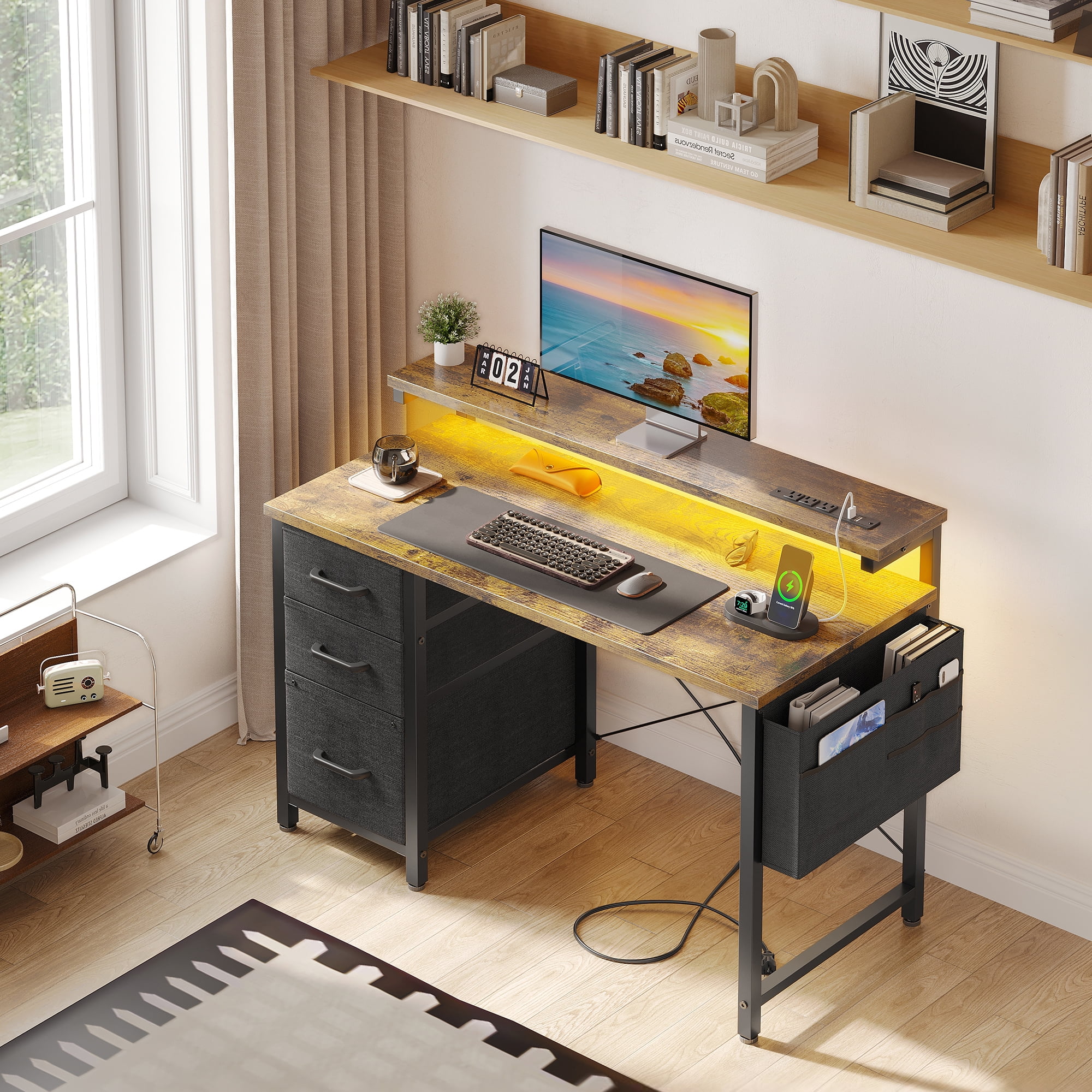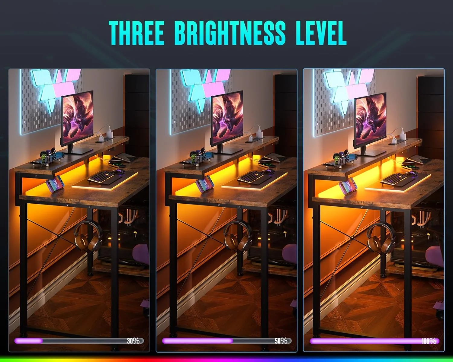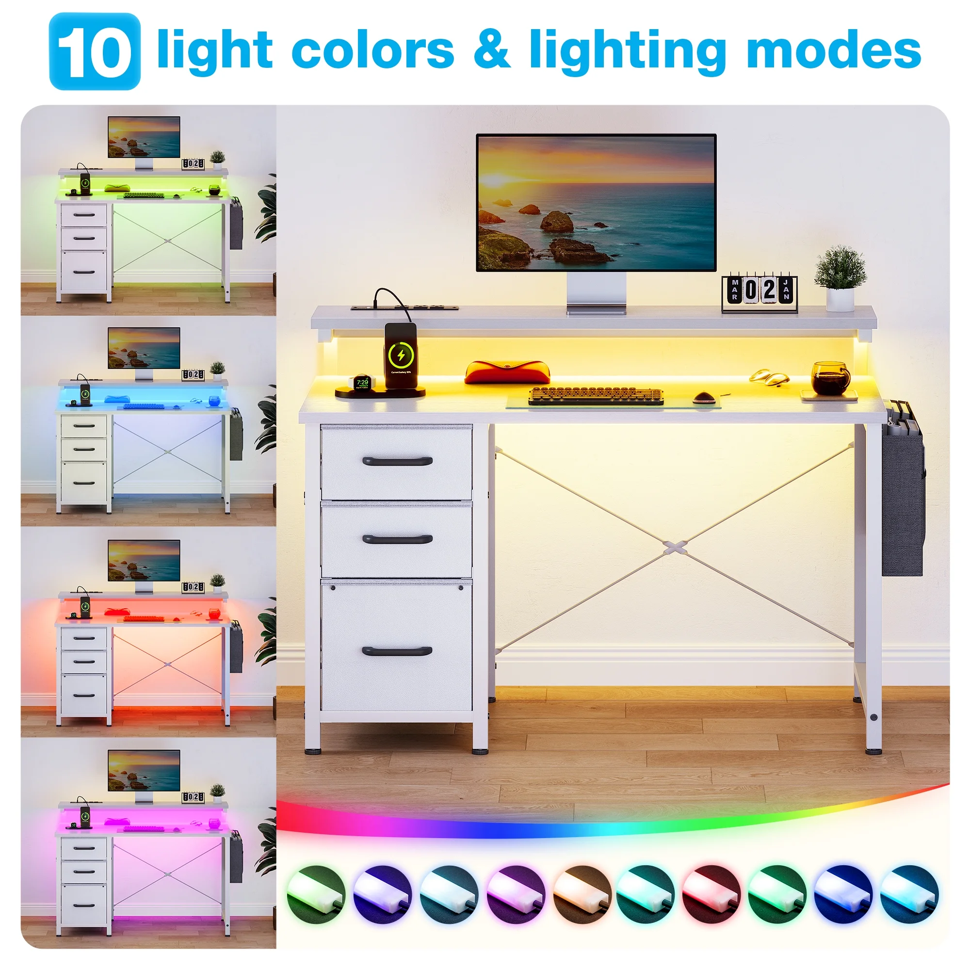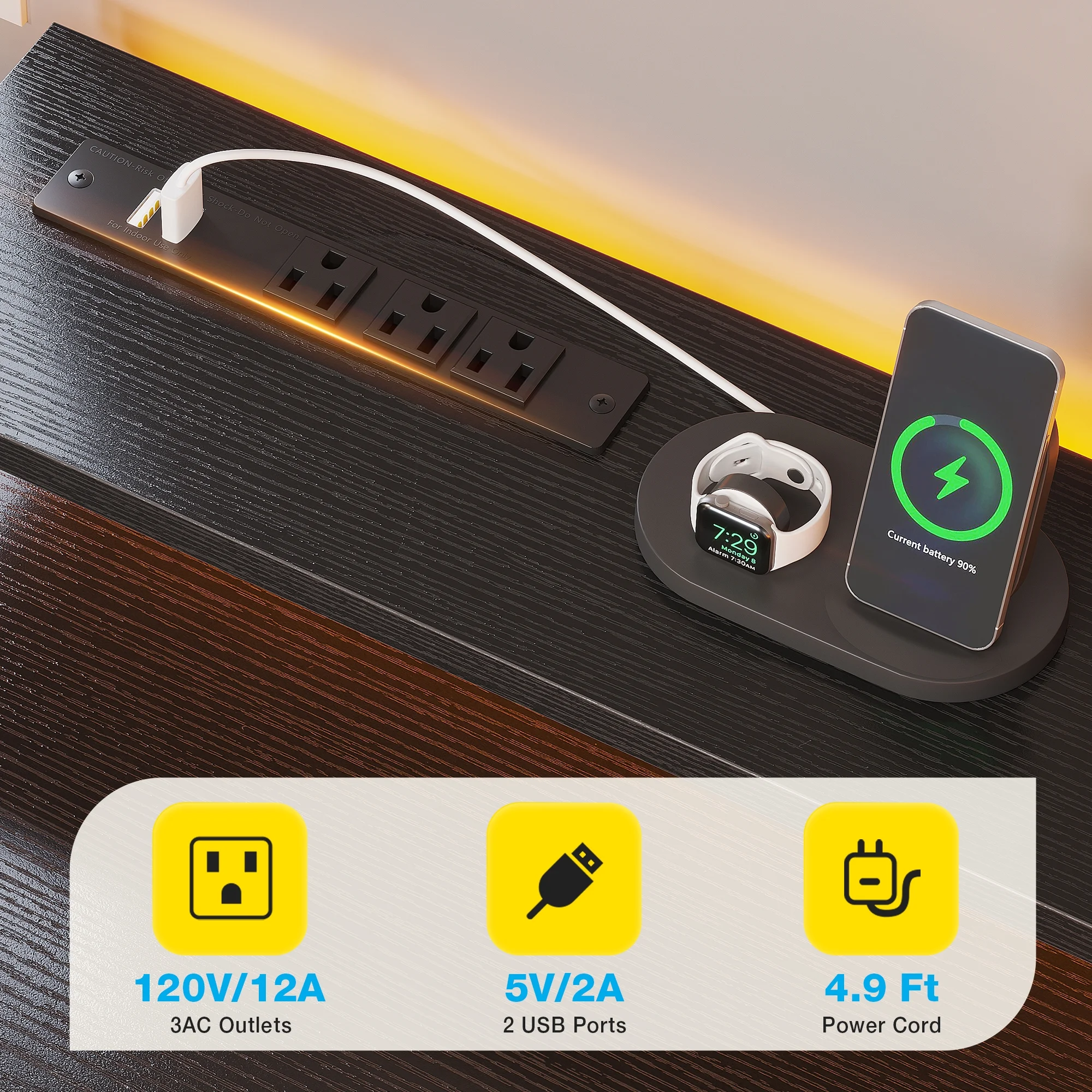 - The desk features built-in power outlets and LED lights, allowing you to keep your devices charged and your workspace well-lit.