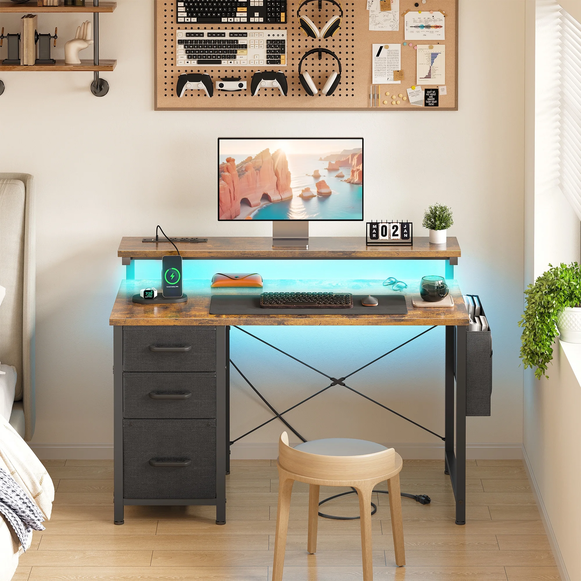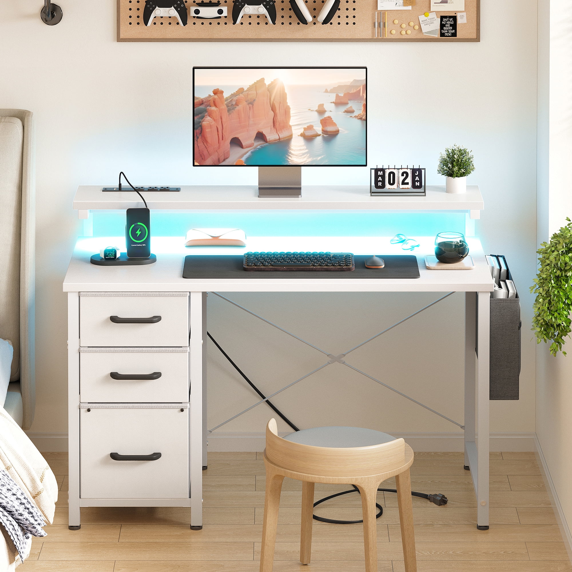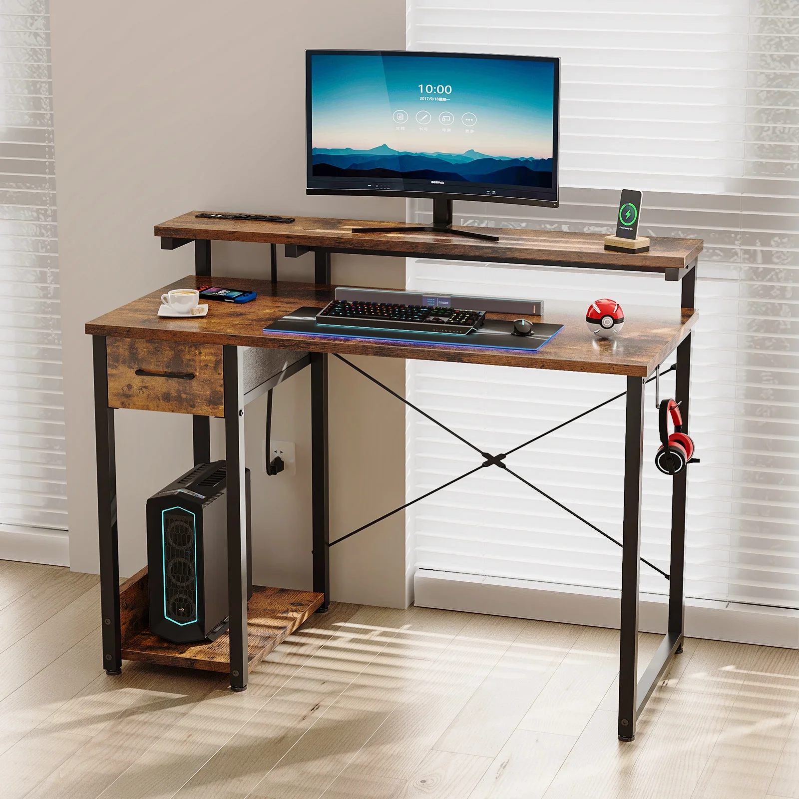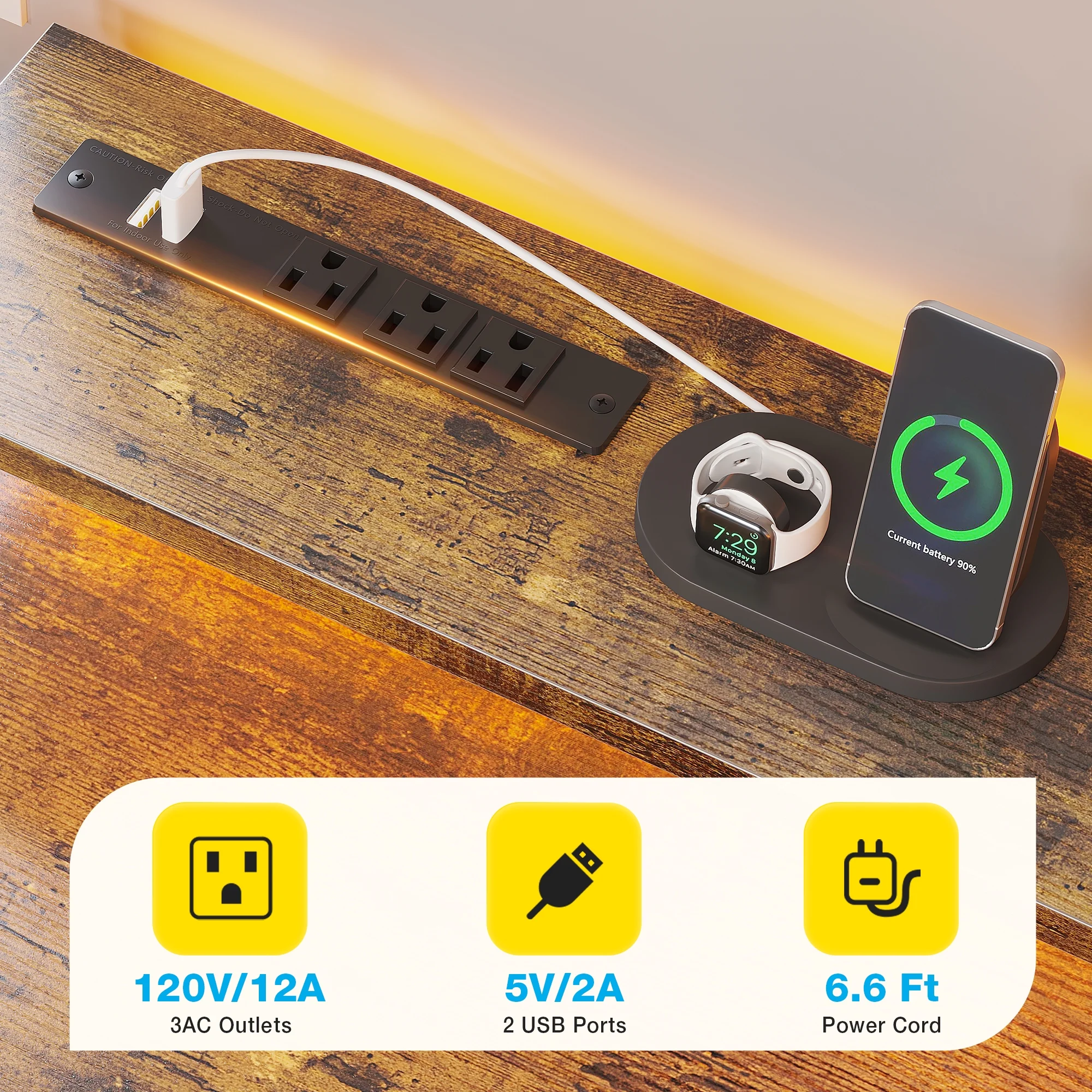 - The desk features built-in power outlets and LED lights, allowing you to keep your devices charged and your workspace well-lit.