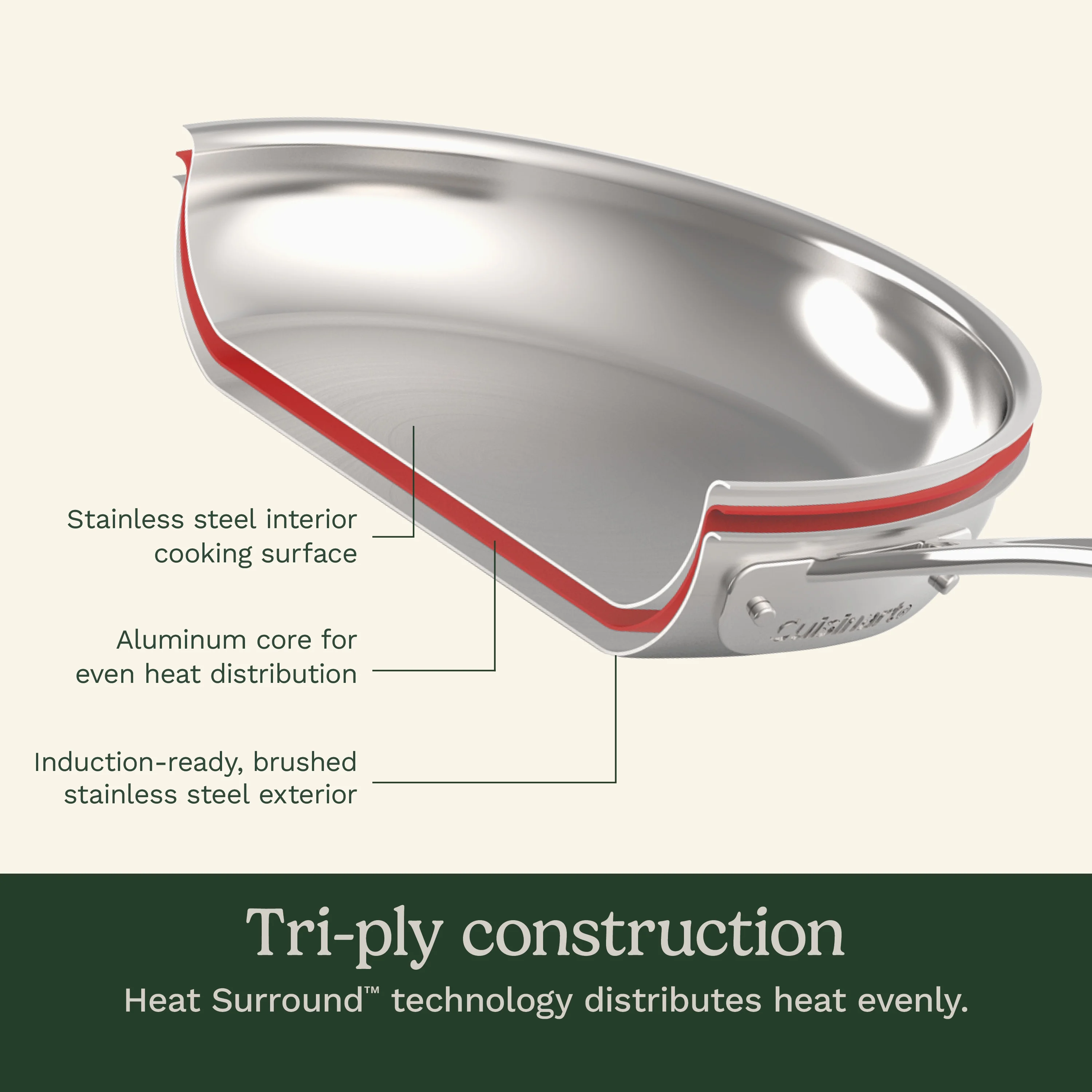 - Triple-ply construction features an aluminum core bonded with brushed stainless steel and a polished rim for exceptional heat control and durability