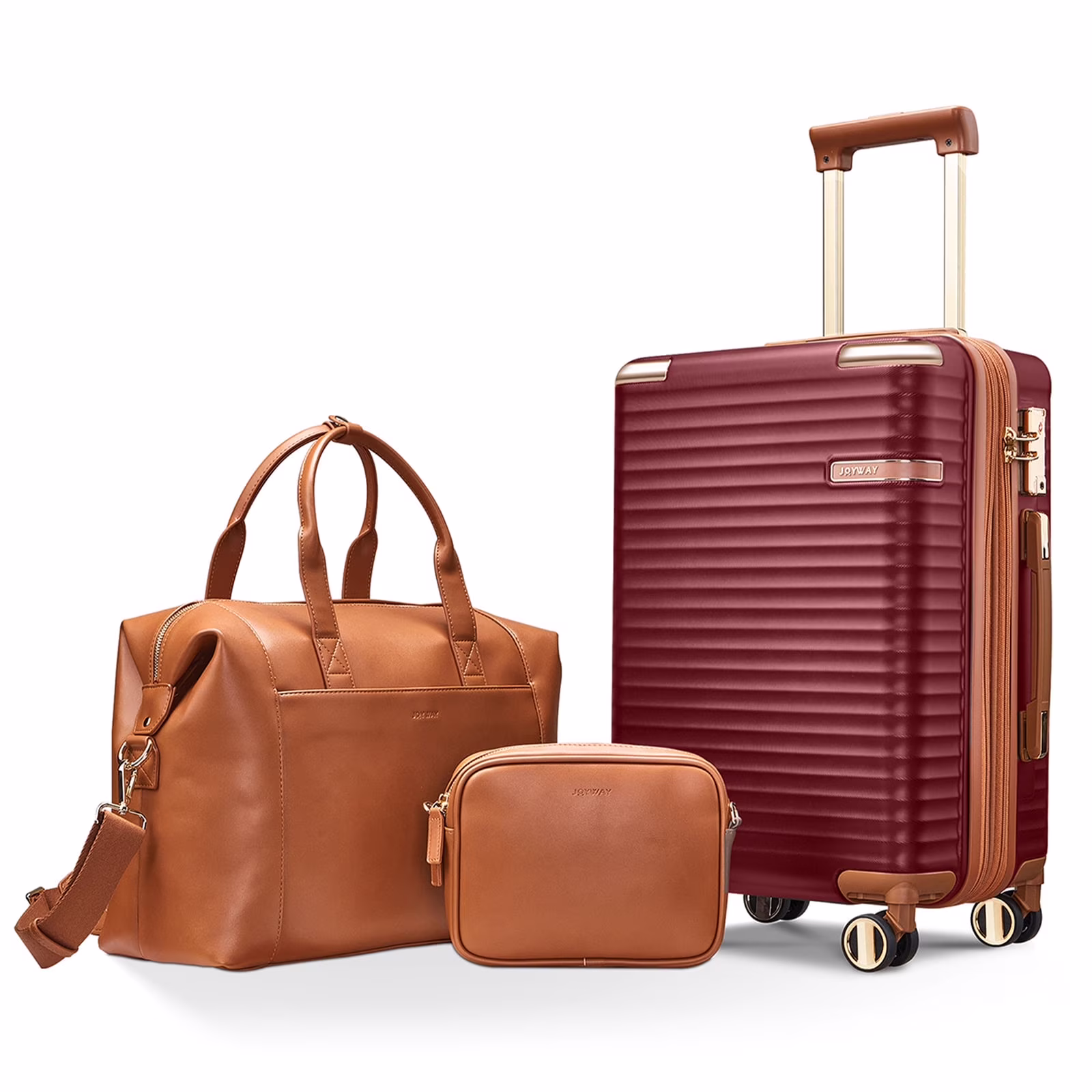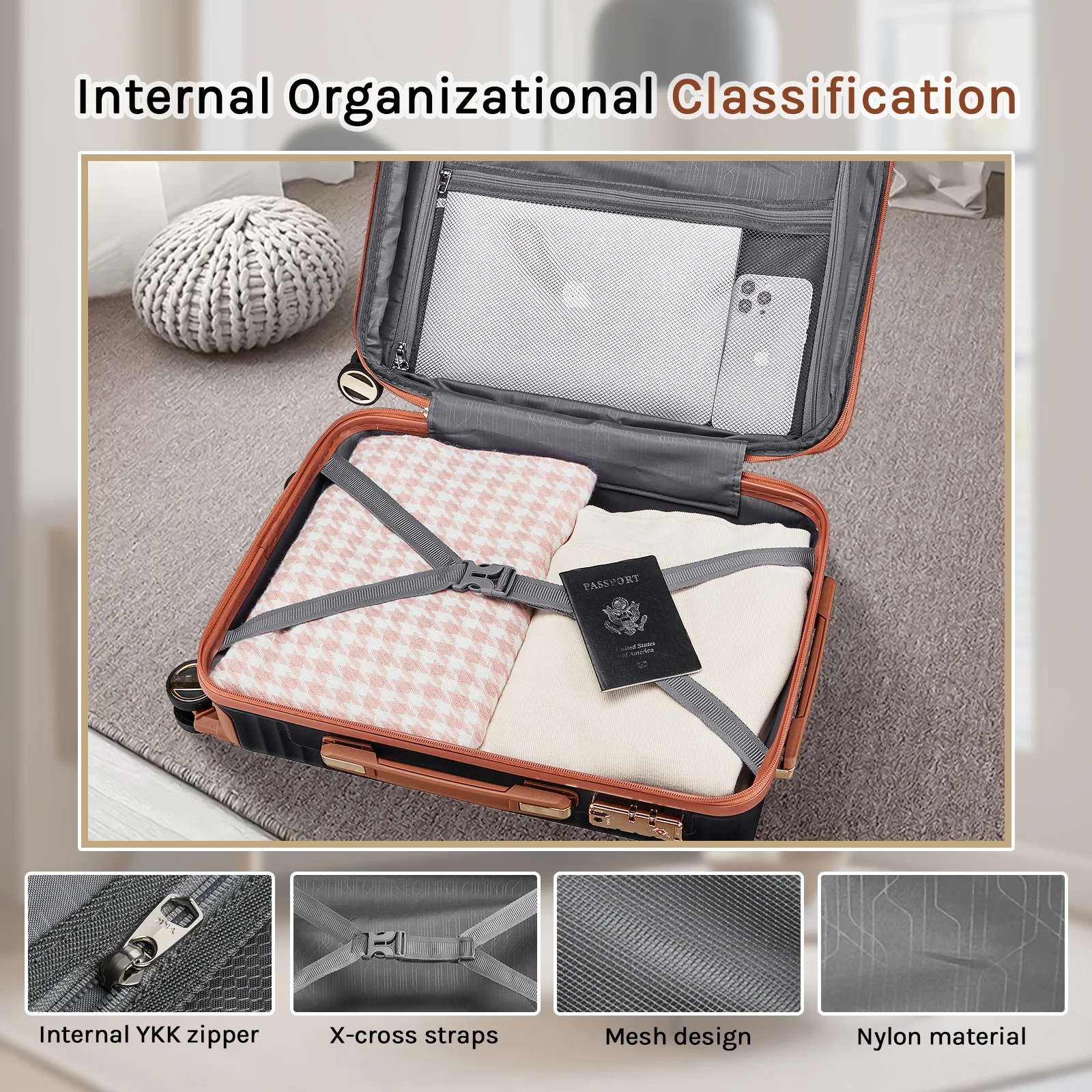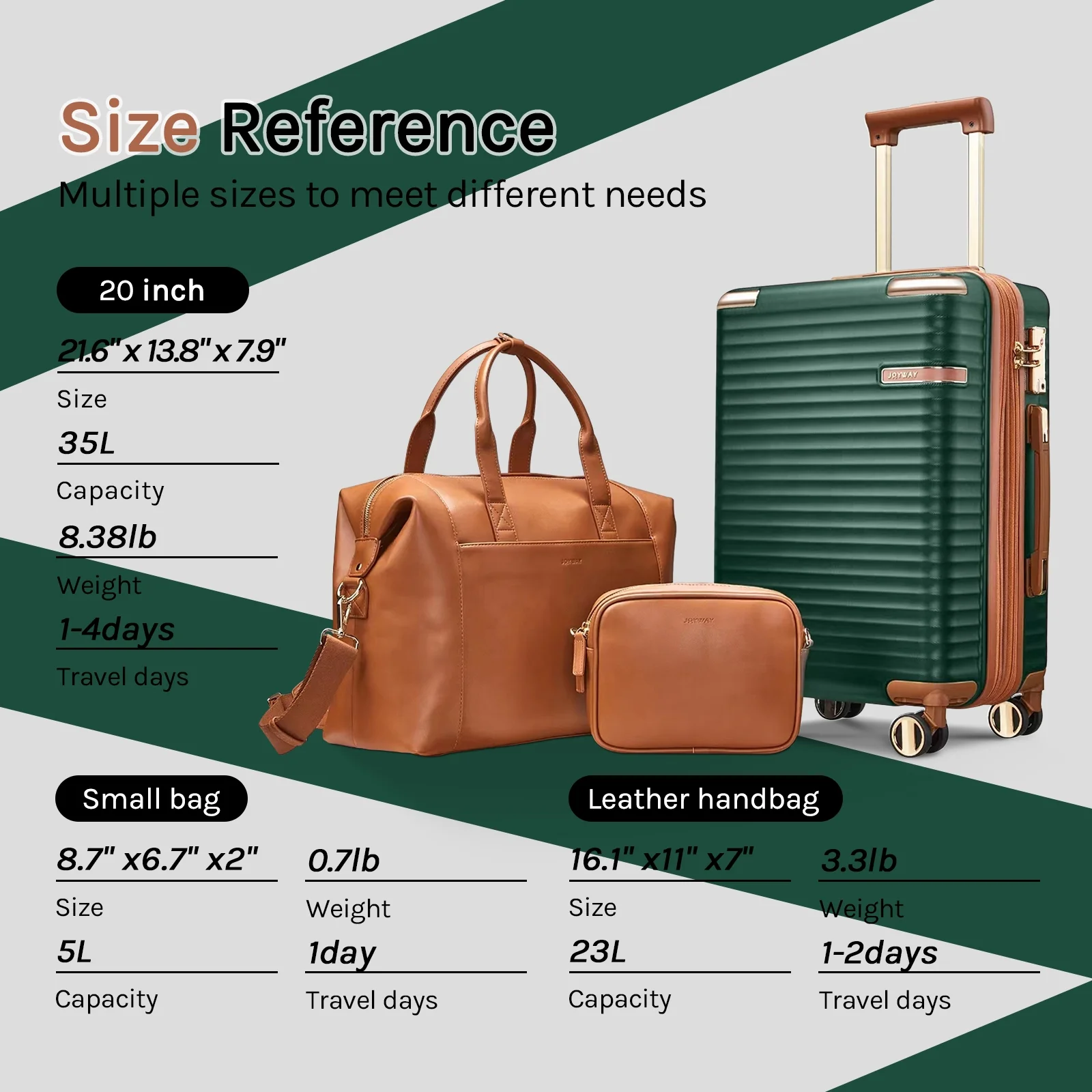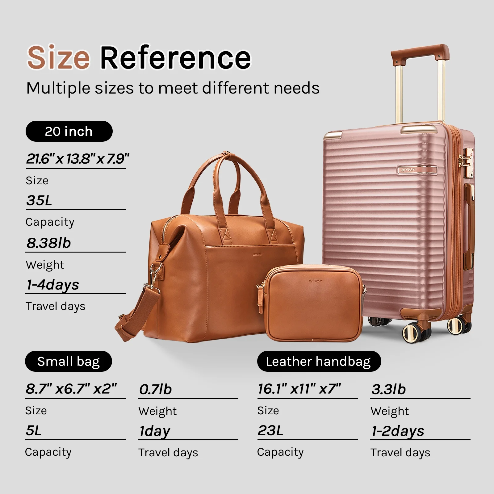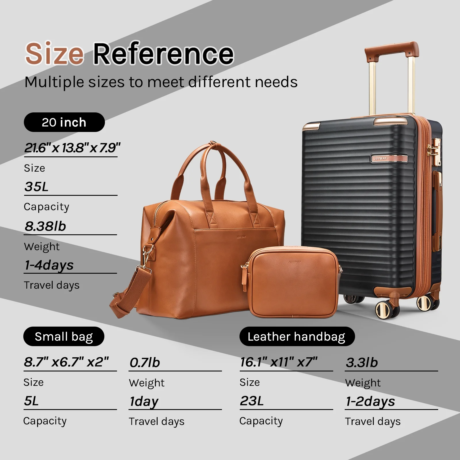 - Luggage Set 3 Piece Set: This carry-on luggage set includes one 20-inch carry-on suitcase, one Leather Travel Bag & one Leather Storage Bag. In addition, the luggage set is made of ABS material with a sturdy outer shell to ensure durability.