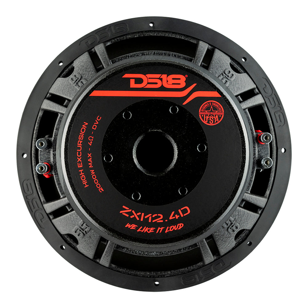 DS18 High Excursion 12" Subwoofer Dual 4 Ohm ZXI12.4D This sub has a low FS so it can be used in large boxes with lower than normal tuning. Not only will this subwoofer dominate the lows, it is versatile enough to also play higher frequencies in the bass zone of sub frequencies. The ZXI12.4D has a mounting depth of only 7.5 inches so It can be used in most instances where you need a lot of bass but not you don't have to worry about the setup taking up all the real estate in your vehicle. The ZXI12.4D has been conservatively rated at 1000w RMS and 2000 watts peak power so this makes it the sub that can handle any task put to fruition. Features ? Nominal Diameter:?12" ? Nominal Impedance:?4 + 4 ohms ? RMS Power Handling:?1000 Watts ? MAX Power Handling:?2000 Watts ? Voice Coil Diameter:?3" (76.5mm) ? Voice Coil Former Material:?Black Aluminum? ? Winding Material:?CCAW ? Cone Material:?Non-Pressed Paper ? Dust Cap Material:?PPI ? Motor:?Ferrite ? Overall depth:?9.13" ? Mounting depth:?7.55" ? Overall width:?12.55" ? Cutout Diameter:?11.1" ? XMAX:?32mm one way 64mm total ? FS:?31.4Hz? Nominal Diameter: 12" ? Nominal Impedance: 4 + 4 ohms ? RMS Power Handling: 1000 Watts ? MAX Power Handling: 2000 Watts ? Voice Coil Diameter: 3" (76.5mm)