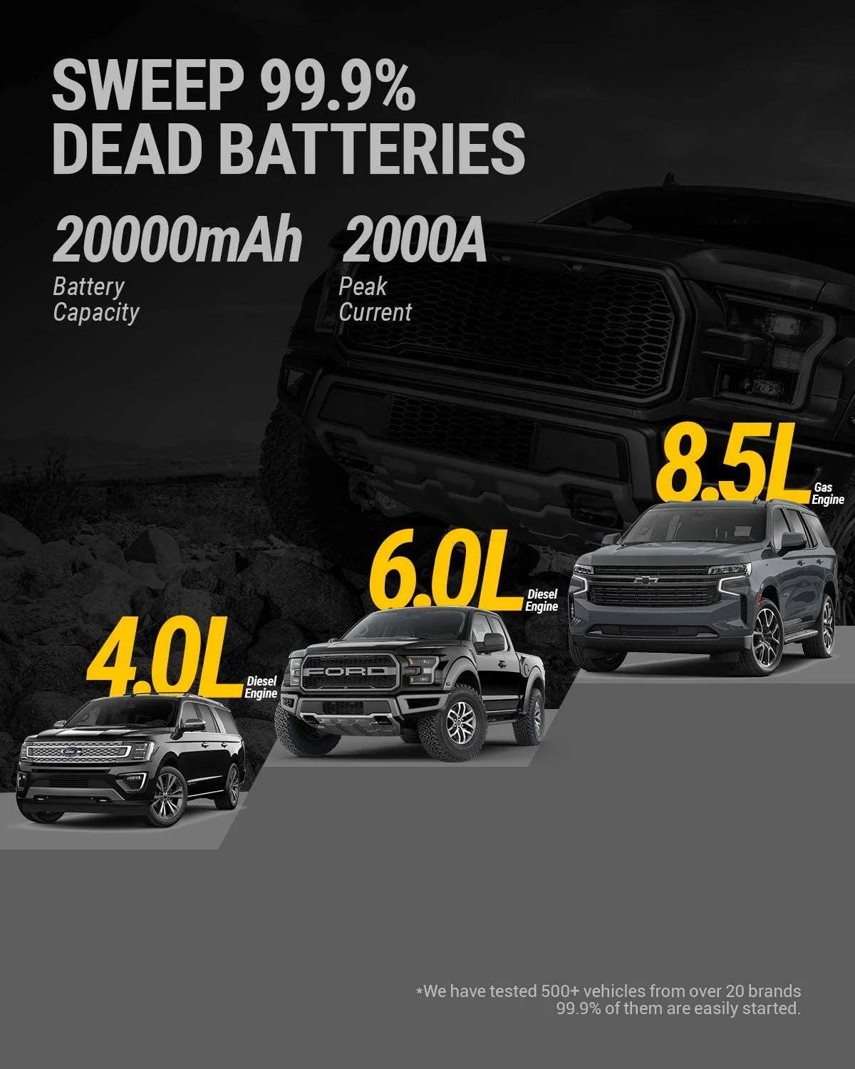 - Start Your Car: Deliver up to 2000 Amps peak amps to start vehicles with up to 8.5L Gas/6.0L Diesel engines. Up to jump-start 60 times with a single charge.