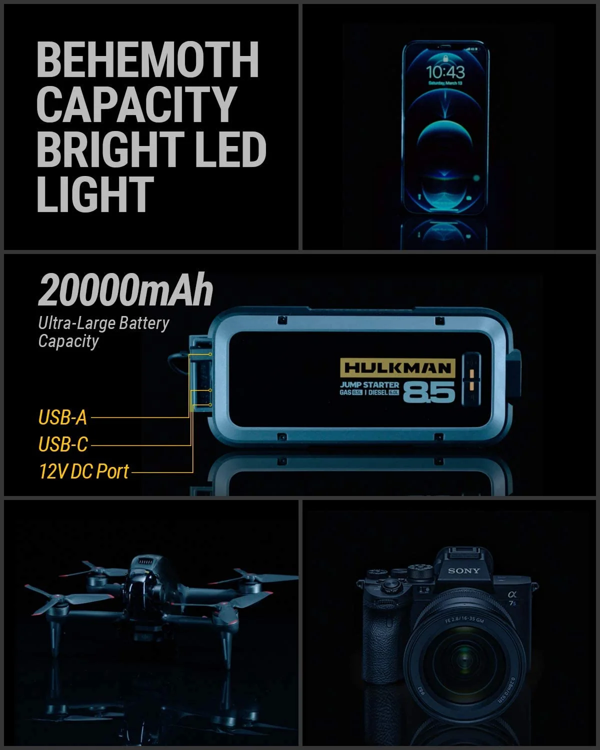 HULKMAN Alpha85s - 40F Start Tech Jump Starter 2000 Amp 20000mah Car Starter with 65W Speed Charge Lithium Portable Car Battery Booster Pack for up to 8.5 L Gas and 6 L Diesel Engines