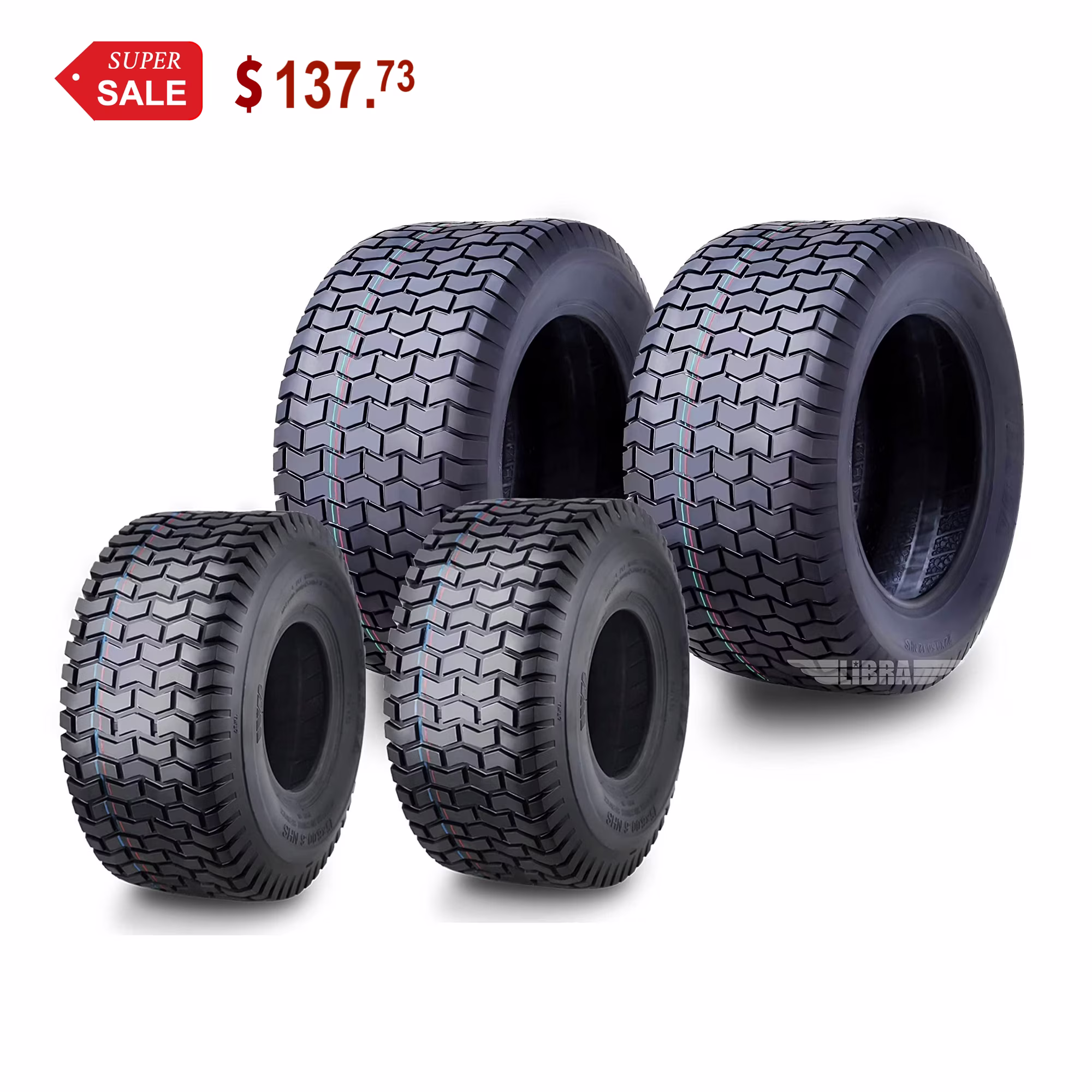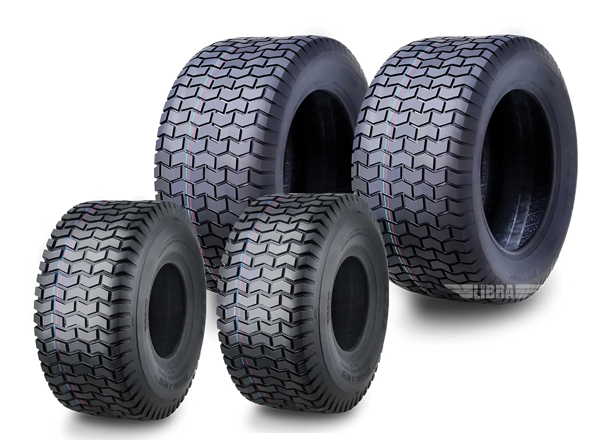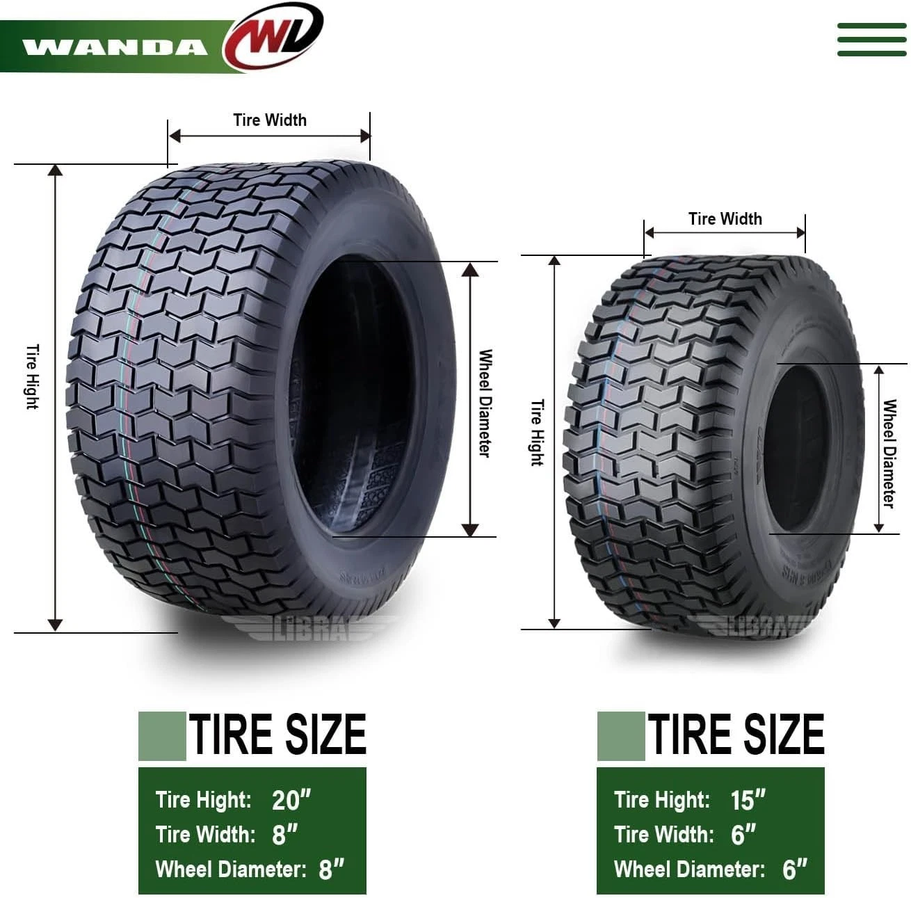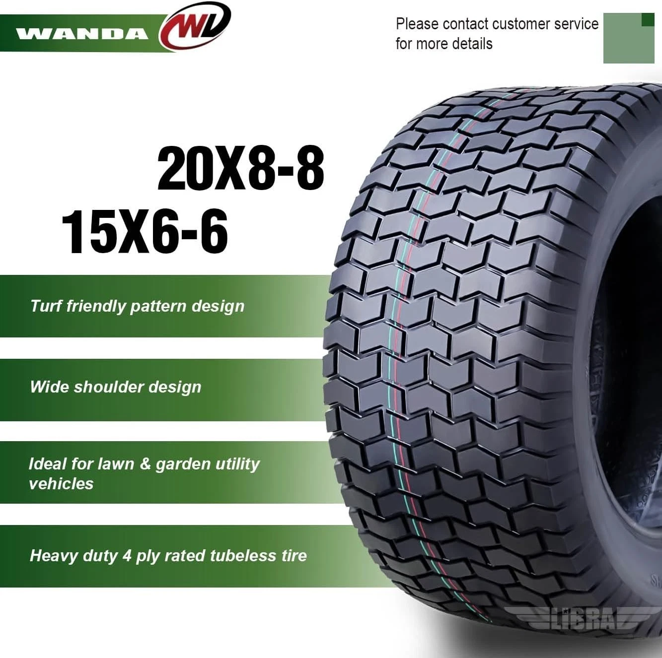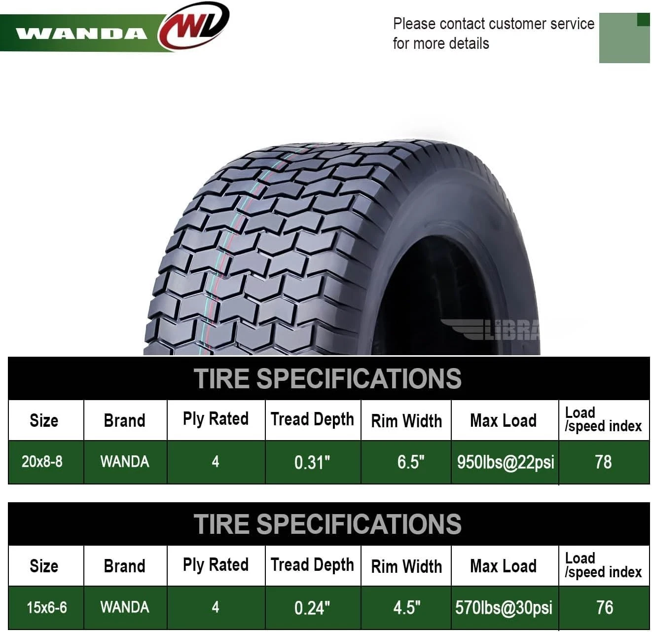Multipurpose turf friendly design for lawn & garden utility vehicles. Wide shoulders design for maximum traction and weight disbursement. Front Tire 15X6-6: Pattern:P512, Ply rated: 4, Tread depth: 0.18", Rim Width: 4.5", Max Load: 570lbs@30psi; Rear Tire 20X8-8: Pattern:P512, Ply rated:4, Tread depth:0.18", Rim width: 7", Max load: 965lbs@30psi. Heavy duty 4 ply tubeless tire, tires only, rims are not included. 30 year trusted WANDA brand