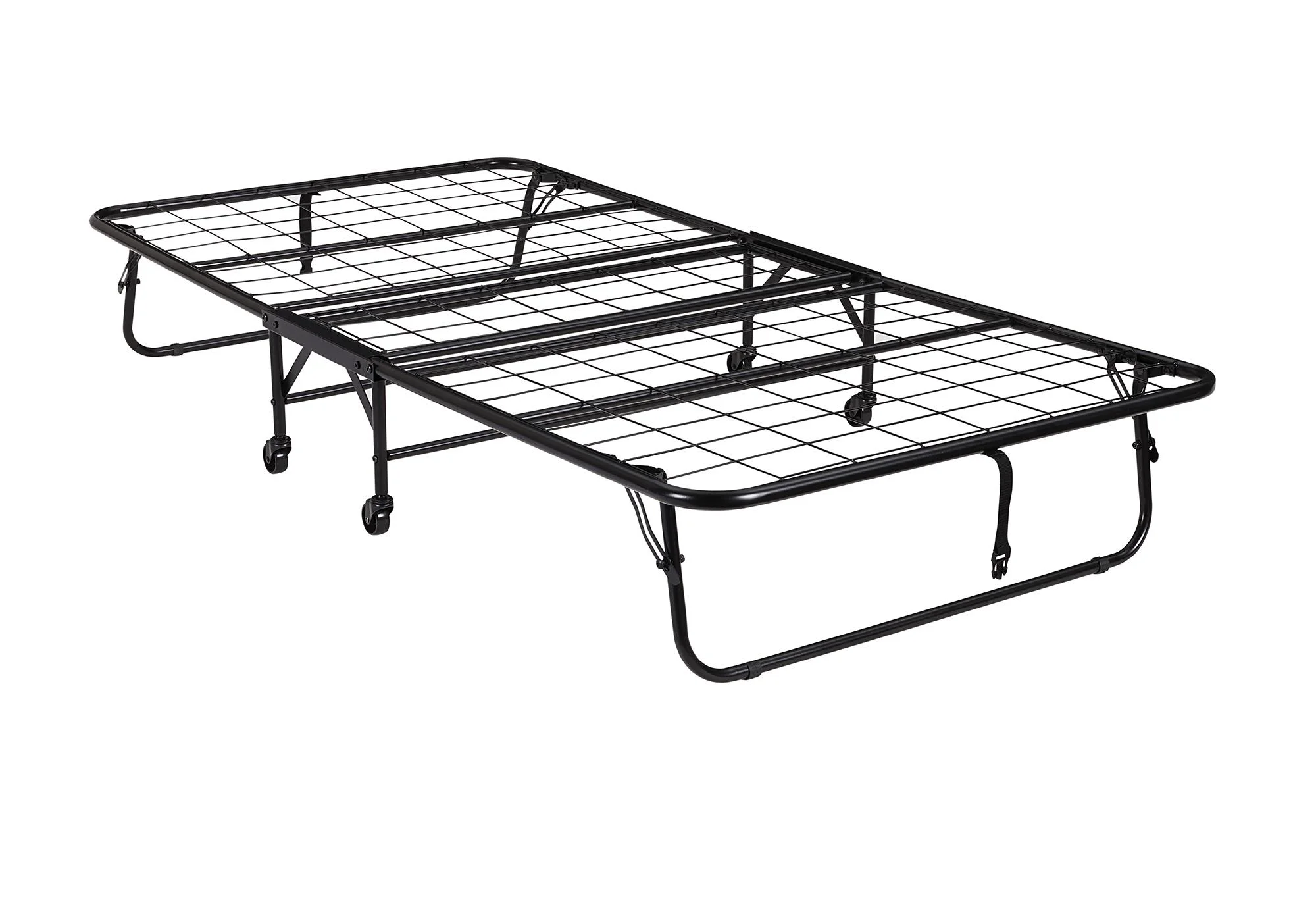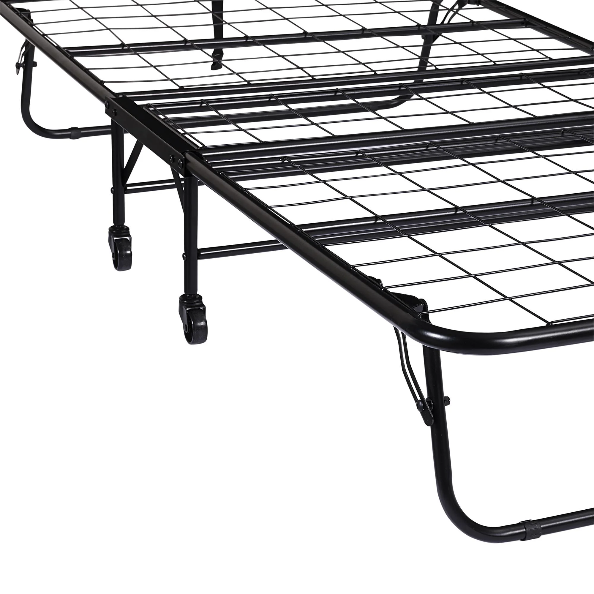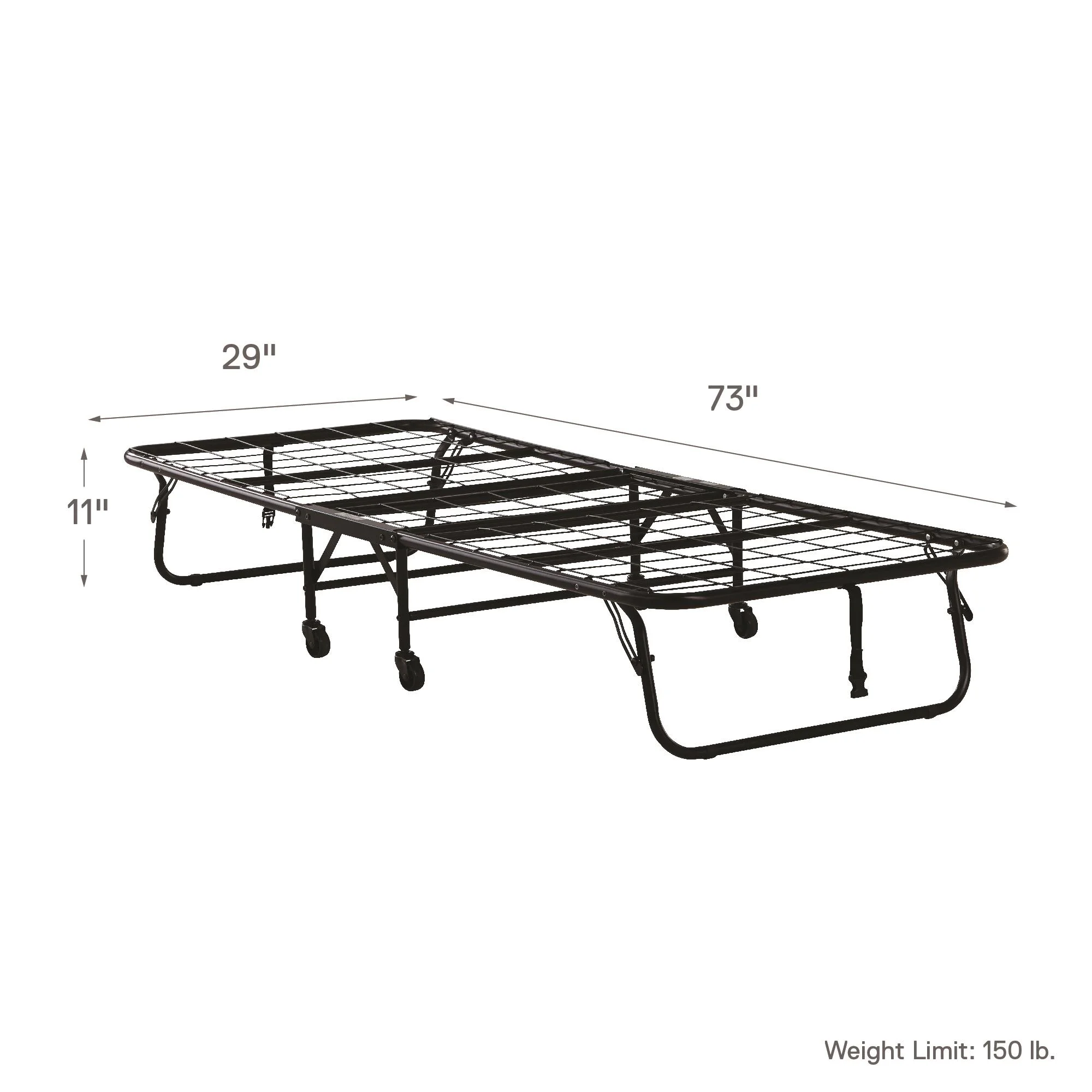 - Foldaway sturdy twin size metal frame neatly folds up and tucks away in closets when not in use. Metal mesh base for added comfort and durability. Convenient space-saving design fits in almost any room size.