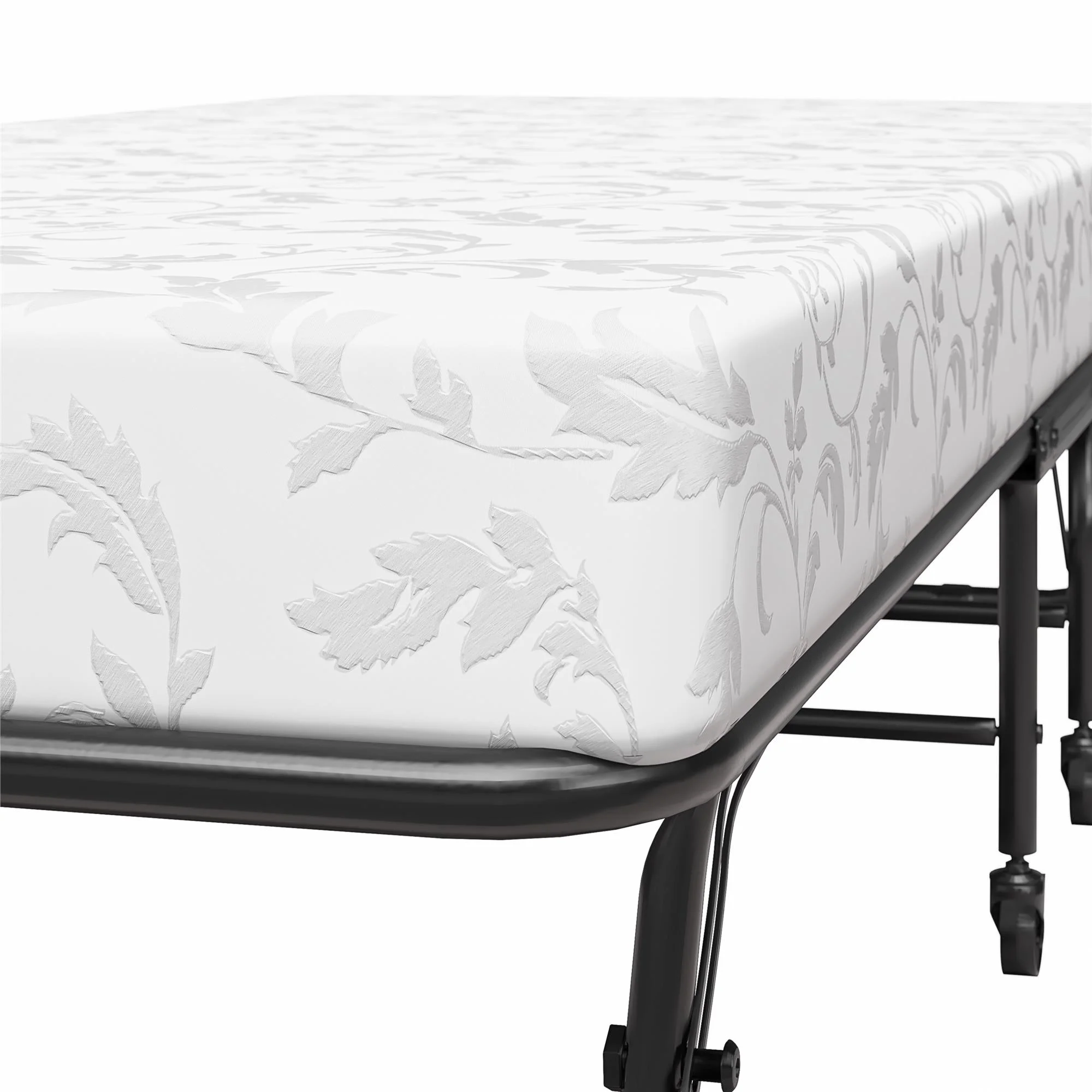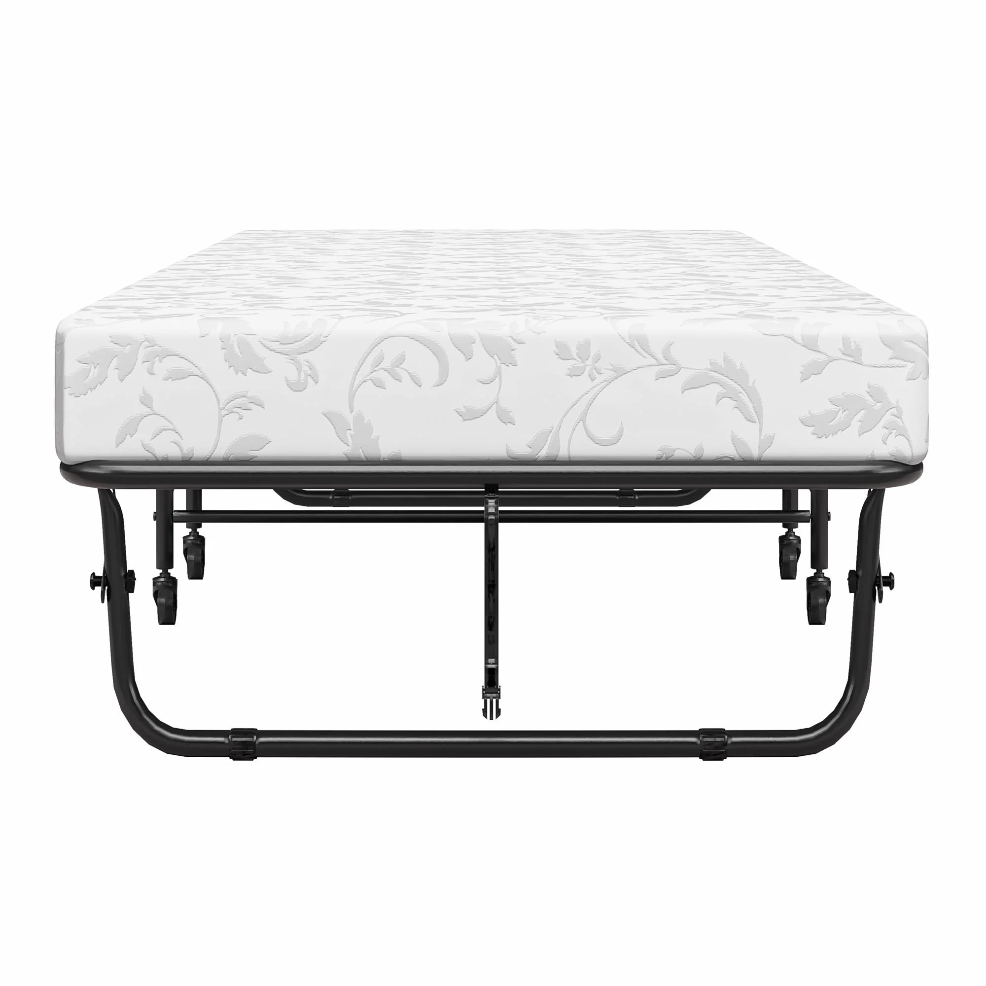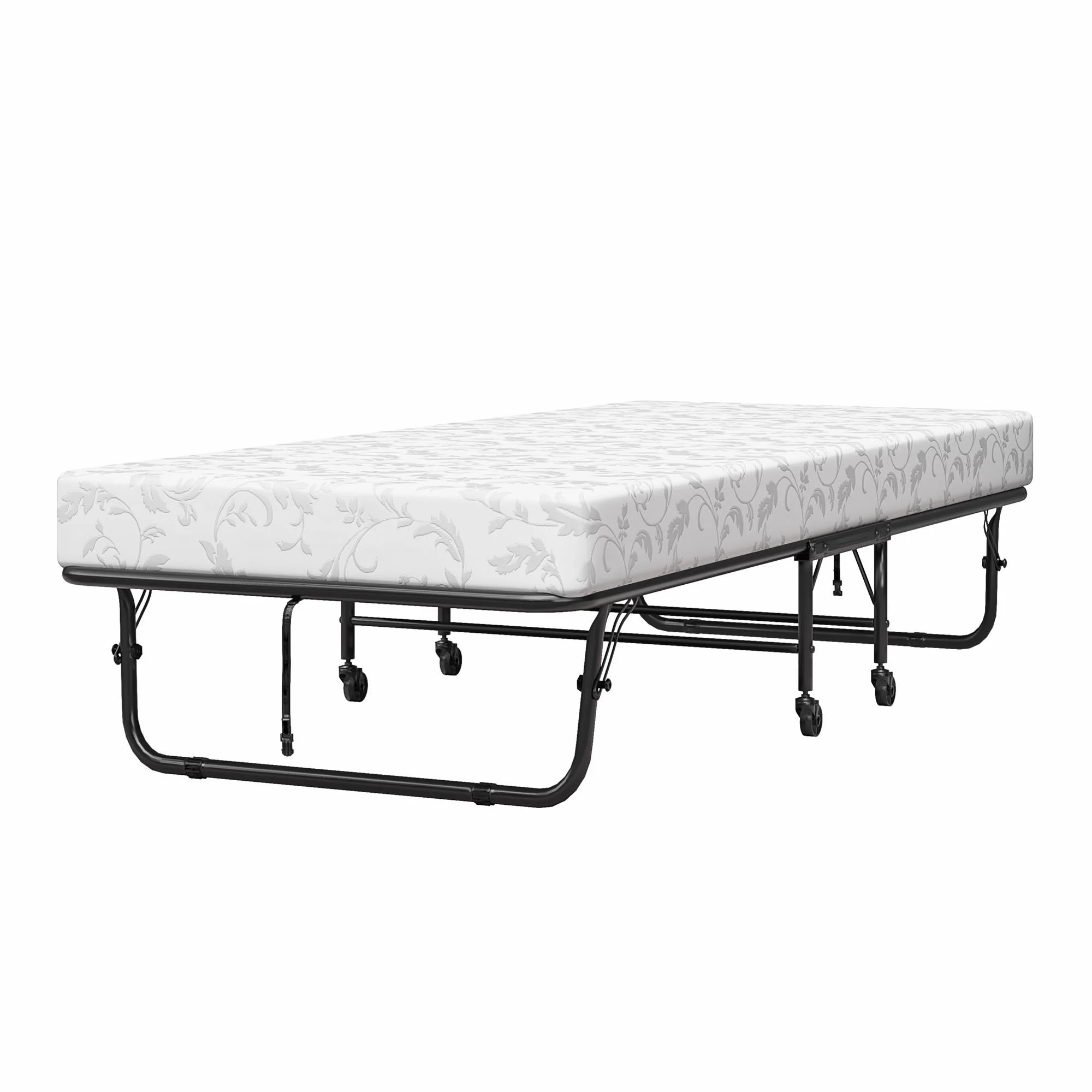 - Rollaway bed with 100% thermobonded high density polyester filled 5" mattress with floral cover design. 100% polyester cover. Cot mattress firmness level: medium support.