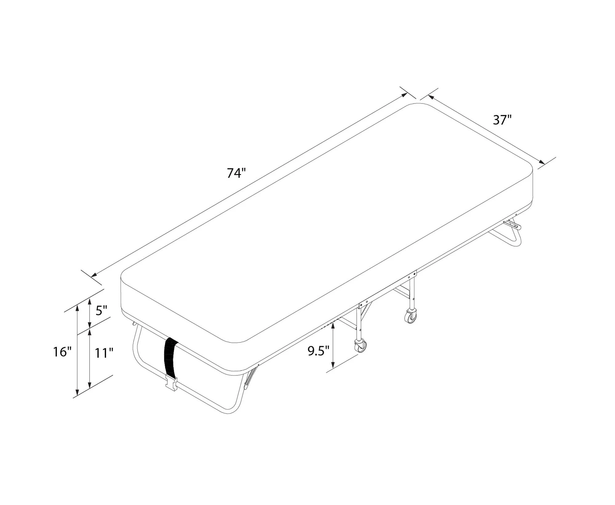 - Dimensions (open): 74"L x 37"W x 16"H. From floor to mattress: 9.5''. Dimensions (closed): 38.5"L x 14"W x 44.5"H. Weight limit: 225 lbs. Net weight: 32 lbs. Shipping dimensions: 39"L x 36"W x 12.5"H. Gross weight: 44 lbs.