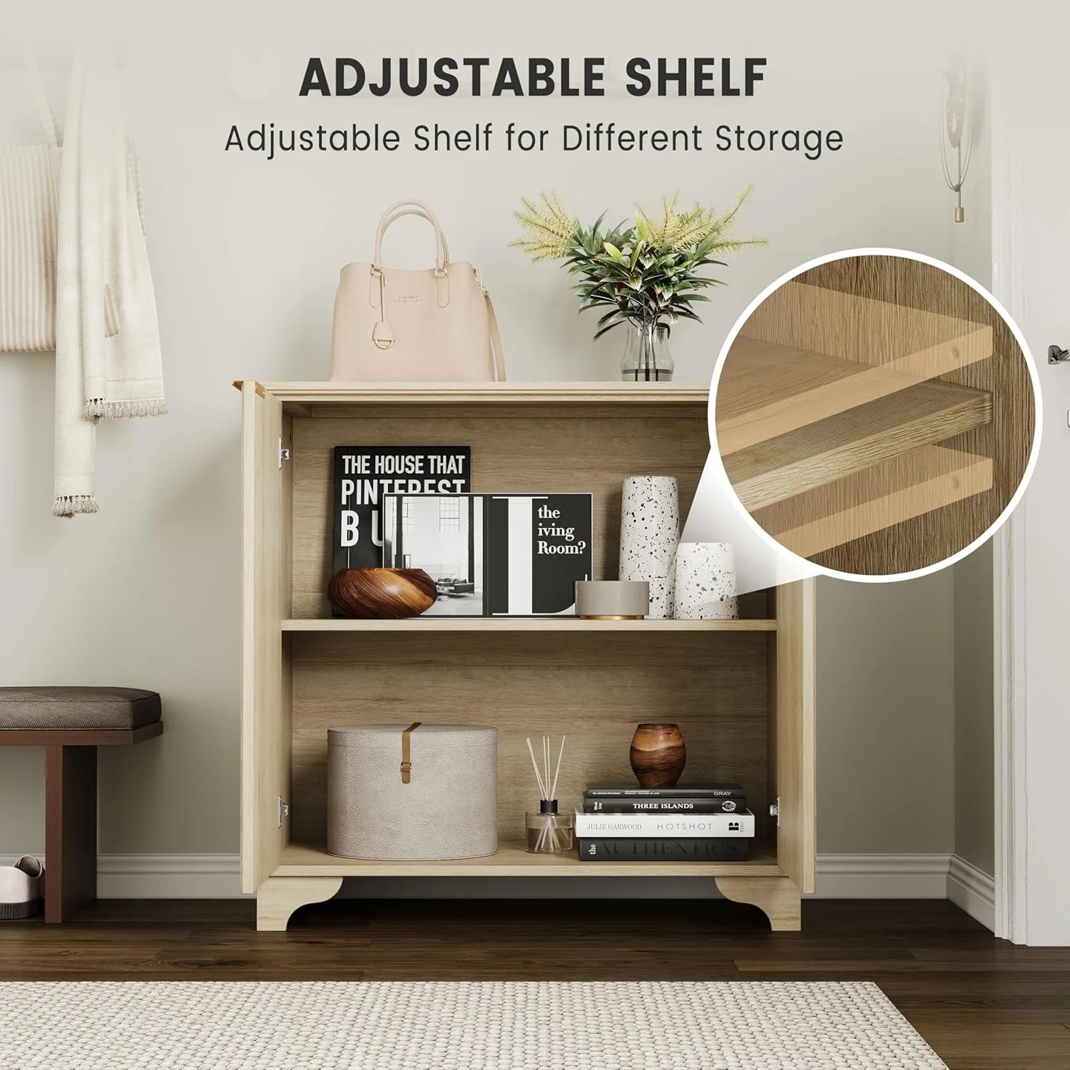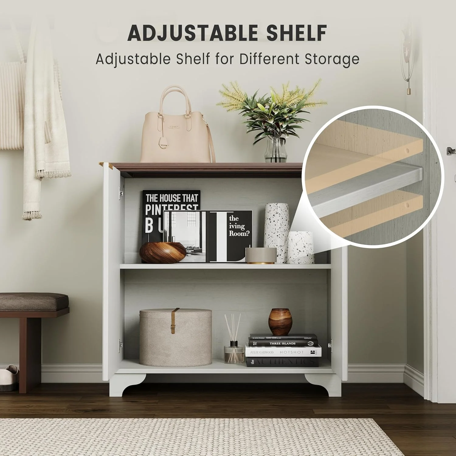 - 💯【Spacious Storage�? This storage cabinet boasts generous dimensions of 15.7" D x 31.5" W x 31.5" H, providing ample space for various items. The spacious top surface offers a convenient area to display or access your belongings, while two bottom cabinets each feature adjustable shelves, cleverly accommodating cups, extra dinnerware, and other essentials.