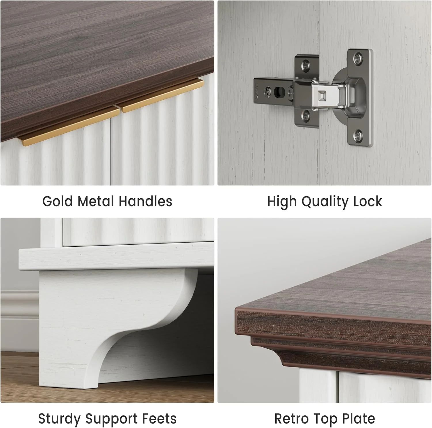 - 💯【Modern Farmhouse Charm�? Combining impressive fluted wood grain with a sleek white finish, this storage cabinet seamlessly blends farmhouse aesthetics with classic modern design. The gold metal handles add a touch of luxury, making it easy to integrate into various interior styles, from rustic cottages to contemporary and traditional decors.